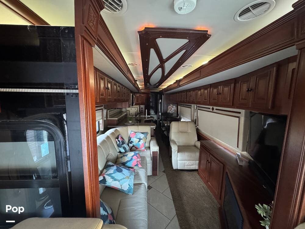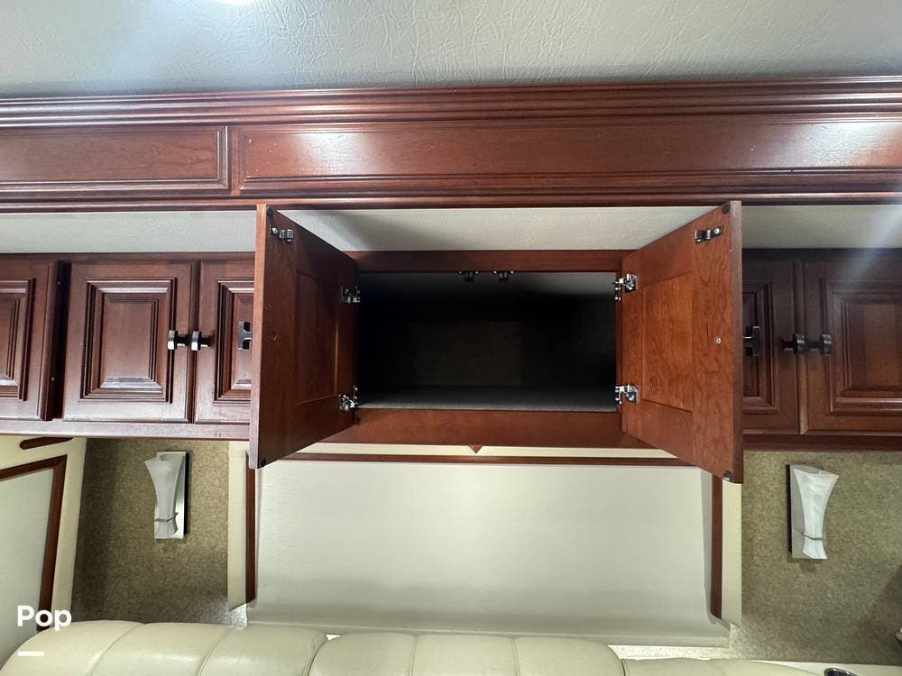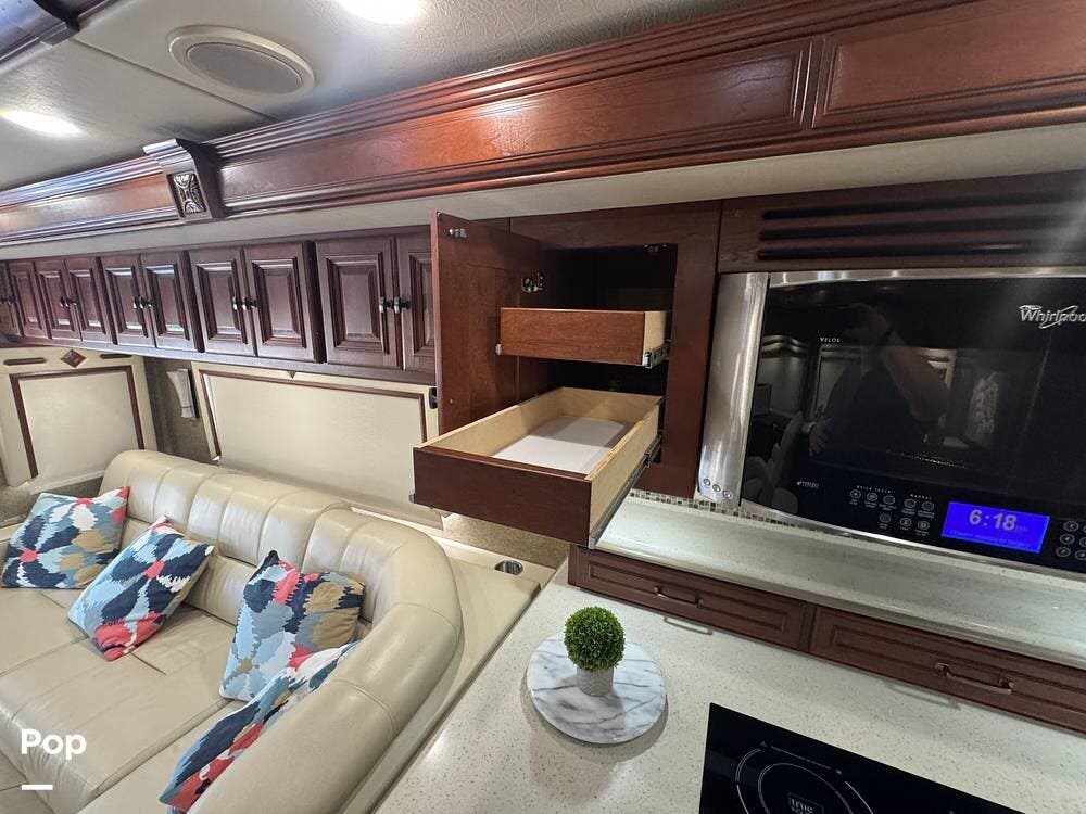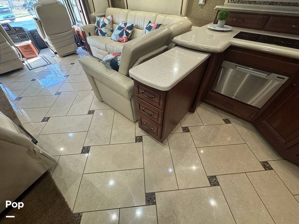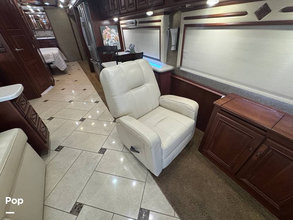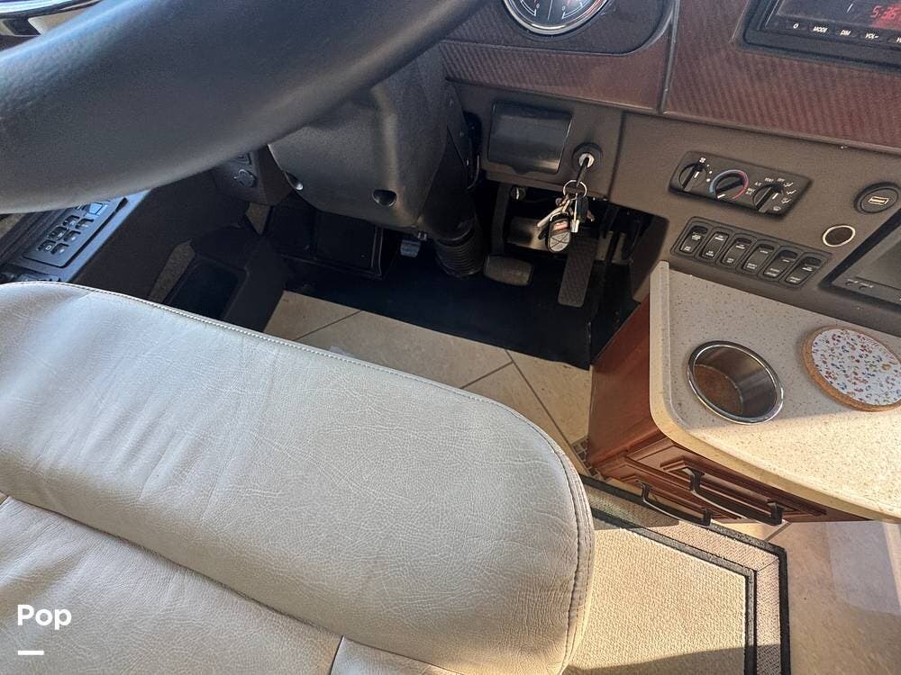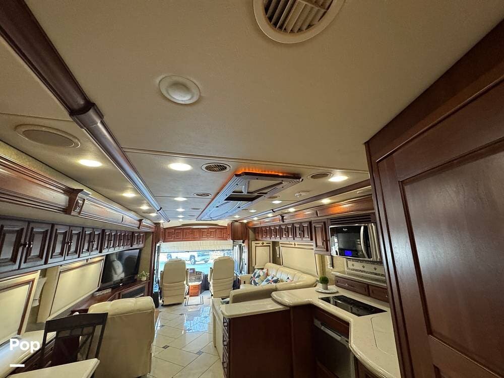 Inside, the living area is designed with comfort and usability in mind. A recliner sofa and theater seating offer relaxed seating options, complemented by a flat-screen TV and entertainment center positioned for easy viewing. Both the driver and passenger captain's chairs swivel, creating additional seating when parked. Large windows throughout the coach allow plenty of natural light, giving the interior an open, welcoming feel.