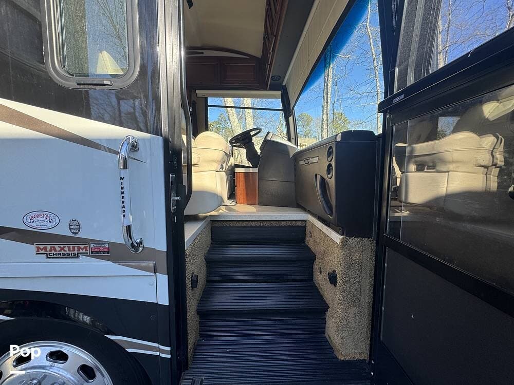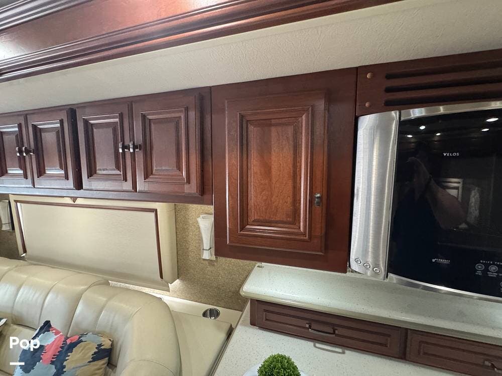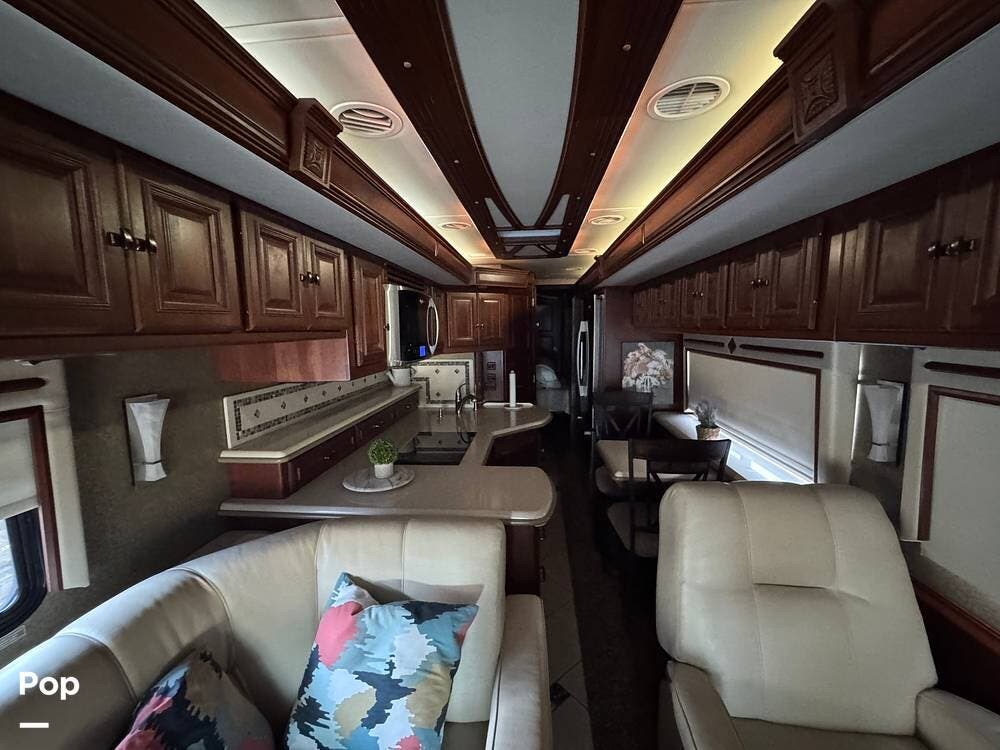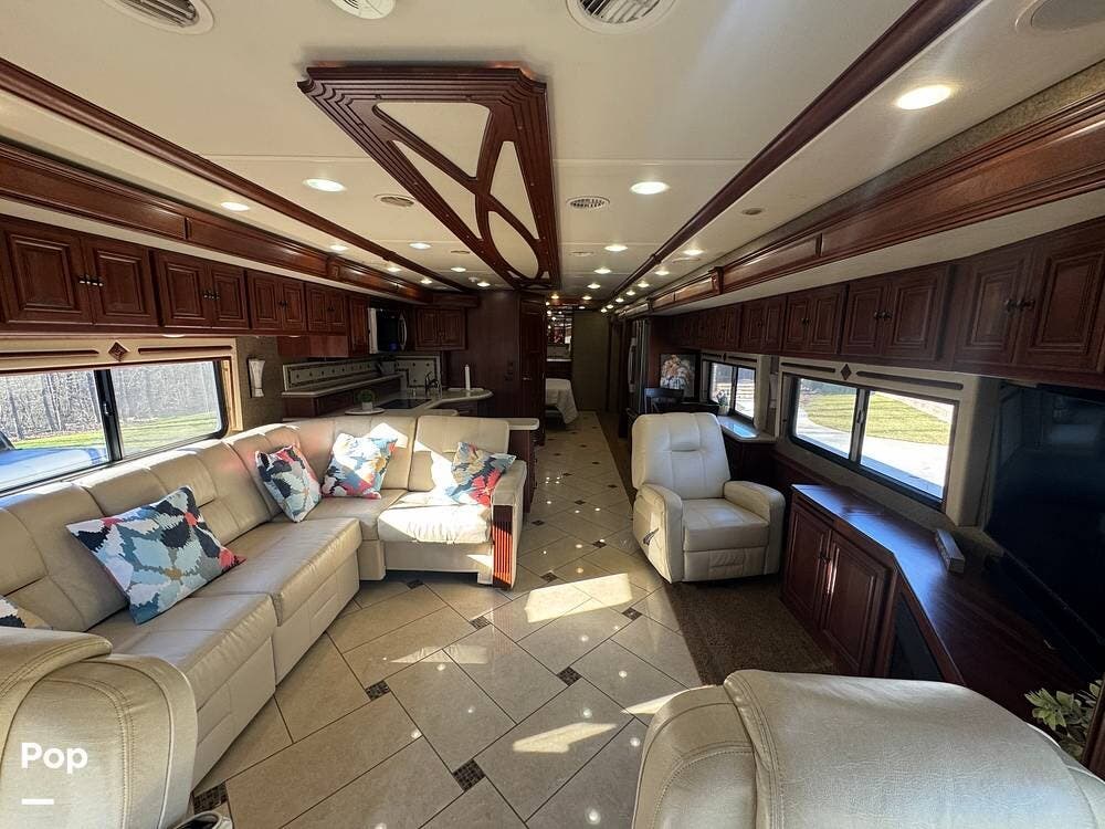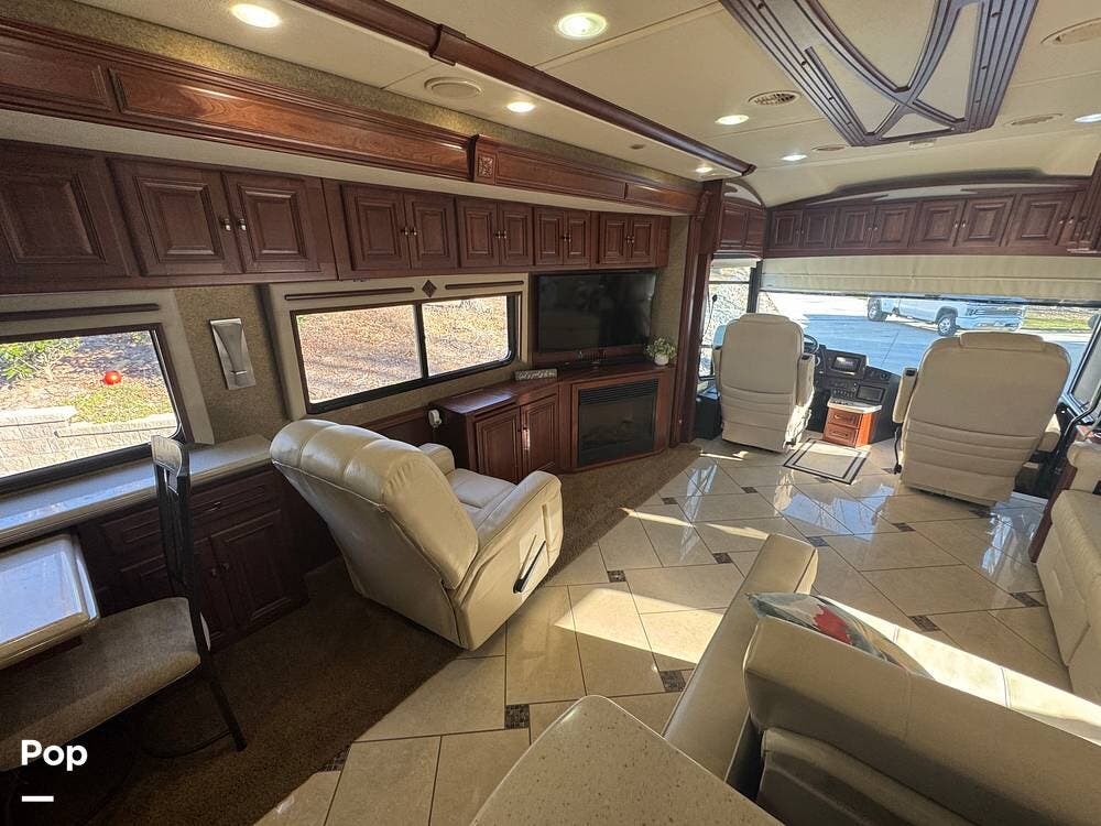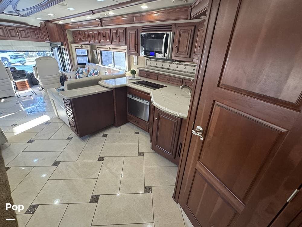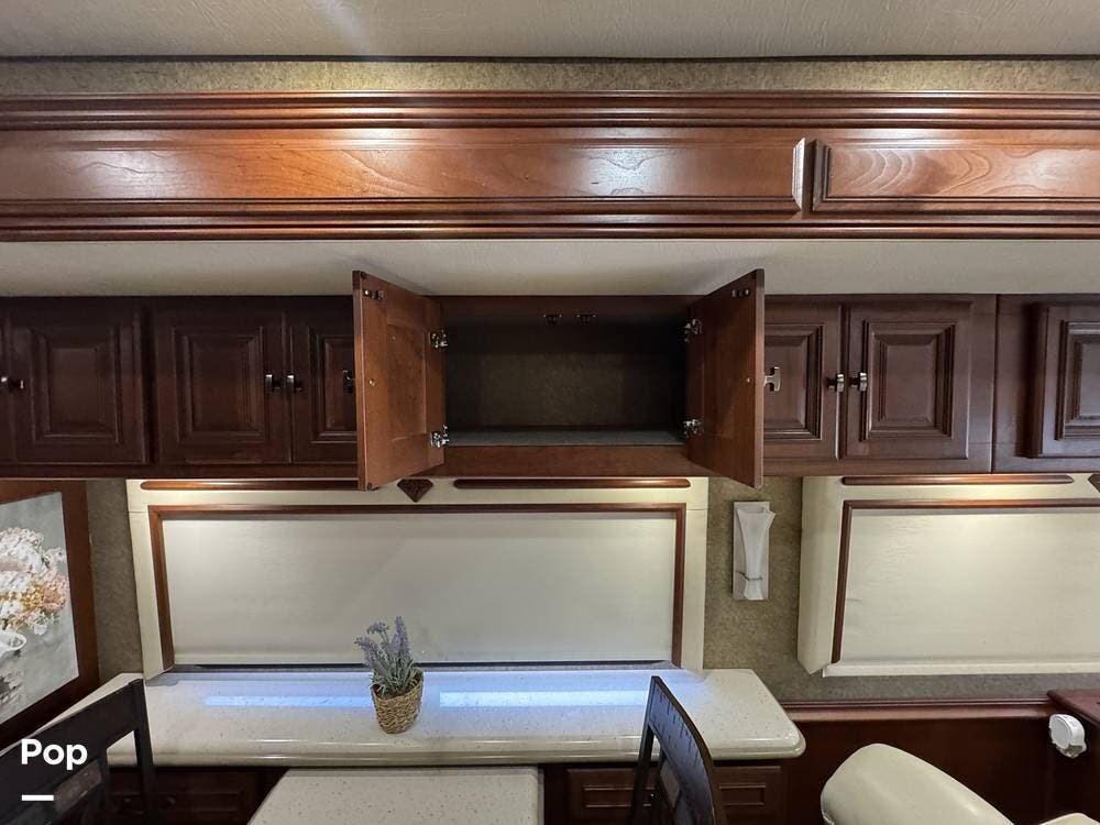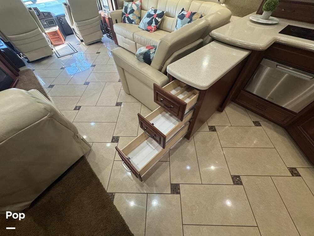 Inside, the living area is designed with comfort and usability in mind. A recliner sofa and theater seating offer relaxed seating options, complemented by a flat-screen TV and entertainment center positioned for easy viewing. Both the driver and passenger captain's chairs swivel, creating additional seating when parked. Large windows throughout the coach allow plenty of natural light, giving the interior an open, welcoming feel.