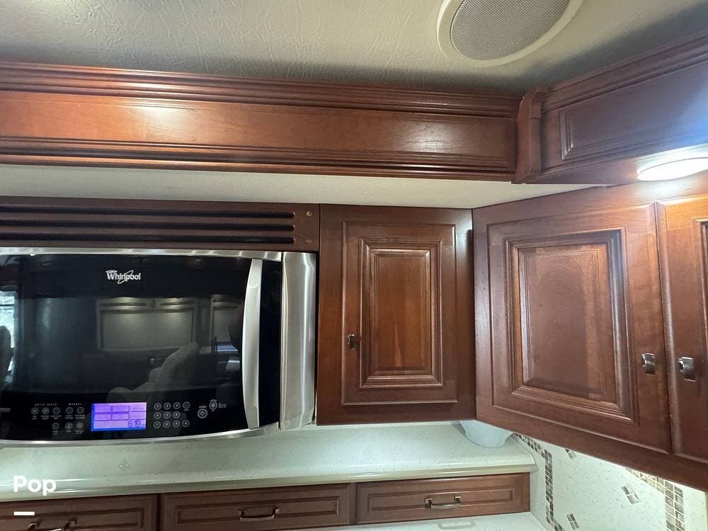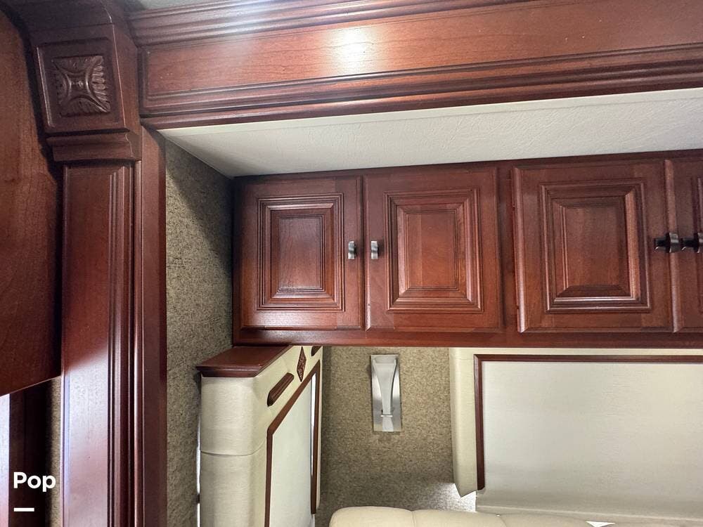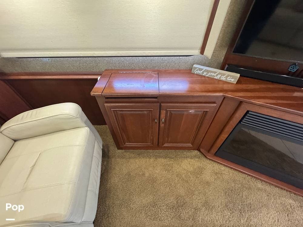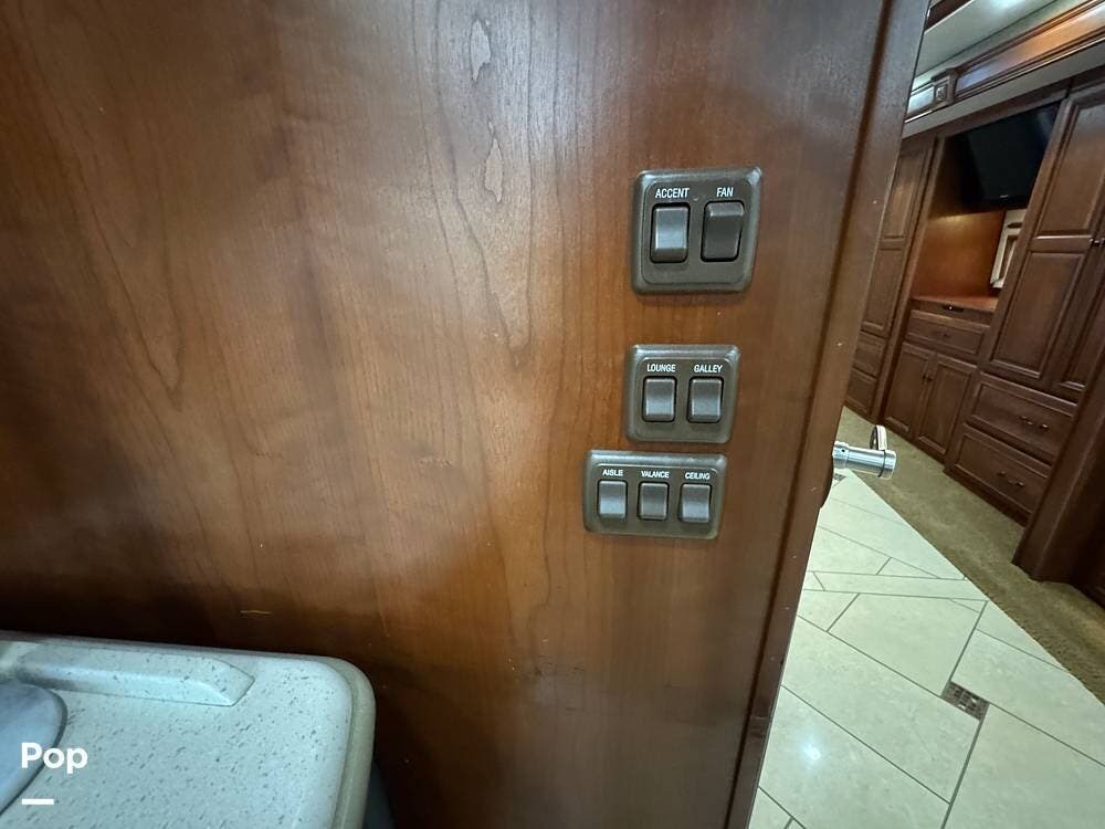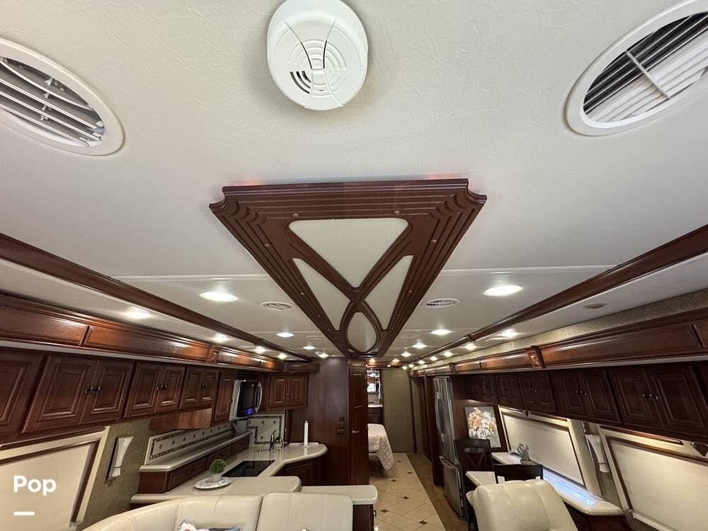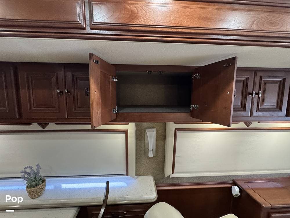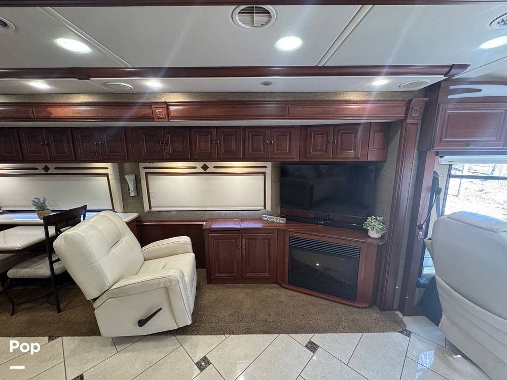 Inside, the living area is designed with comfort and usability in mind. A recliner sofa and theater seating offer relaxed seating options, complemented by a flat-screen TV and entertainment center positioned for easy viewing. Both the driver and passenger captain's chairs swivel, creating additional seating when parked. Large windows throughout the coach allow plenty of natural light, giving the interior an open, welcoming feel.