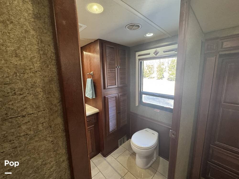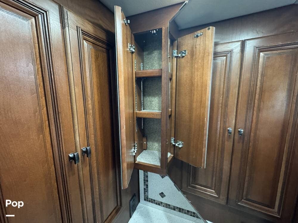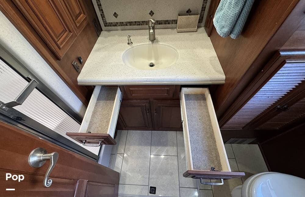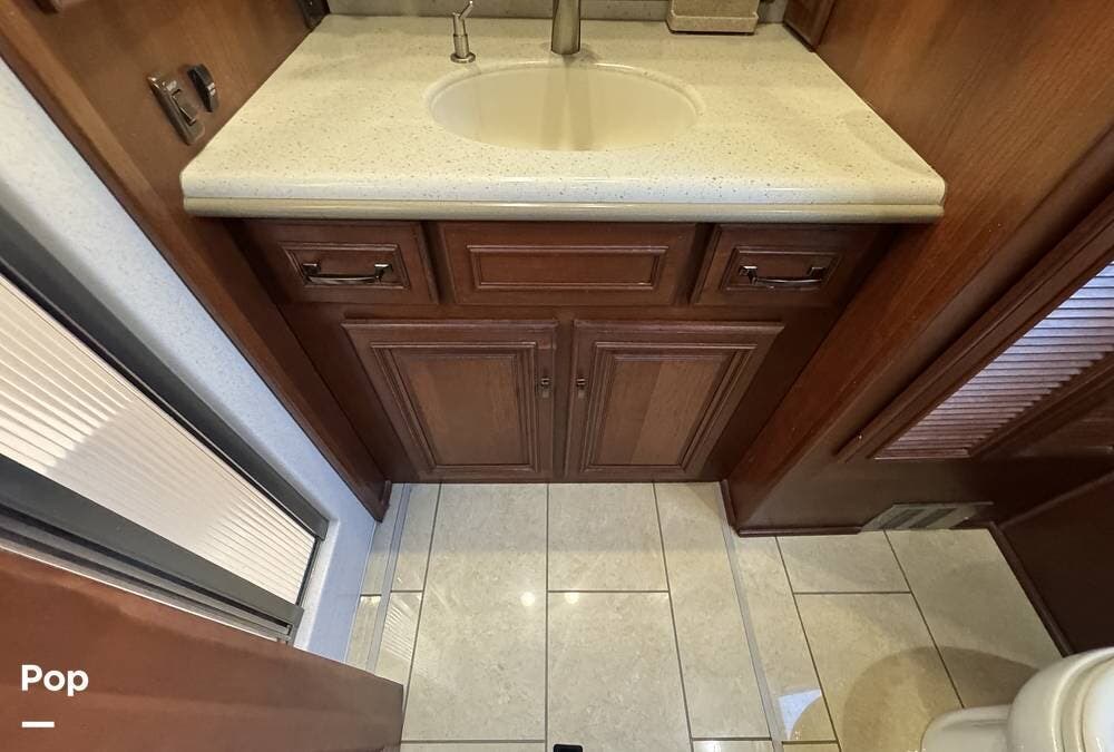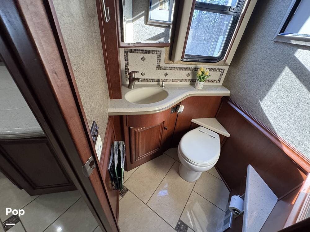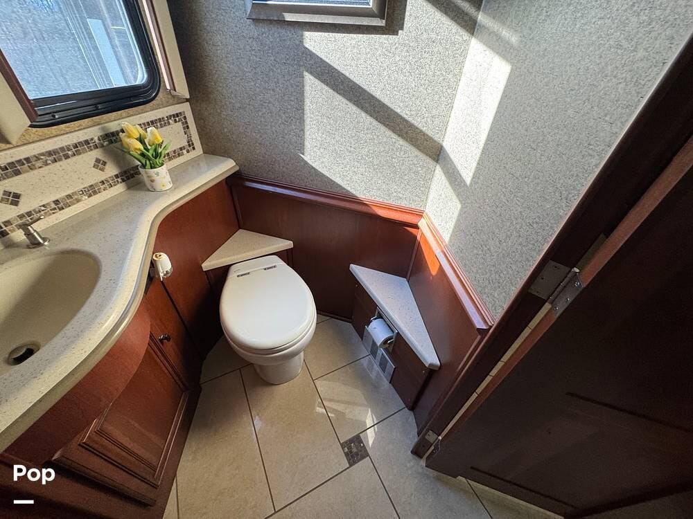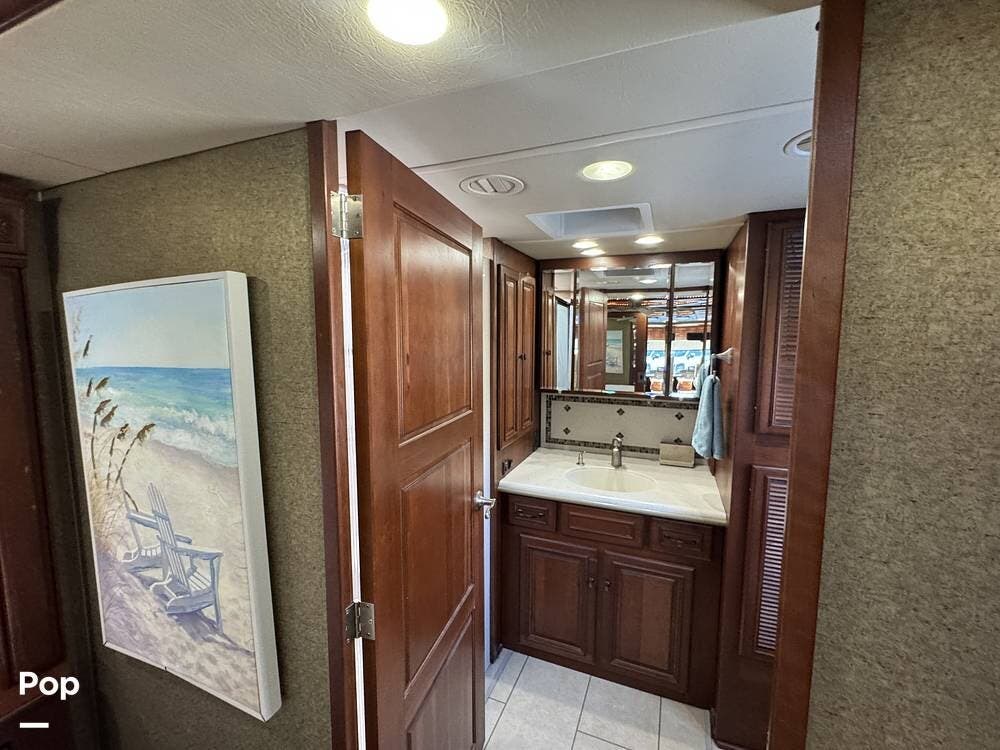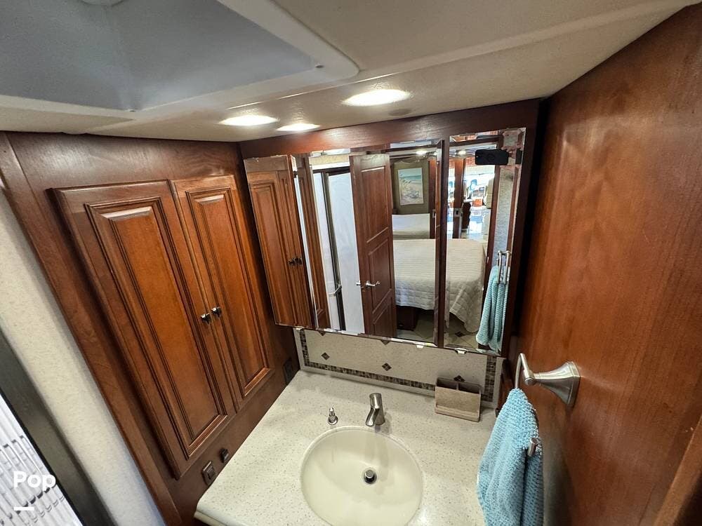 This coach is equipped with a bath-and-a-half layout, offering excellent functionality for couples or guests. The full bathroom includes a shower, vanity with sink, and toilet, while the half bath in the hallway adds convenience for visitors. Both bathrooms feature quality finishes and thoughtful storage solutions.