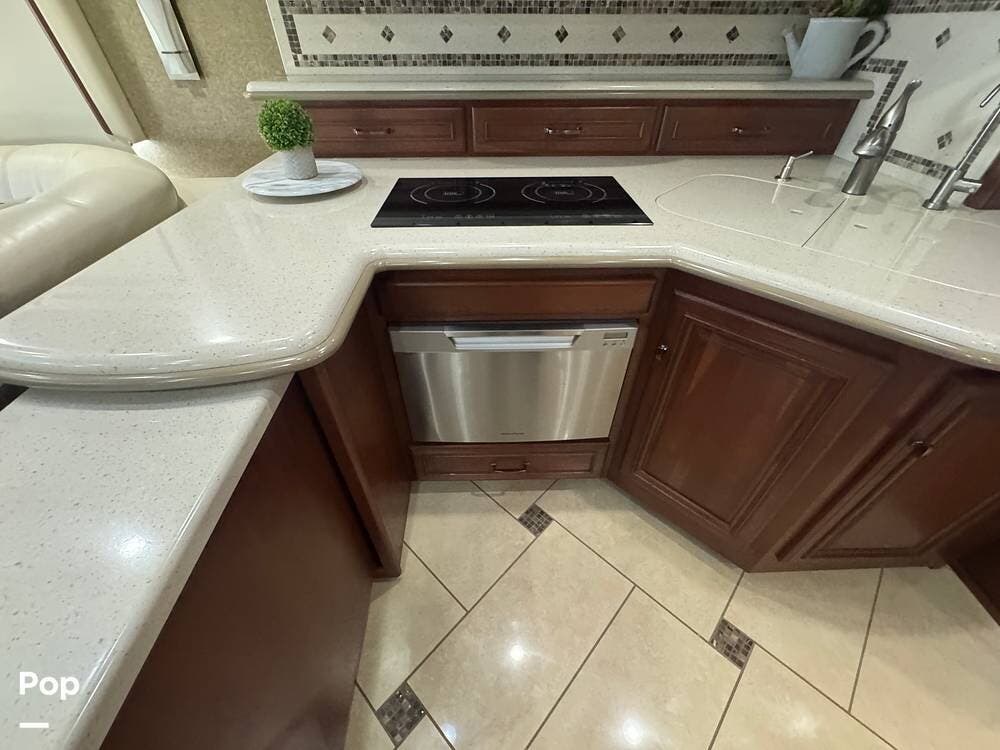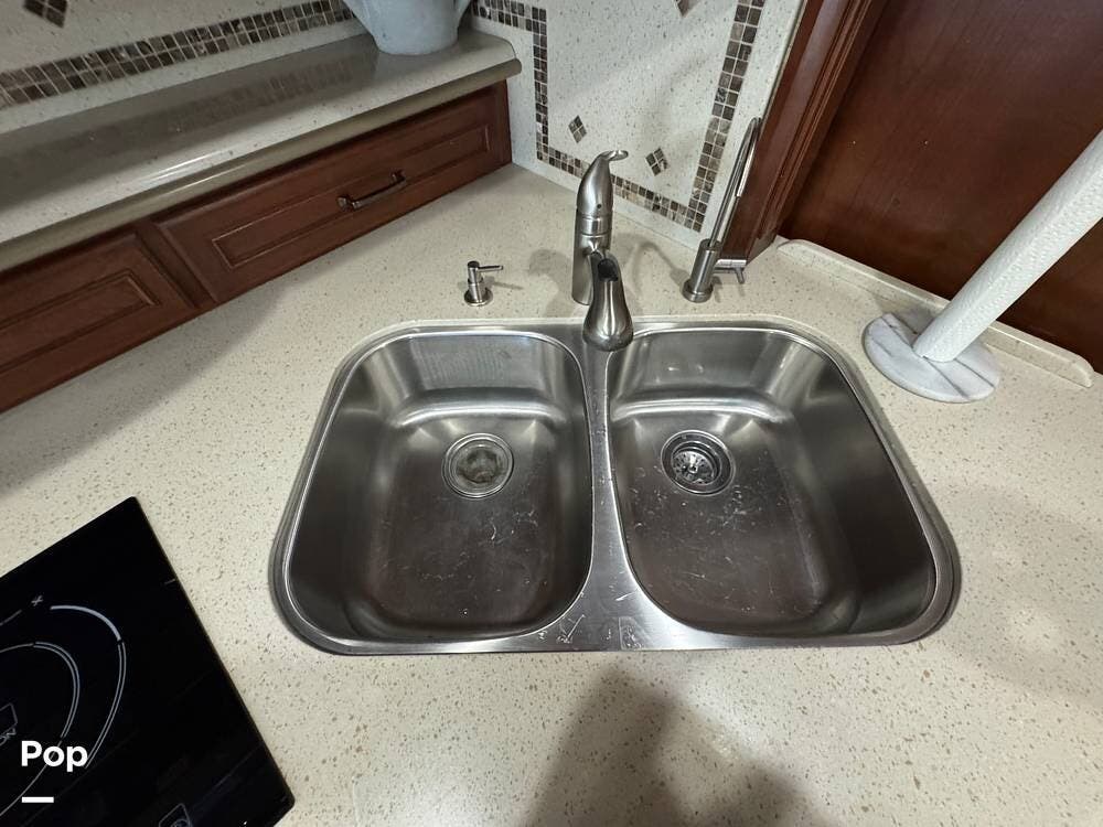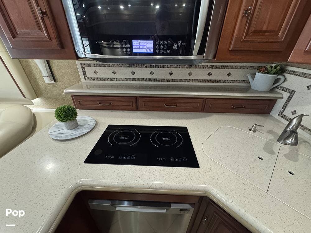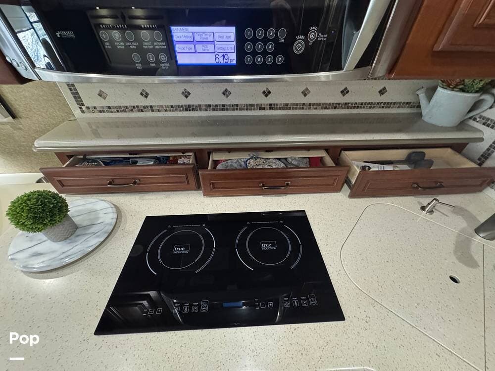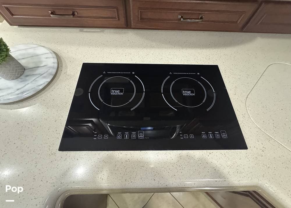 The fully electric kitchen is laid out for modern convenience and extended travel. It includes a two-burner induction cooktop, convection/microwave combo, residential refrigerator, and solid-surface countertops. A double-basin sink and ample overhead cabinetry provide practical workspace and storage, whether you're on a weekend getaway or a longer journey.