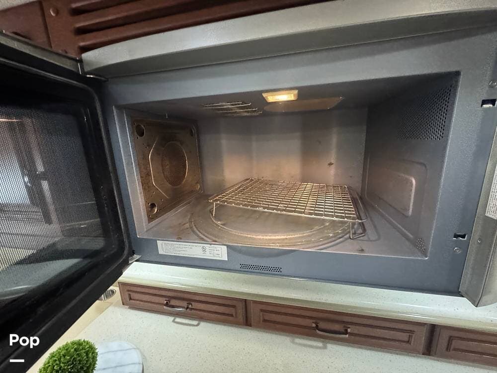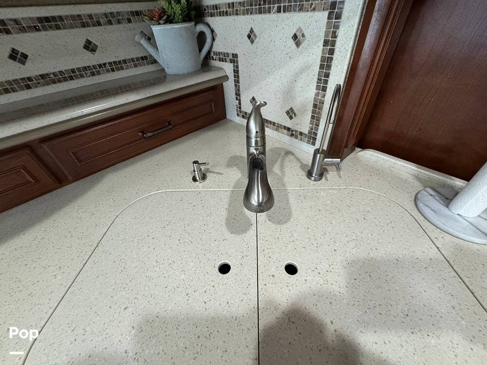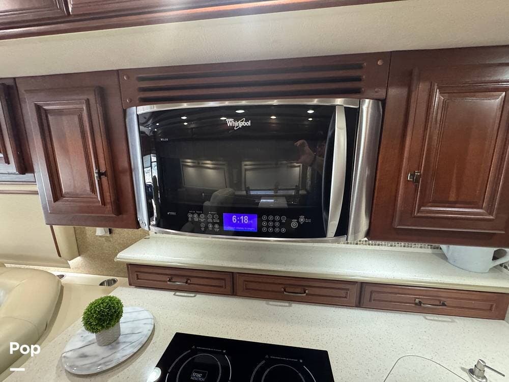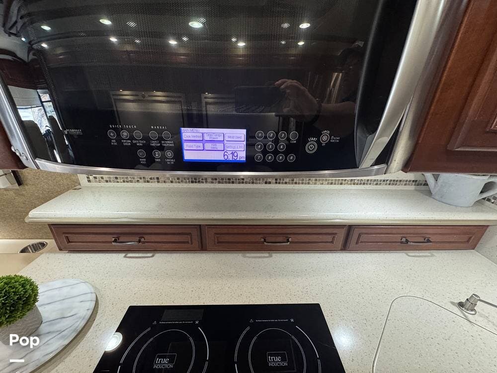 The fully electric kitchen is laid out for modern convenience and extended travel. It includes a two-burner induction cooktop, convection/microwave combo, residential refrigerator, and solid-surface countertops. A double-basin sink and ample overhead cabinetry provide practical workspace and storage, whether you're on a weekend getaway or a longer journey.