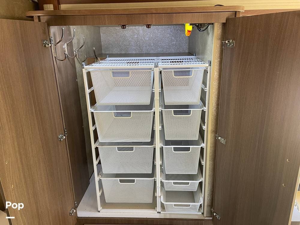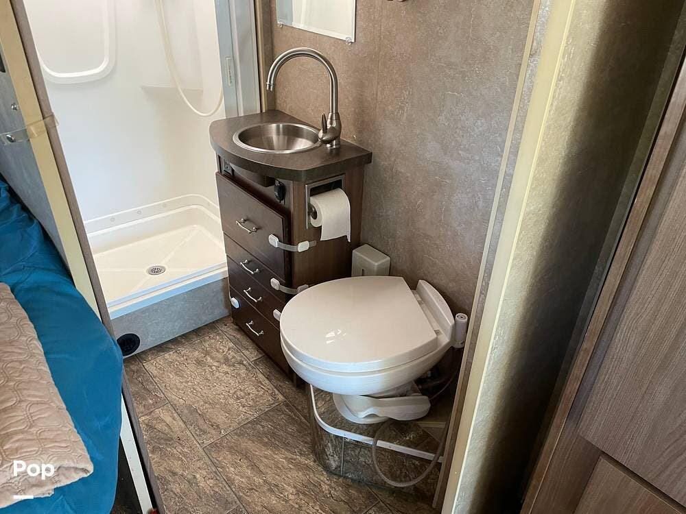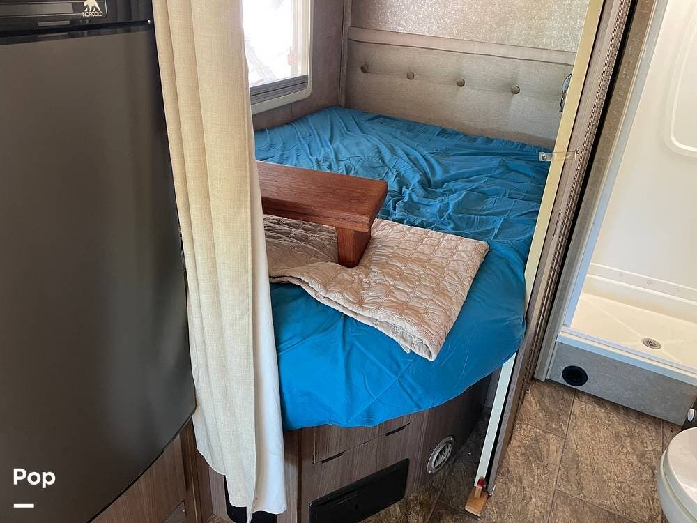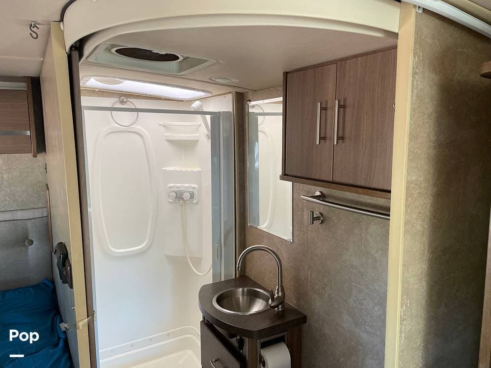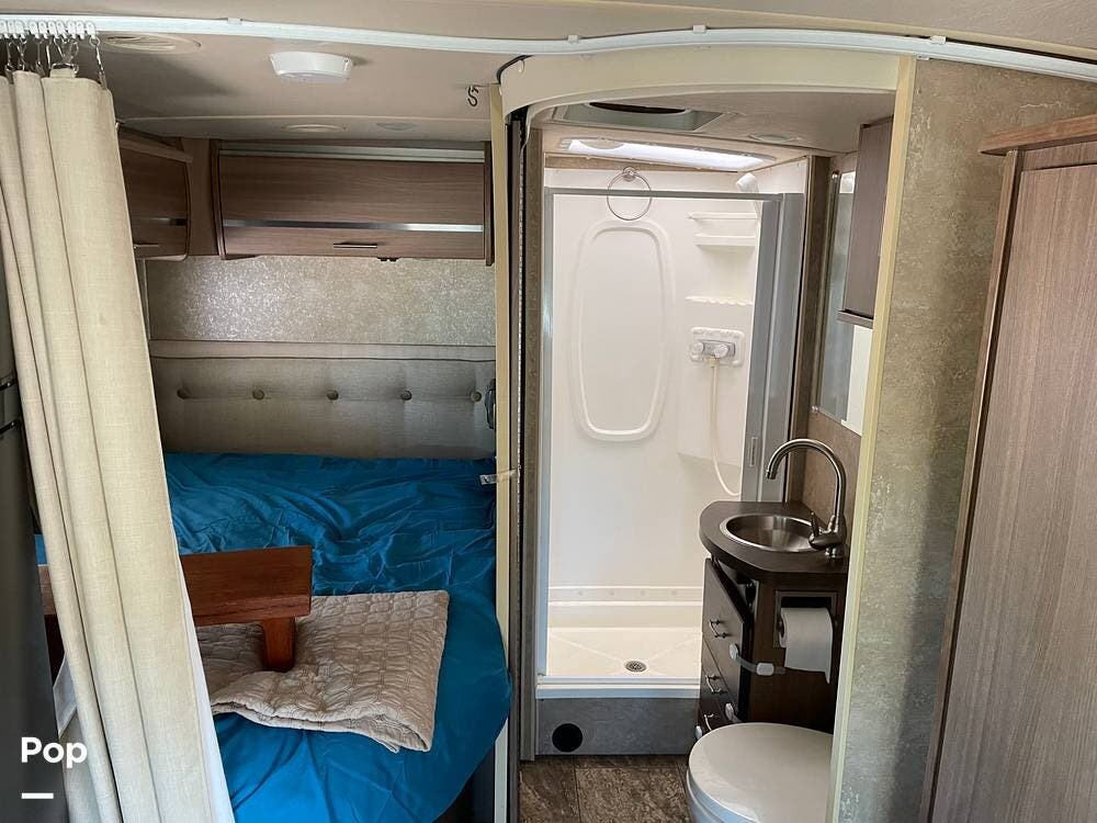 Walking back, you will find a larger dresser/storage (shown in photos). The bedroom has privacy curtains and a TV with overhead cabinets. There is a full bathroom with sink, toilet, and shower (with privacy curtains)