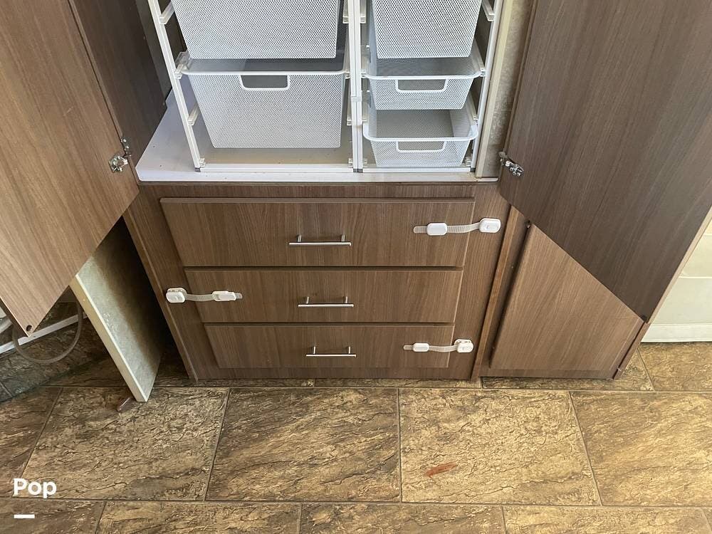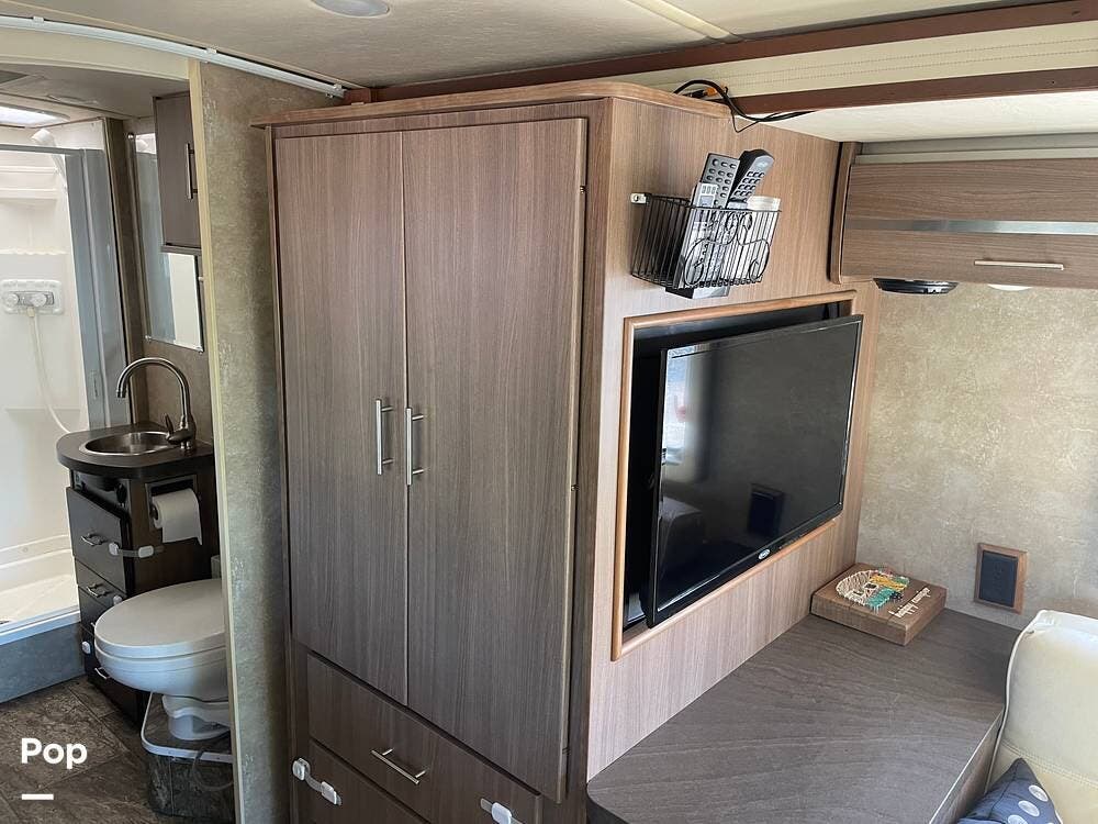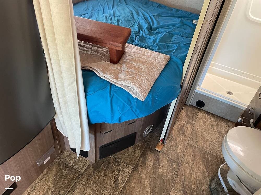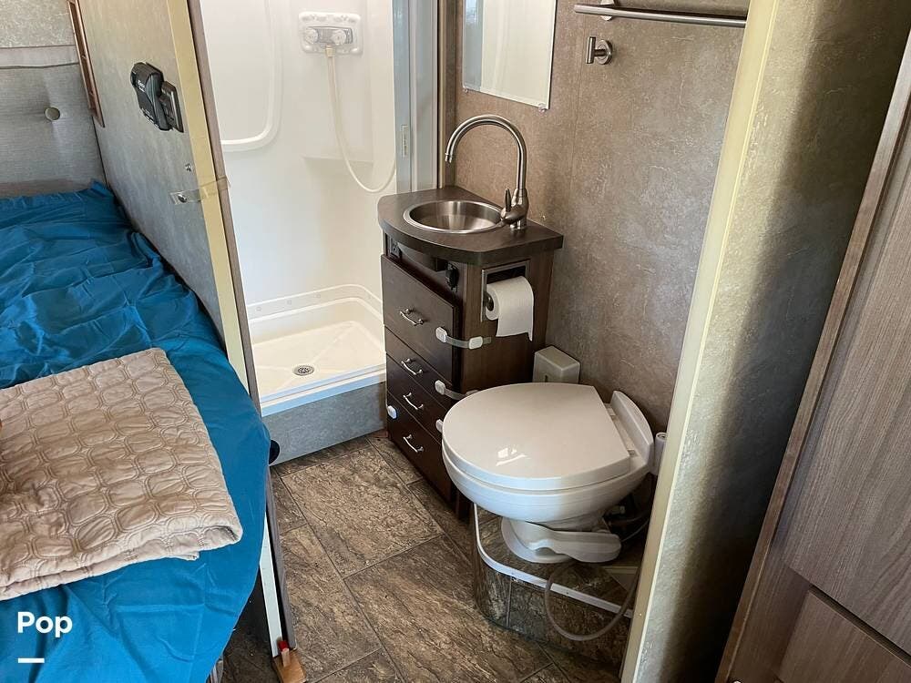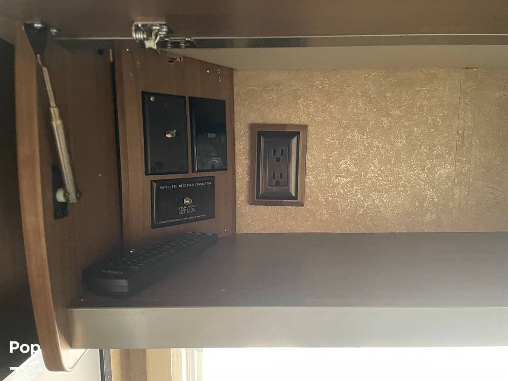 Walking back, you will find a larger dresser/storage (shown in photos). The bedroom has privacy curtains and a TV with overhead cabinets. There is a full bathroom with sink, toilet, and shower (with privacy curtains)