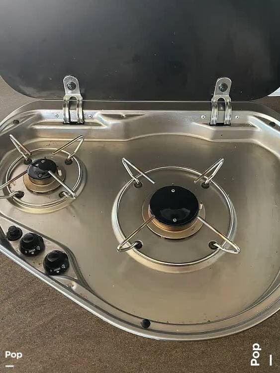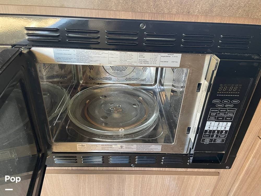 Across is the galley with a stovetop, microwave, sink, fridge, and freezer, along with plenty of cabinets/drawers and ample counter space.