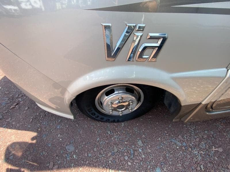 Winnebago Via Class A Diesel Coach w/Double Slideouts, Rear Queen Bed Slide, 22" LCD TV/Storage, Wardrobe, Bath w/Corner Shower, Toilet & Sink, Round Kitchen Sink, 2 Burner Cooktop, Refrigerator, Comfort Sofa Sleeper Slideout w/Movable Pedestal Table, 26" TV in Living Area and More!