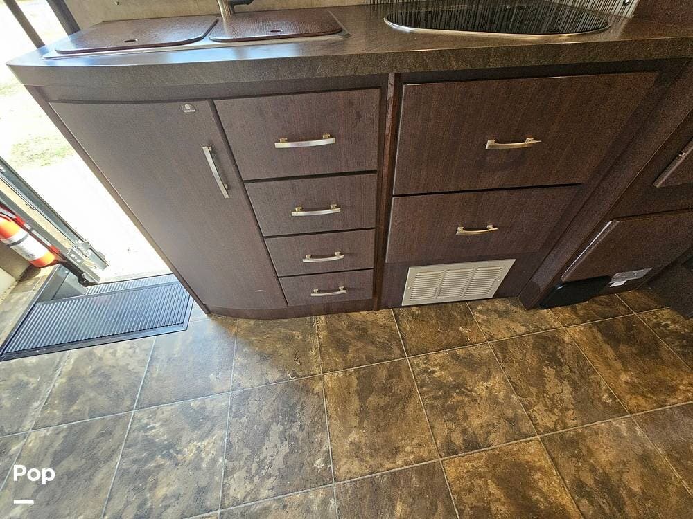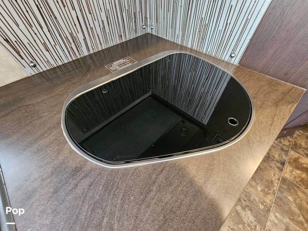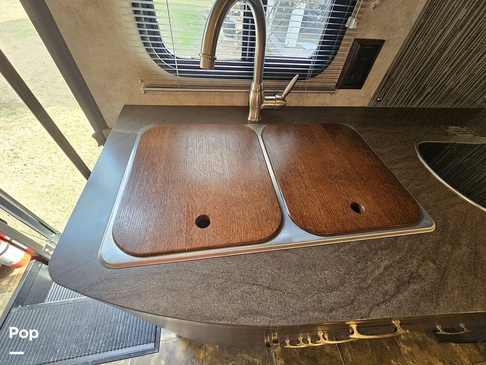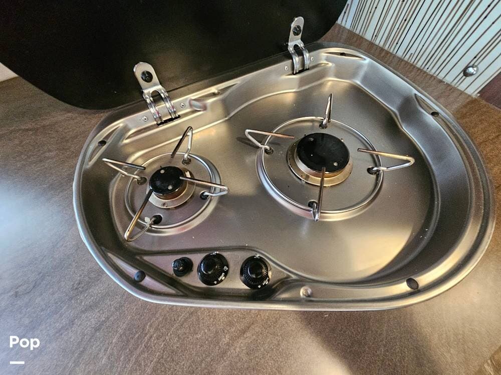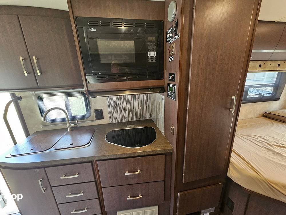 The galley is well laid out with a 2-burner cooktop, convection microwave, refrigerator, and a double kitchen sink.
