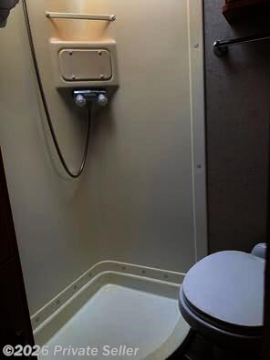 The back slide out features a walk around queen sized bed with a TV with remote. The windows have both solar and blackout shades and the side windows have screens. There is a nice sized wardobe closet with a light and drawer next to the bed area. The bath has a toilet, shower and stainless-steel sink with a mirror, 2 cabinets and 3 doors for linen, towels and supplies.