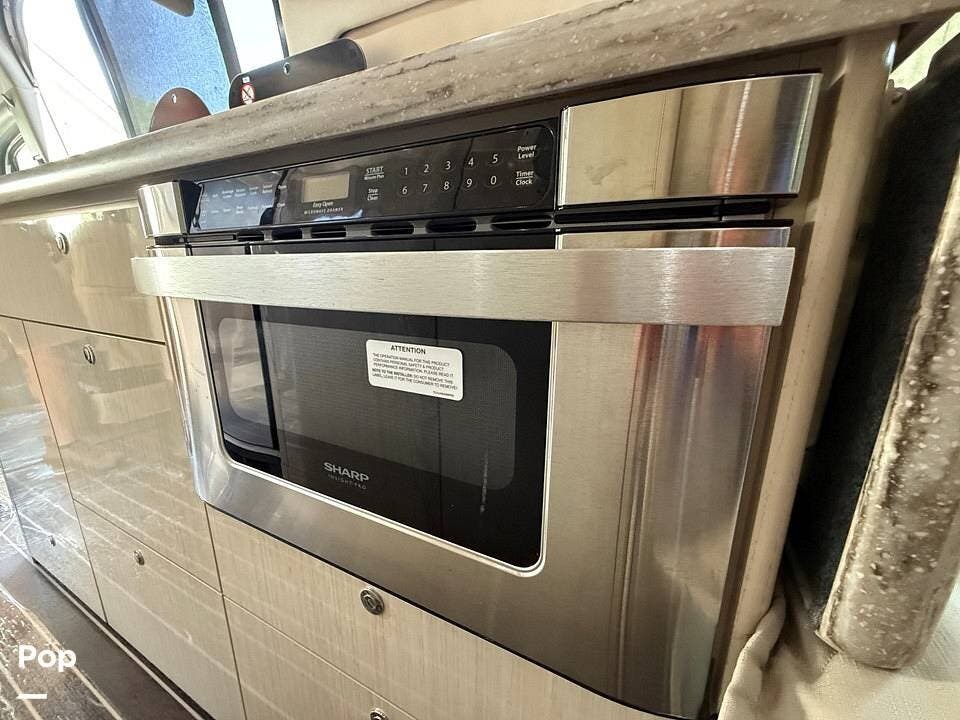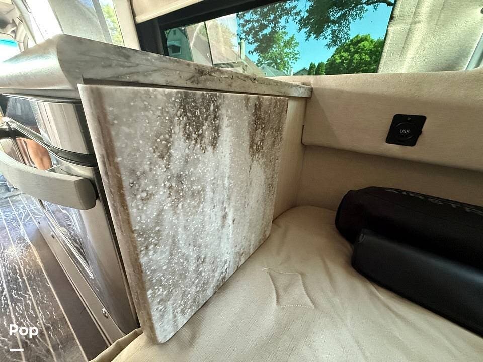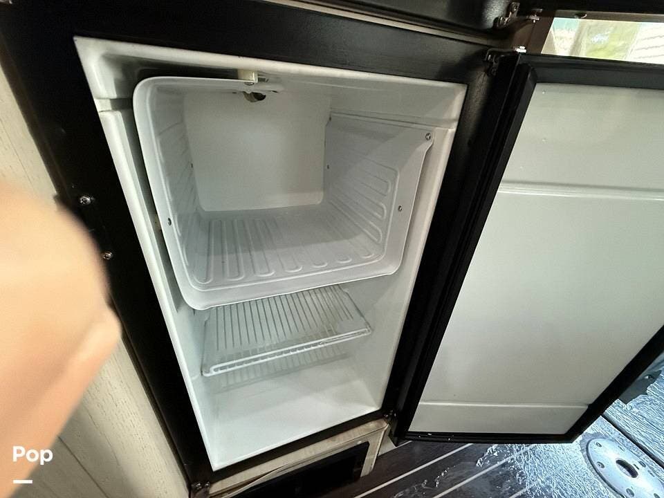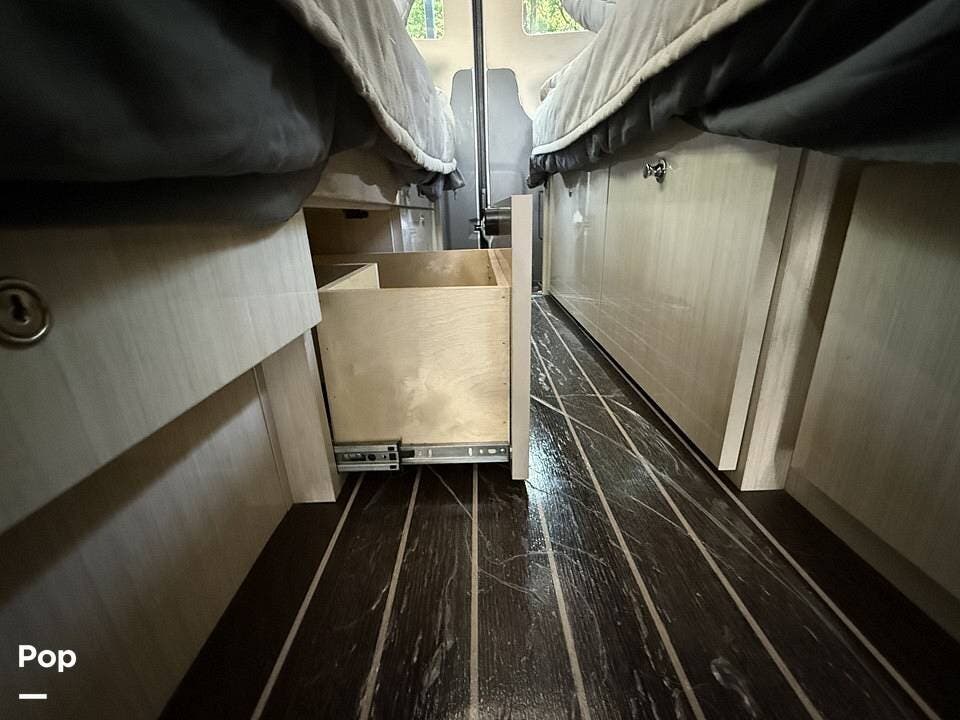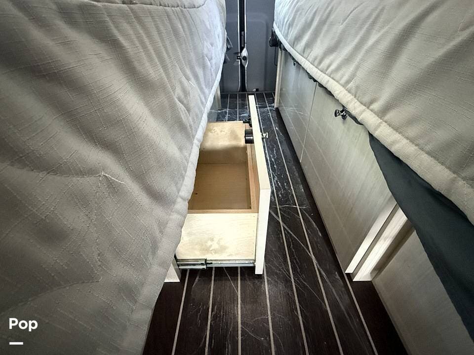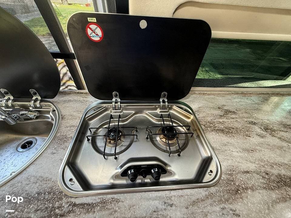 Twin beds offer a restful night's sleep, while the well-appointed galley includes stainless steel appliances, a two-burner propane stove, a drawer-style microwave, and a refrigerator/freezer combo that operates on 110V or 12V.