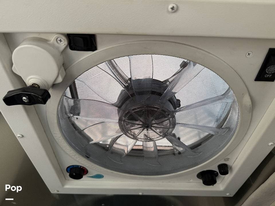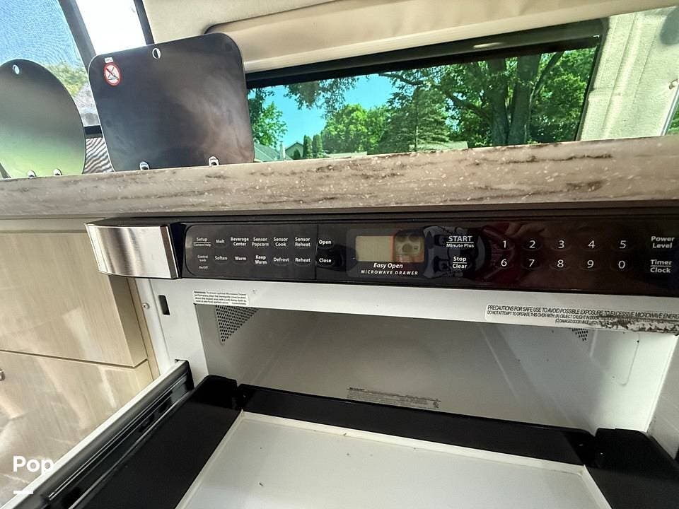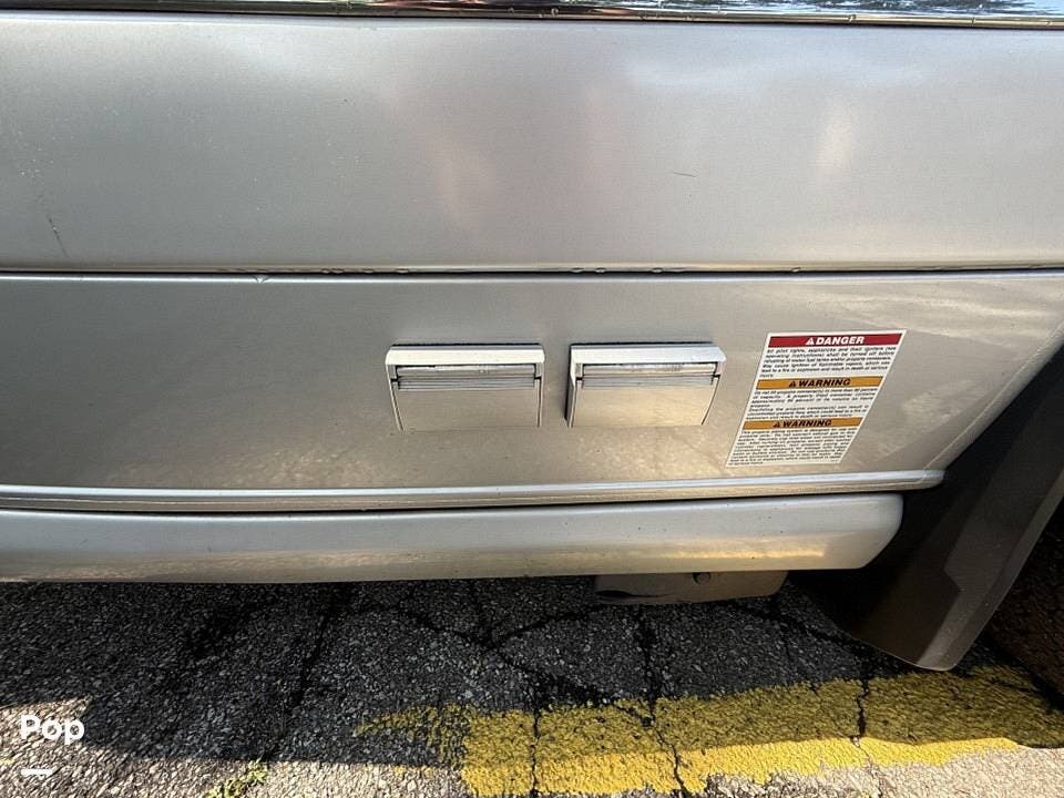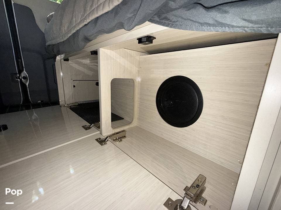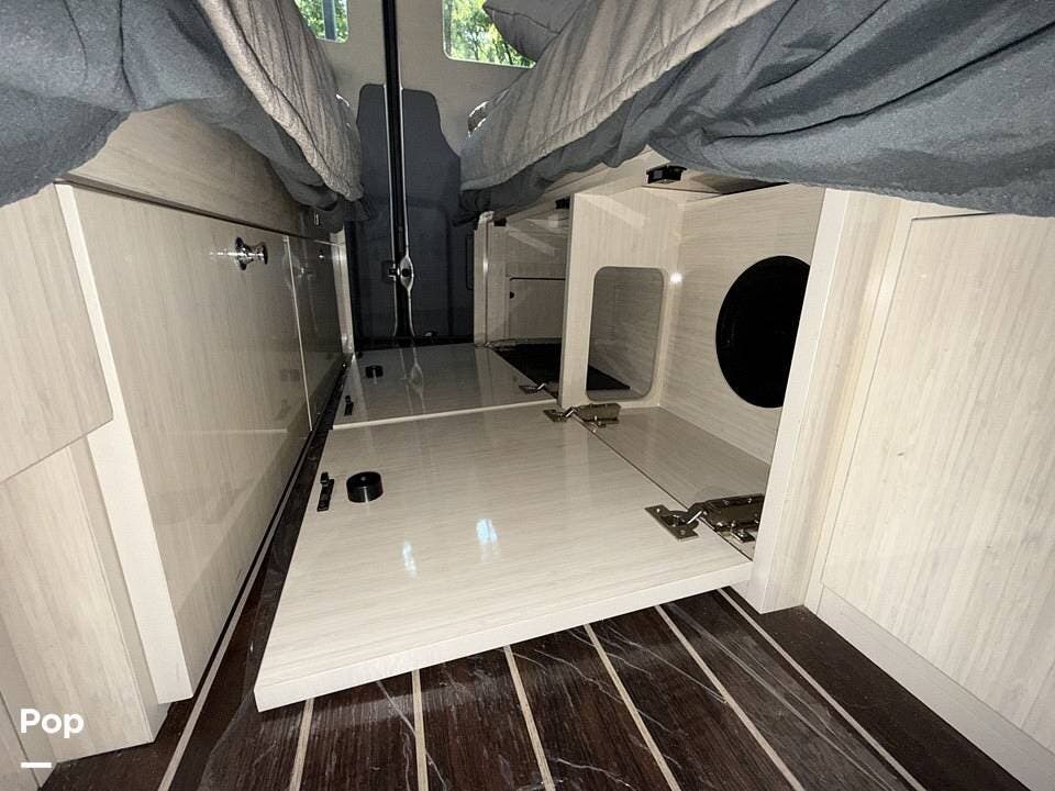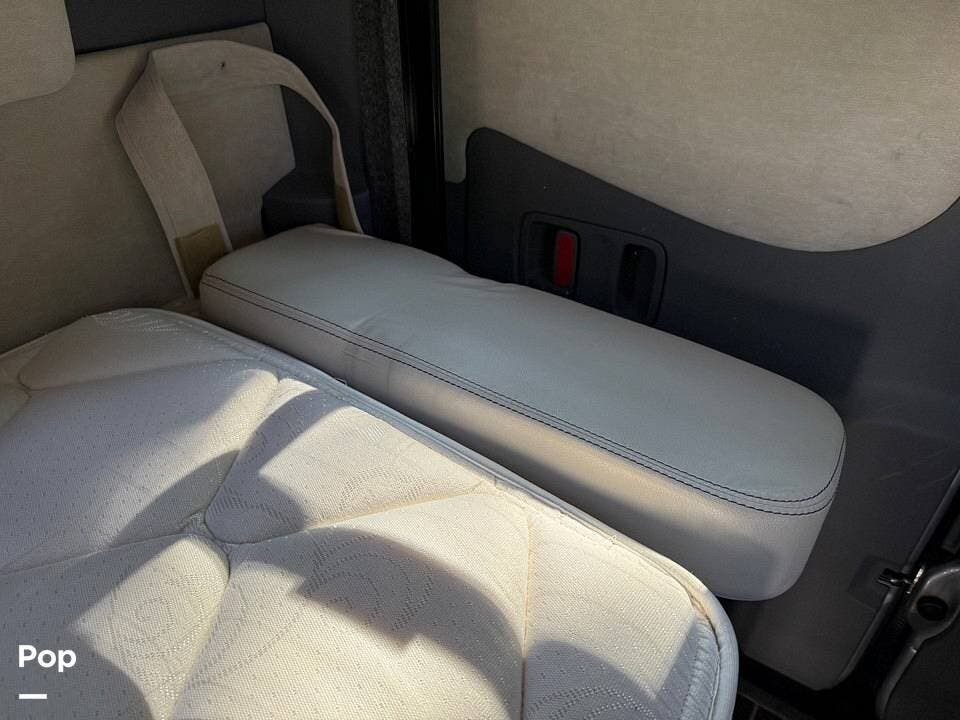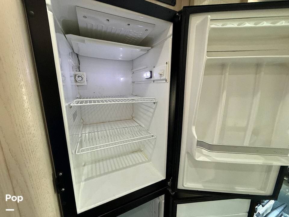 Twin beds offer a restful night's sleep, while the well-appointed galley includes stainless steel appliances, a two-burner propane stove, a drawer-style microwave, and a refrigerator/freezer combo that operates on 110V or 12V.