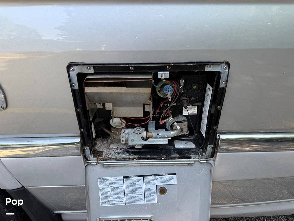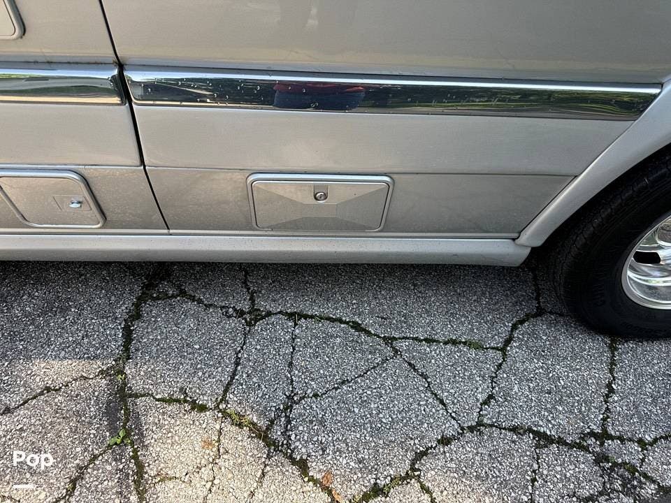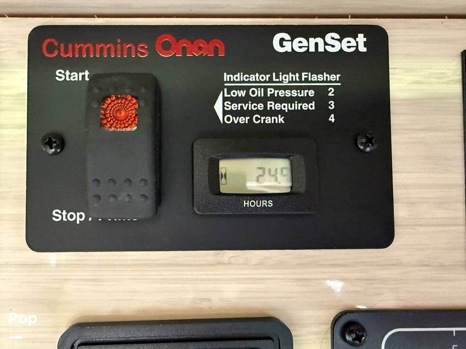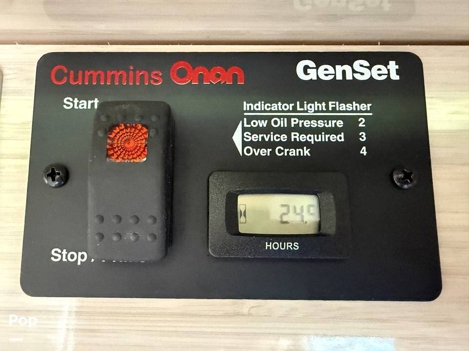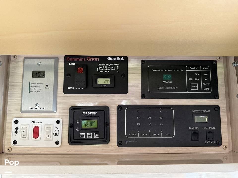 This Grand Tour has a 2.5kW Onan generator, propane heat, 110V air conditioning (shore or generator-powered), and generous storage including a roof ladder, bike rack, and Yakima swing-away rear storage container.