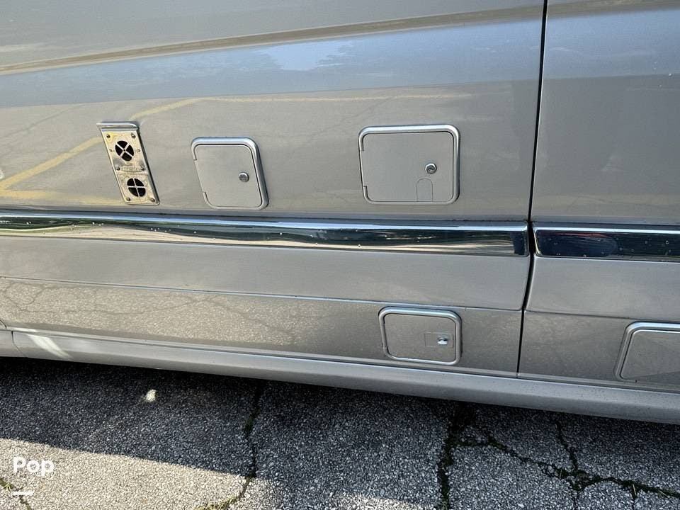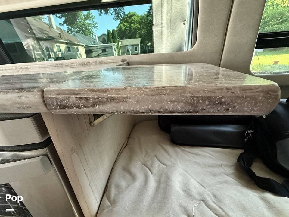 Additional features elevate the touring experience: enjoy meals or work on the road with the stowable dining table and flip-up Corian desk. The rear power screen and large sliding side screen door allow fresh air without the bugs. You'll also find two flat-screen TVs, a DVD player, and onboard Wi-Fi capability.