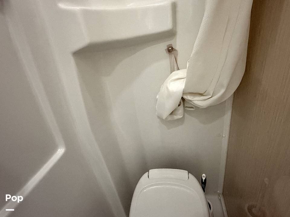 The bathroom features a toilet and shower, giving you all the comforts of home wherever you go.