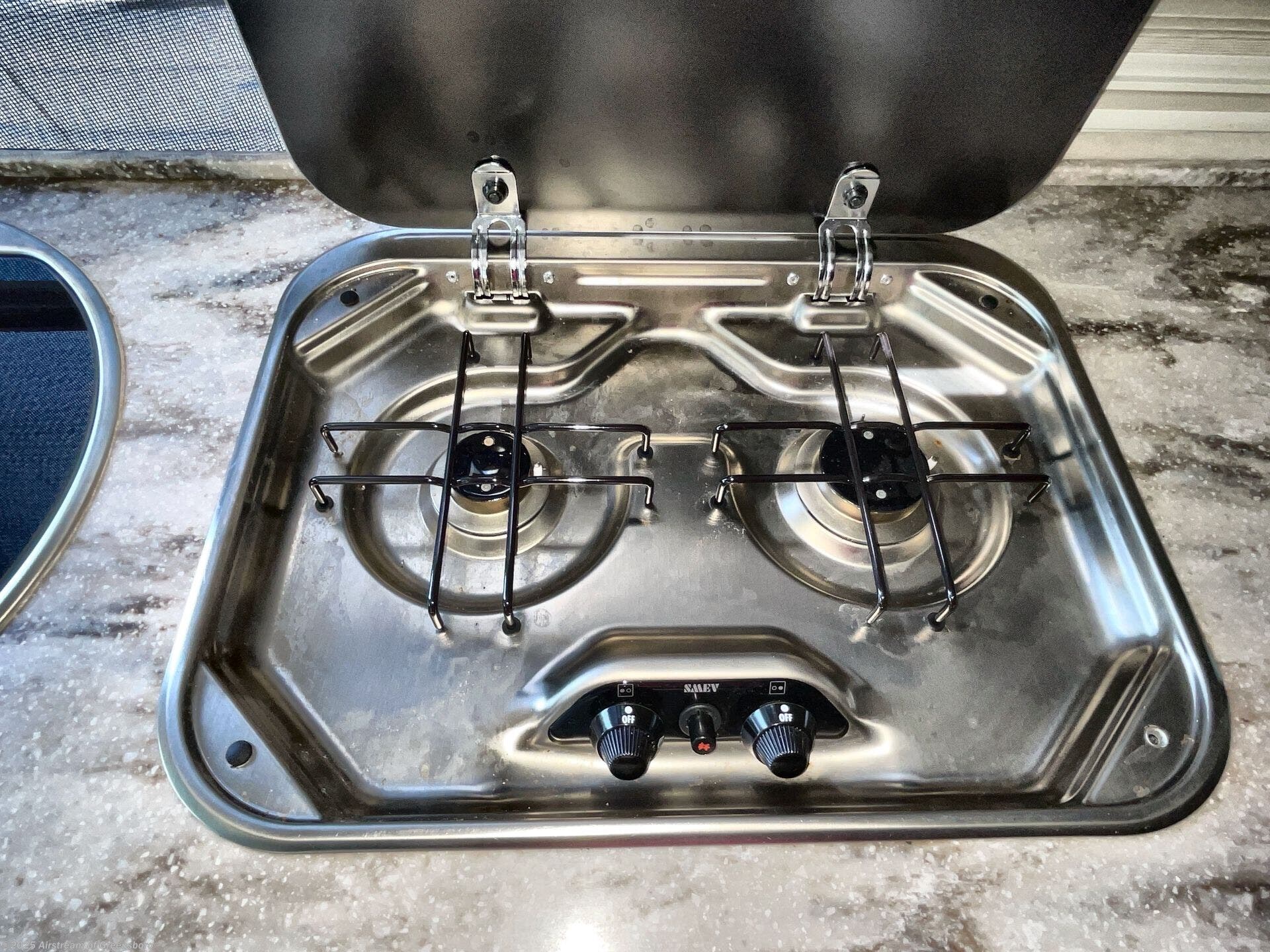 The galley has a sink, two burner range, and flip-up shelf along one side. The opposite side offers a large pantry and refrigerator with freezer.