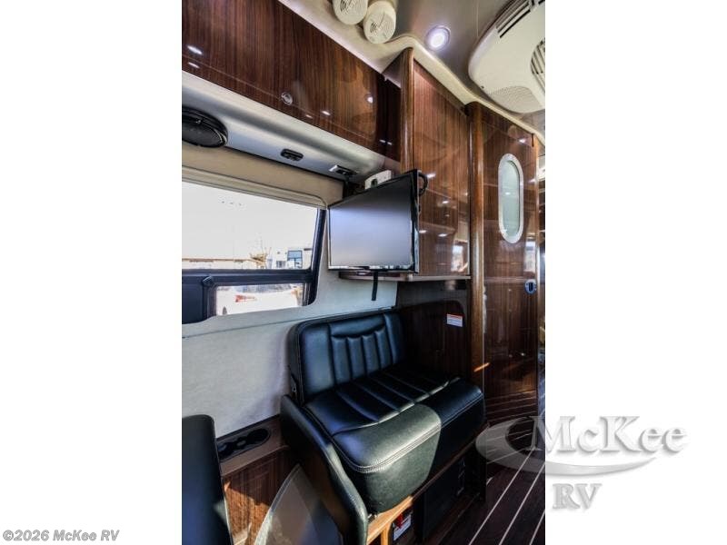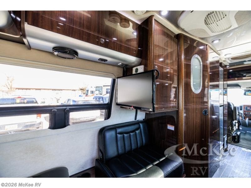 Step inside and find a convenient conversation area with the driver and passenger seats swiveled around. There is a removable table between the driver and passenger seat which allows for ease while eating or easy ability to play a game. Behind the driver's seat there is a work station and a LED TV.