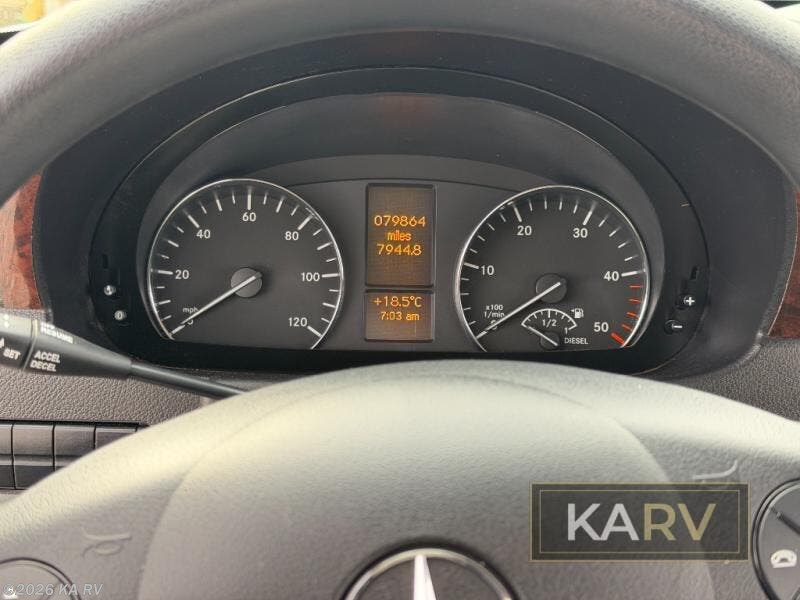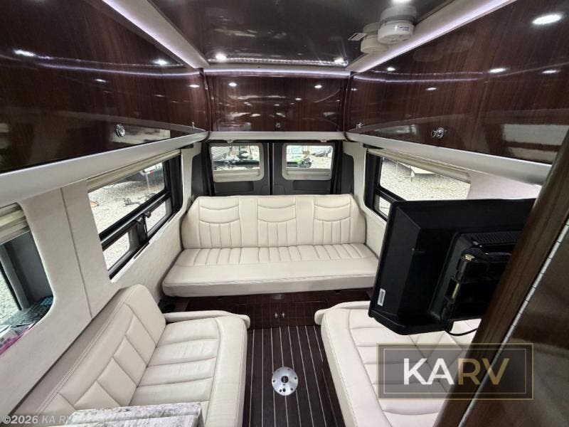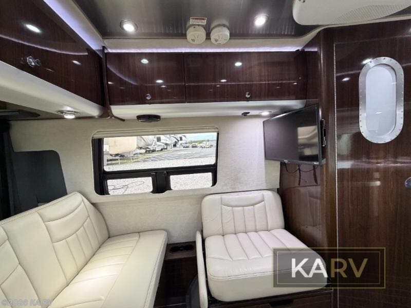 Step inside and find a convenient conversation area with the driver and passenger seats swiveled around. There is a removable table between the driver and passenger seat which allows for ease while eating or easy ability to play a game. Behind the driver's seat there is a work station and a LED TV.
