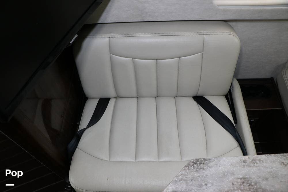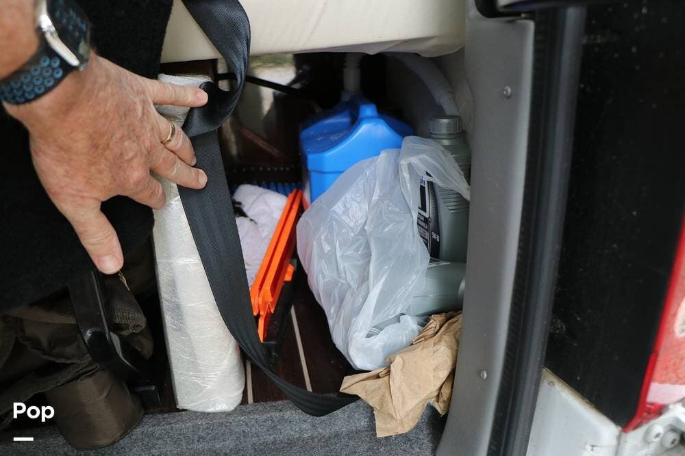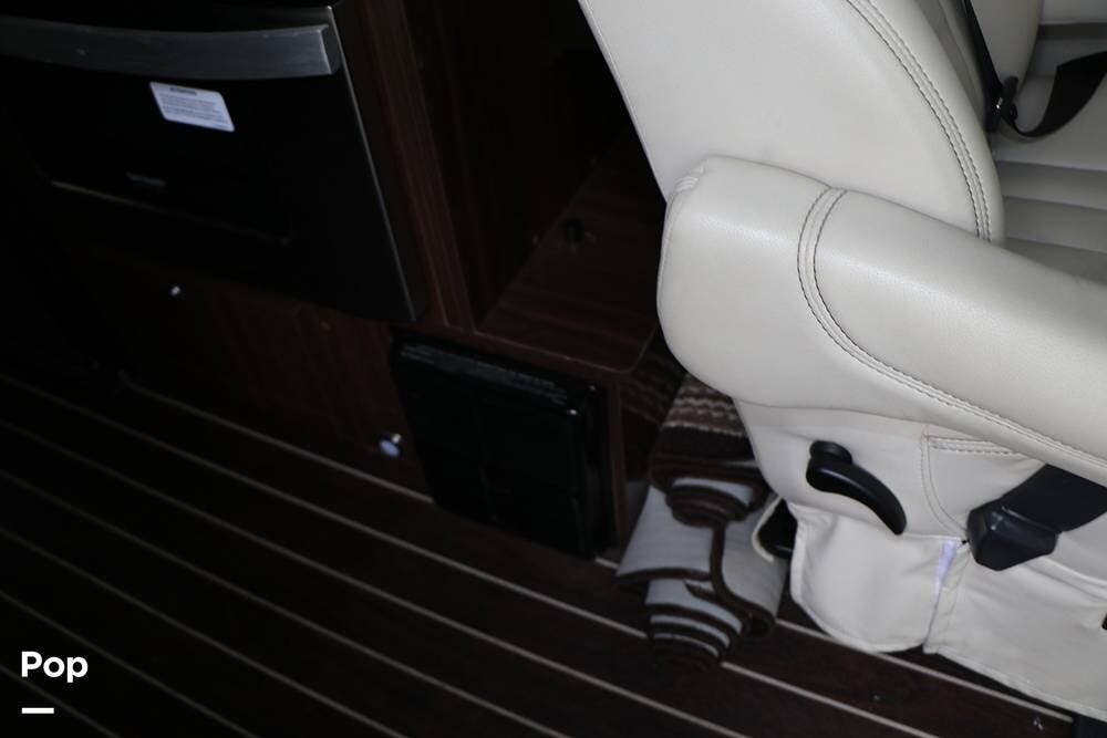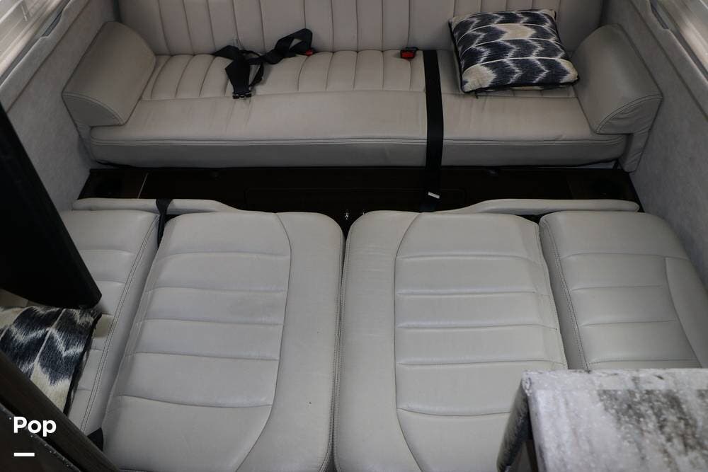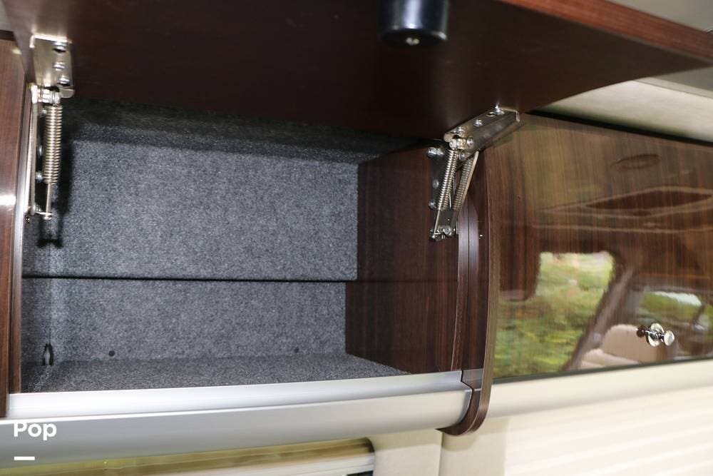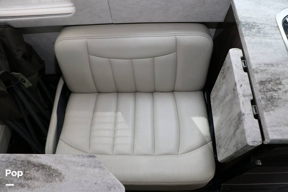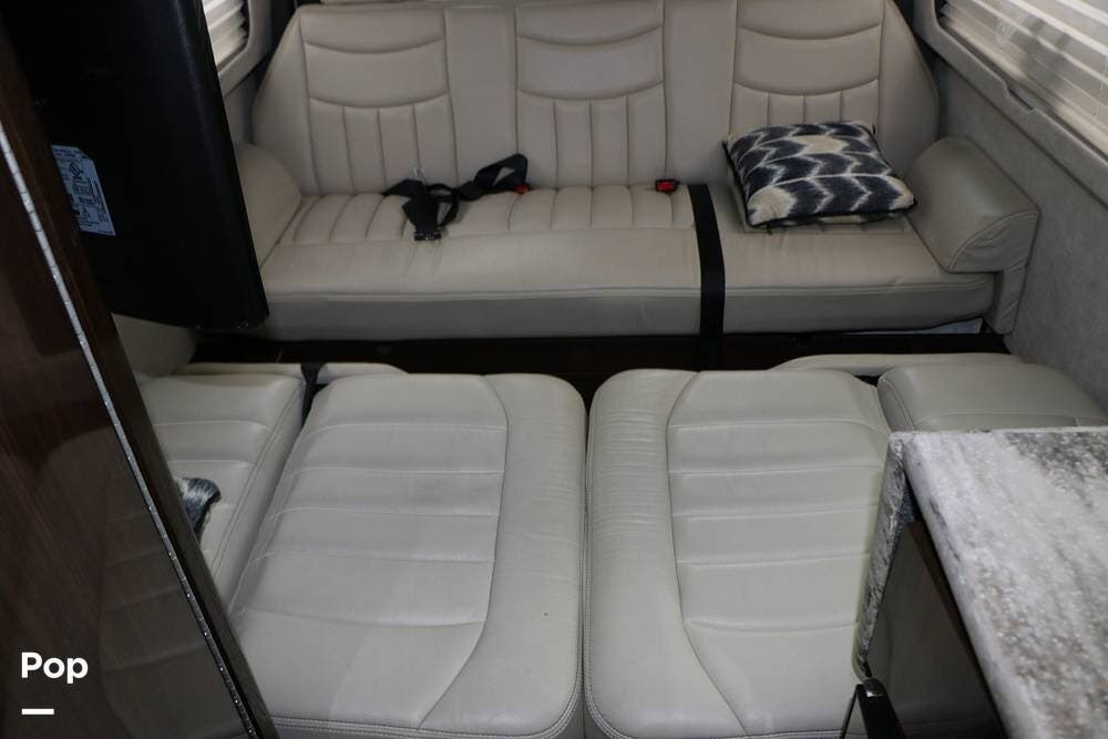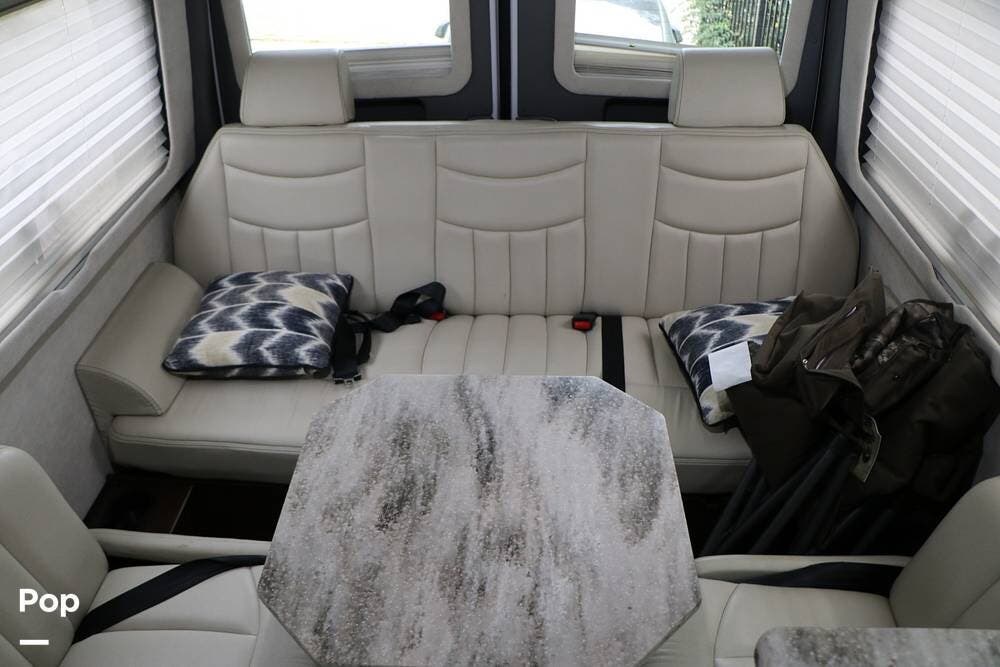 The unit features a nice layout with four captain's chairs at the front (two on each side) and a removable table that can be positioned at the front or rear of the unit as needed. The tabletop is stored behind the second row captain's chair, and the post is stored in a clamp in the storage space above the rear sofa.