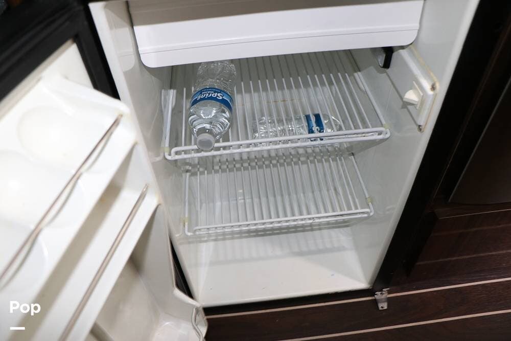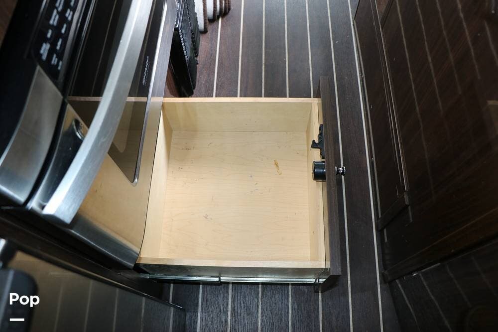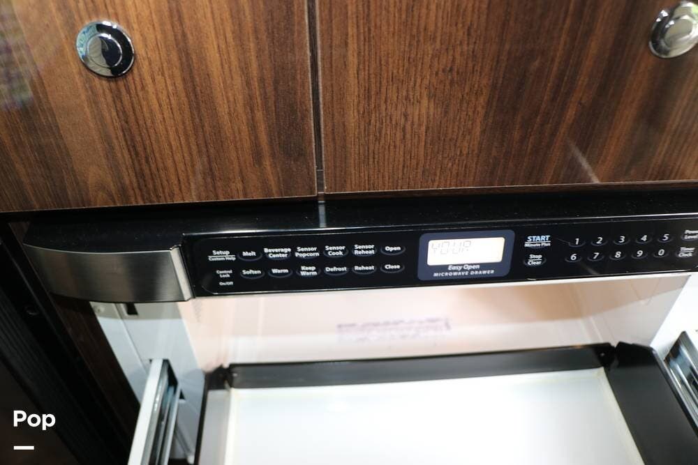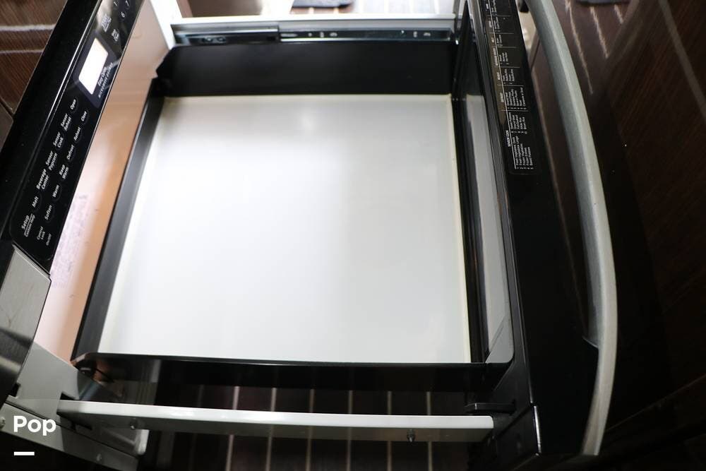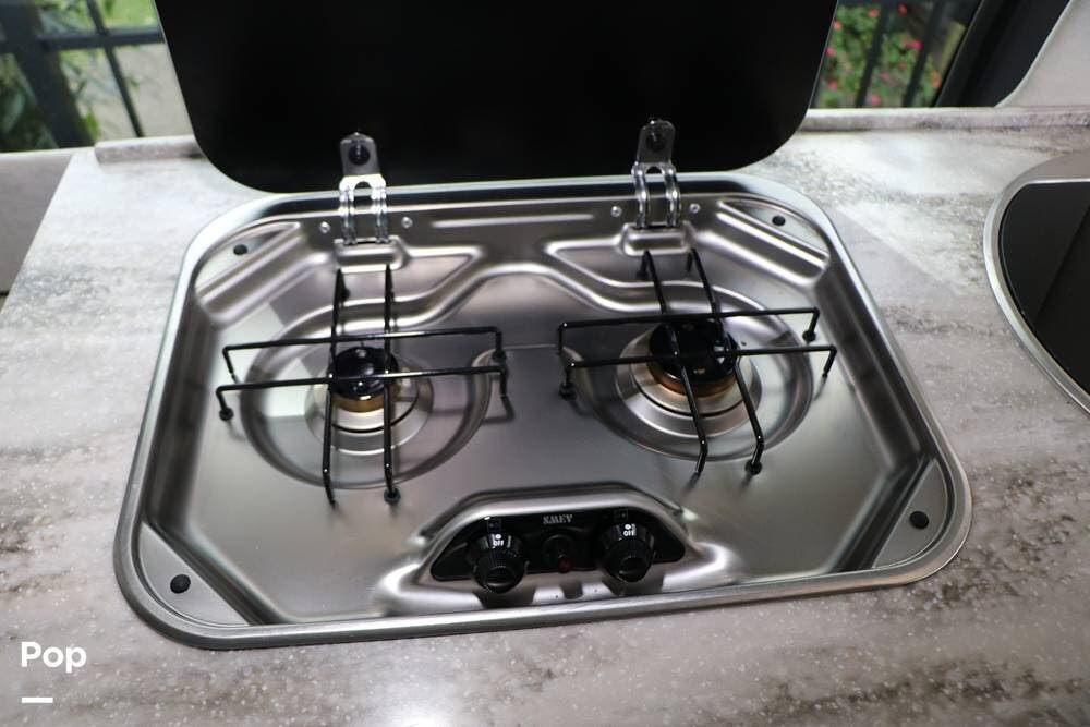 The galley is equipped with a drawer microwave oven, a 2-burner propane stove top with a glass cooktop cover, and a round sink with a glass cover and "pop-up" faucet. The refrigerator is below the solid-surface countertop and has an interior freezer as well.