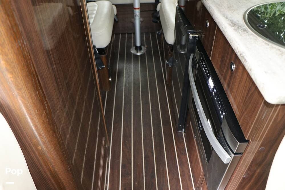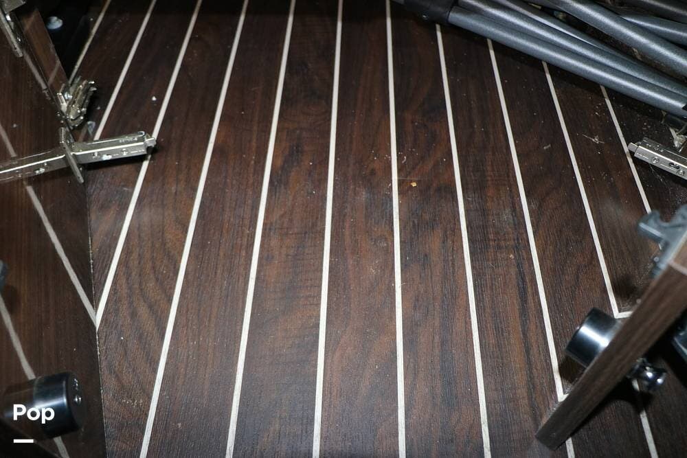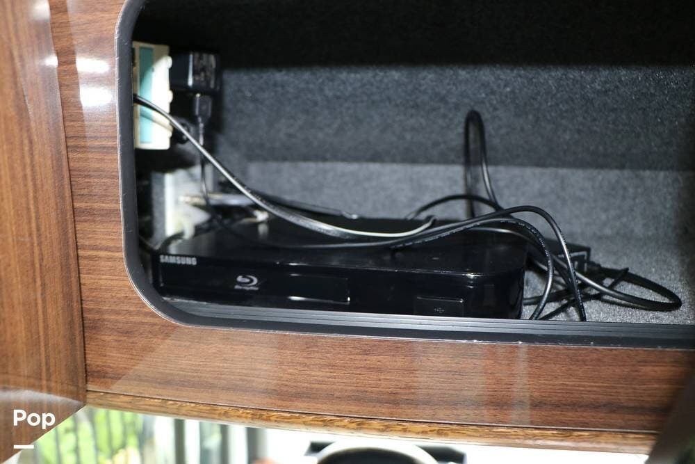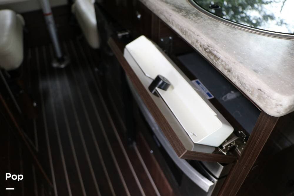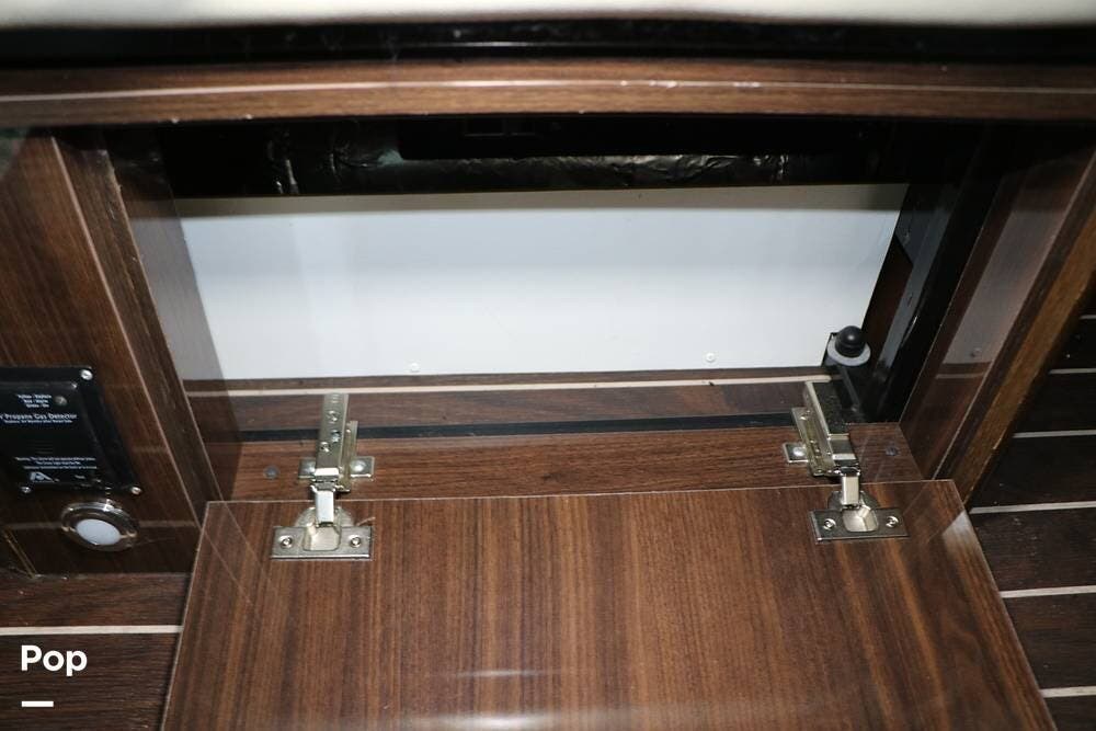 The galley is equipped with a drawer microwave oven, a 2-burner propane stove top with a glass cooktop cover, and a round sink with a glass cover and "pop-up" faucet. The refrigerator is below the solid-surface countertop and has an interior freezer as well.