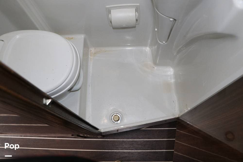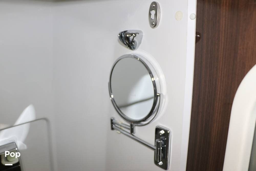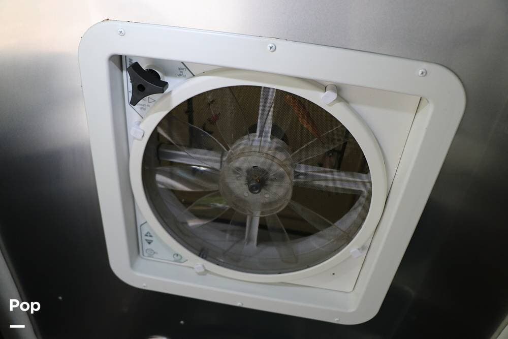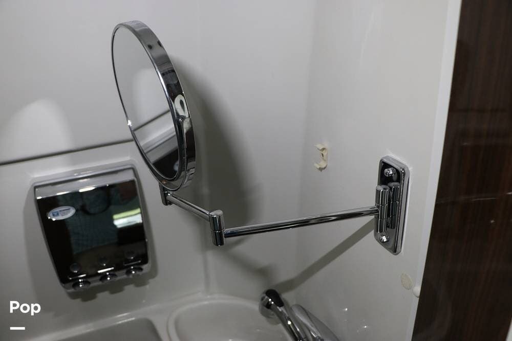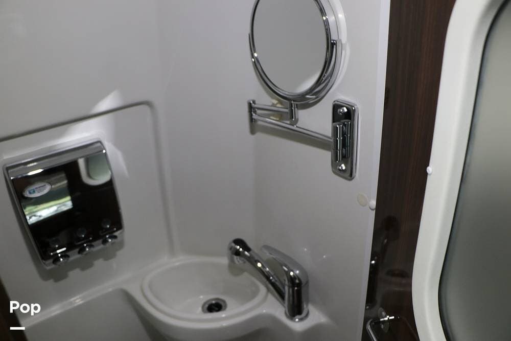 The bathroom is located opposite the Galley and directly behind the passenger's 2nd-row captain's chair. It features a wet head, with sink/shower and a makeup mirror on a swing-out bracket. There is a vent with an exhaust fan that leads to the outside, as well as one located in the roof of the bathroom.
