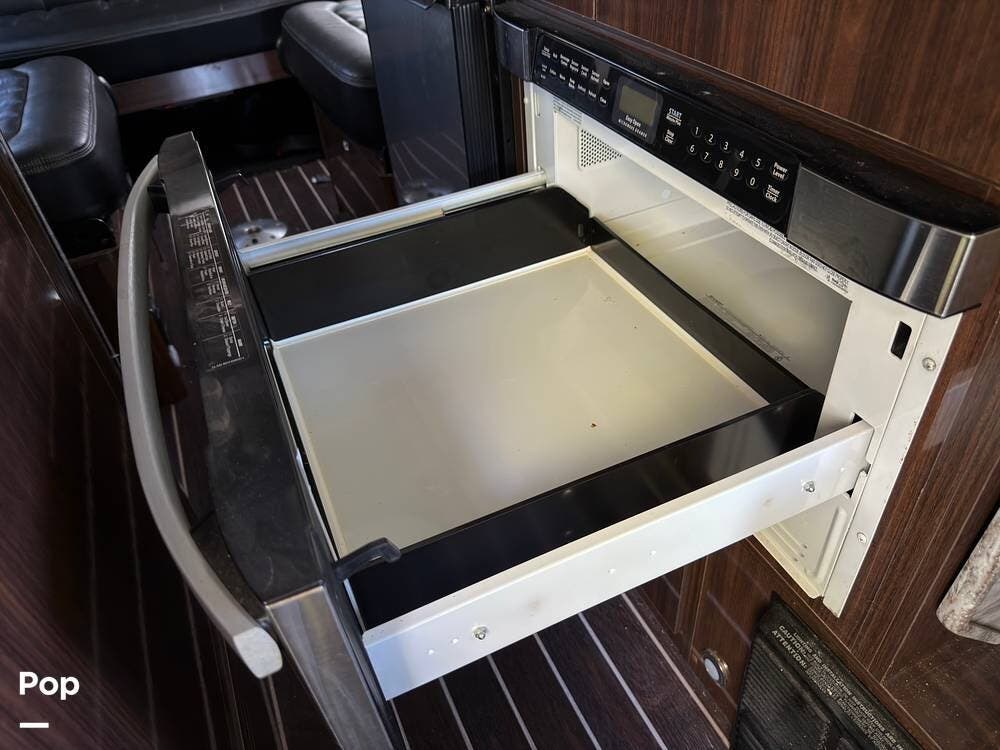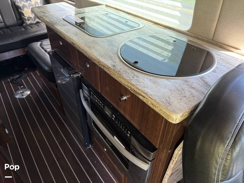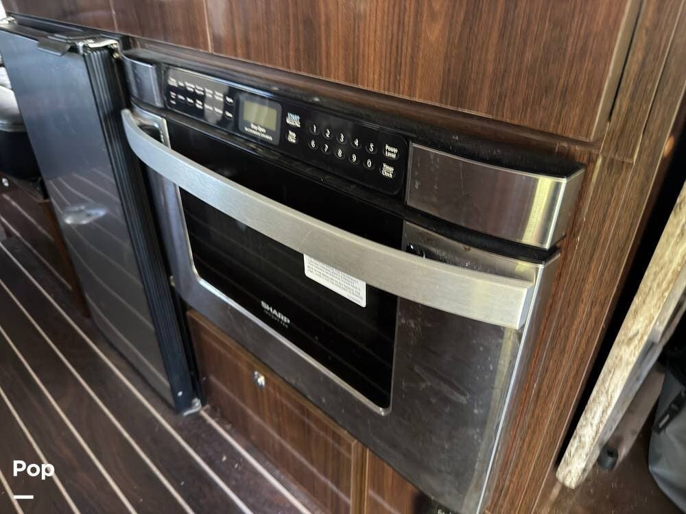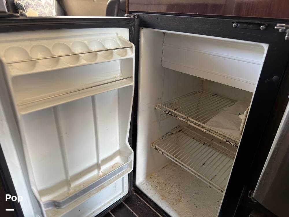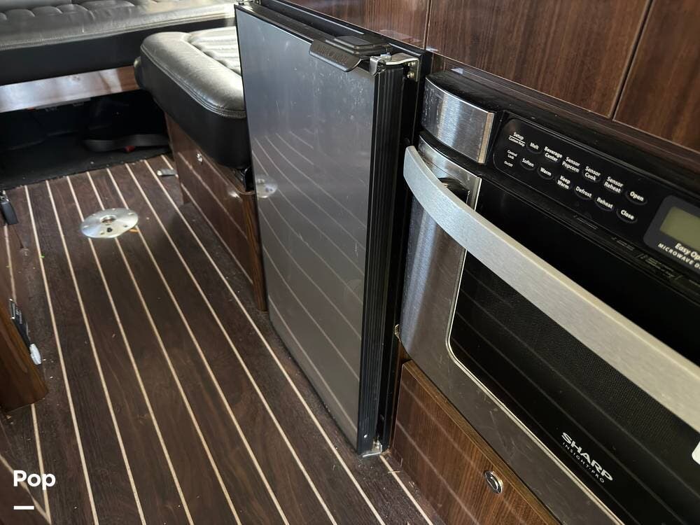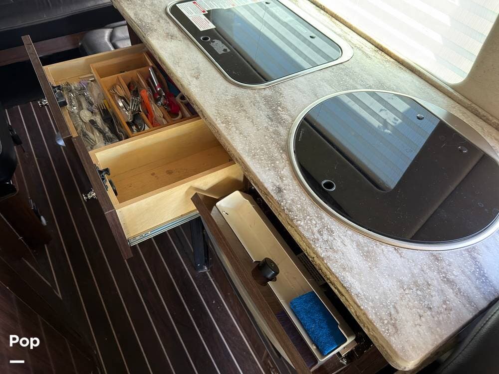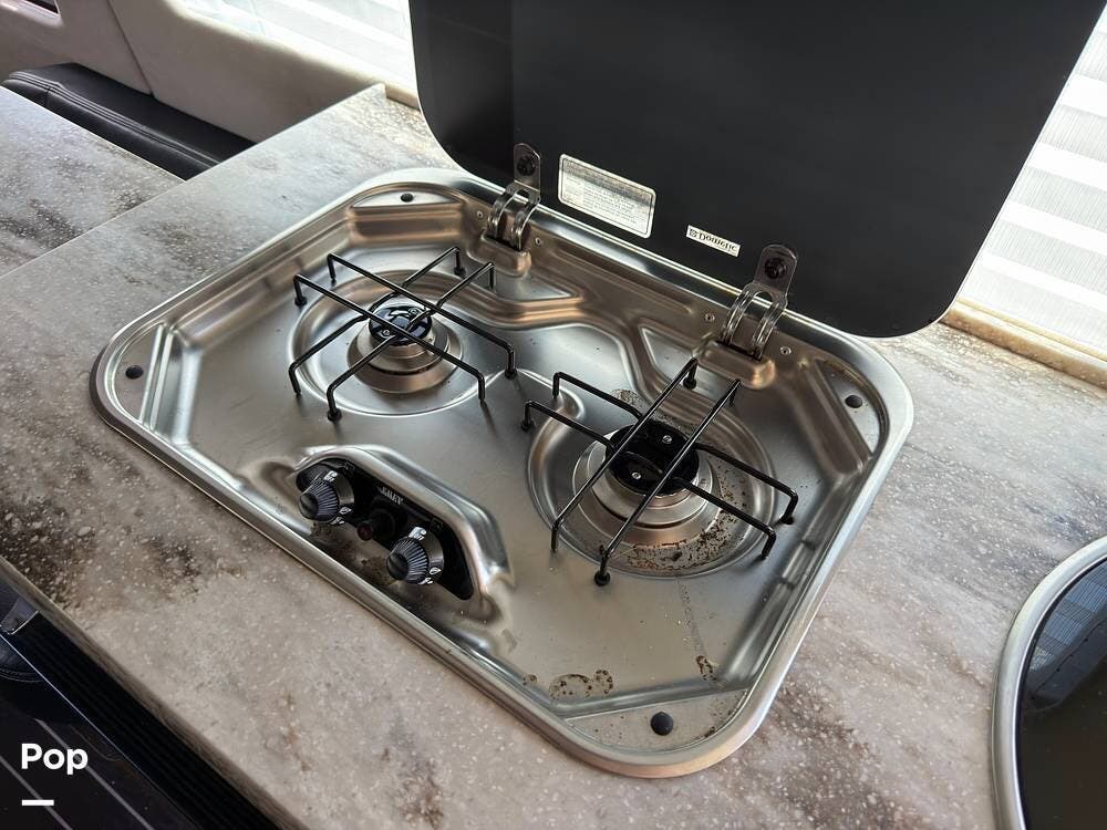Equipped with dining table spots at both the front and rear, it features a mid-galley with a sink, refrigerator, microwave/convection oven, and a two-burner stove.