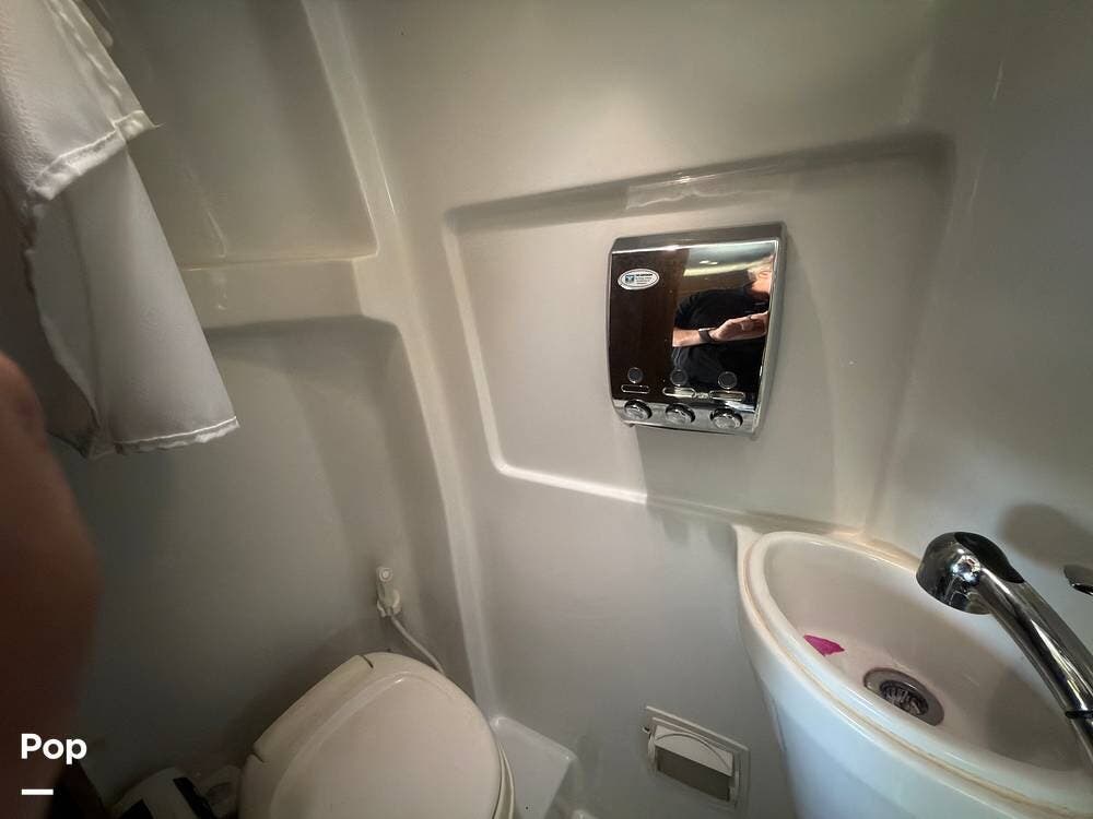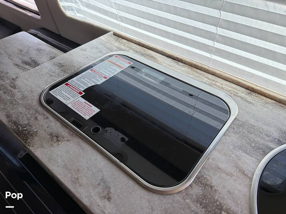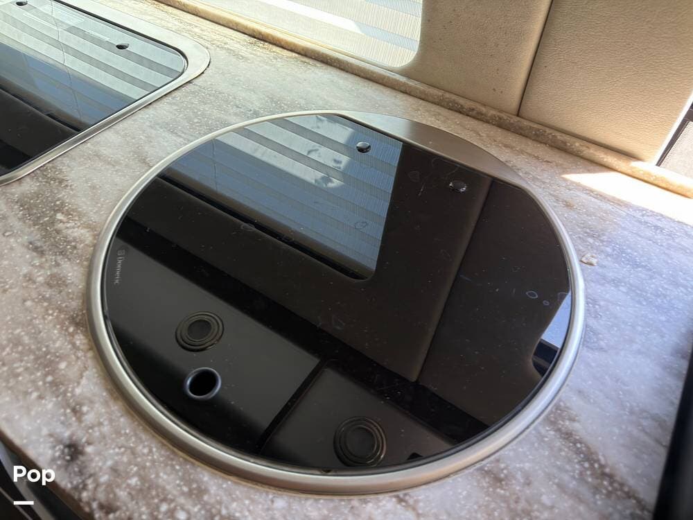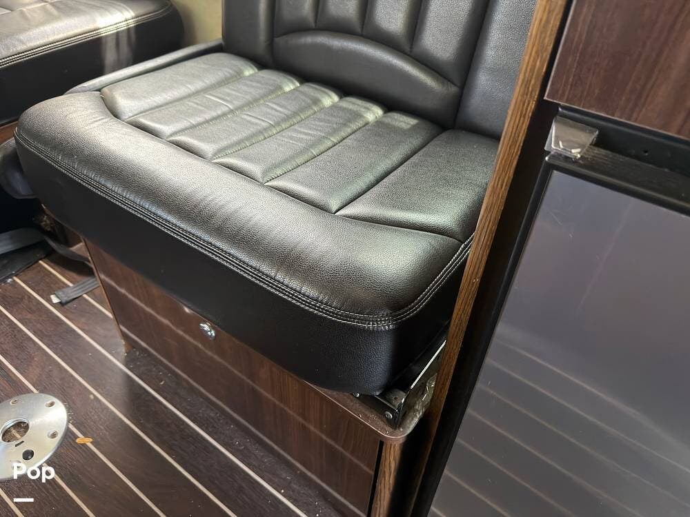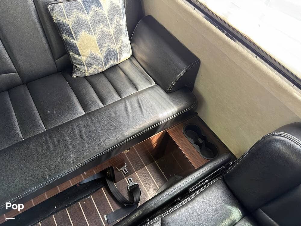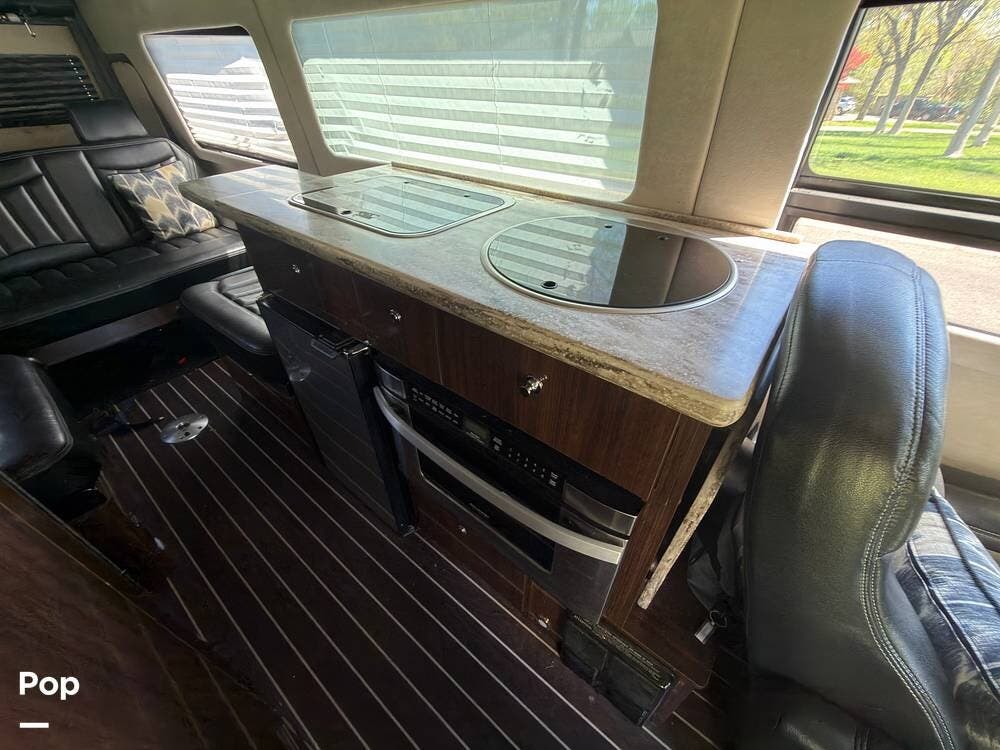 Equipped with dining table spots at both the front and rear, it features a mid-galley with a sink, refrigerator, microwave/convection oven, and a two-burner stove.