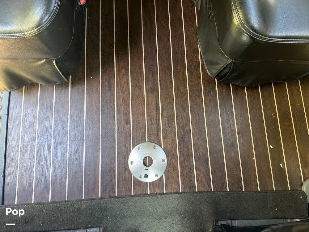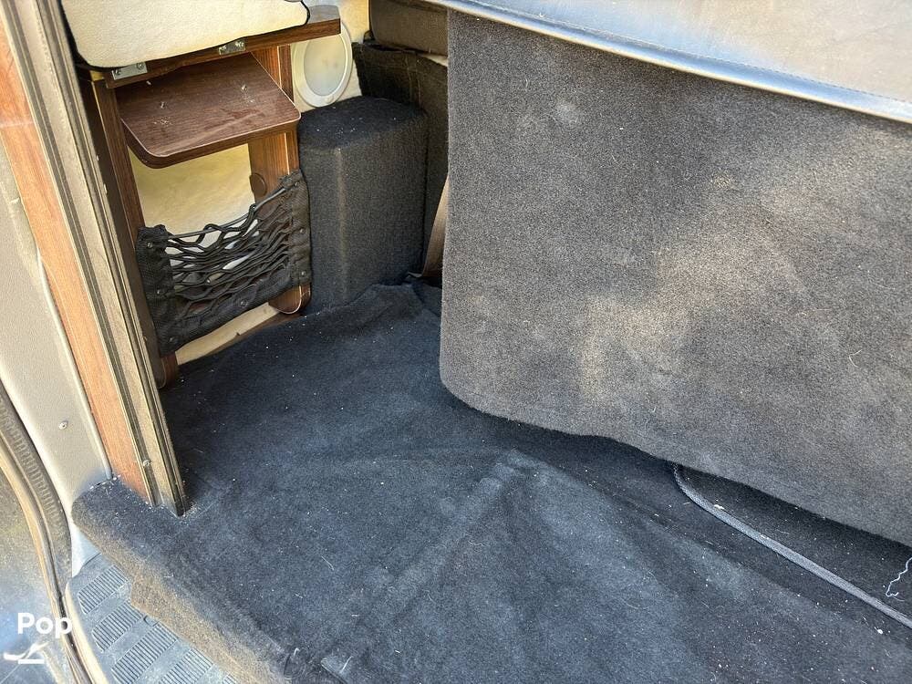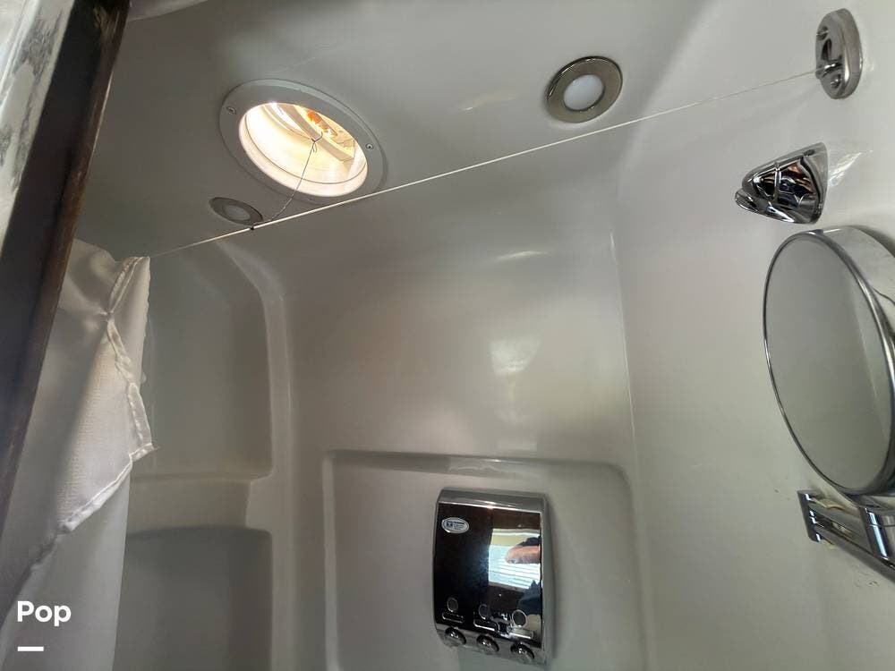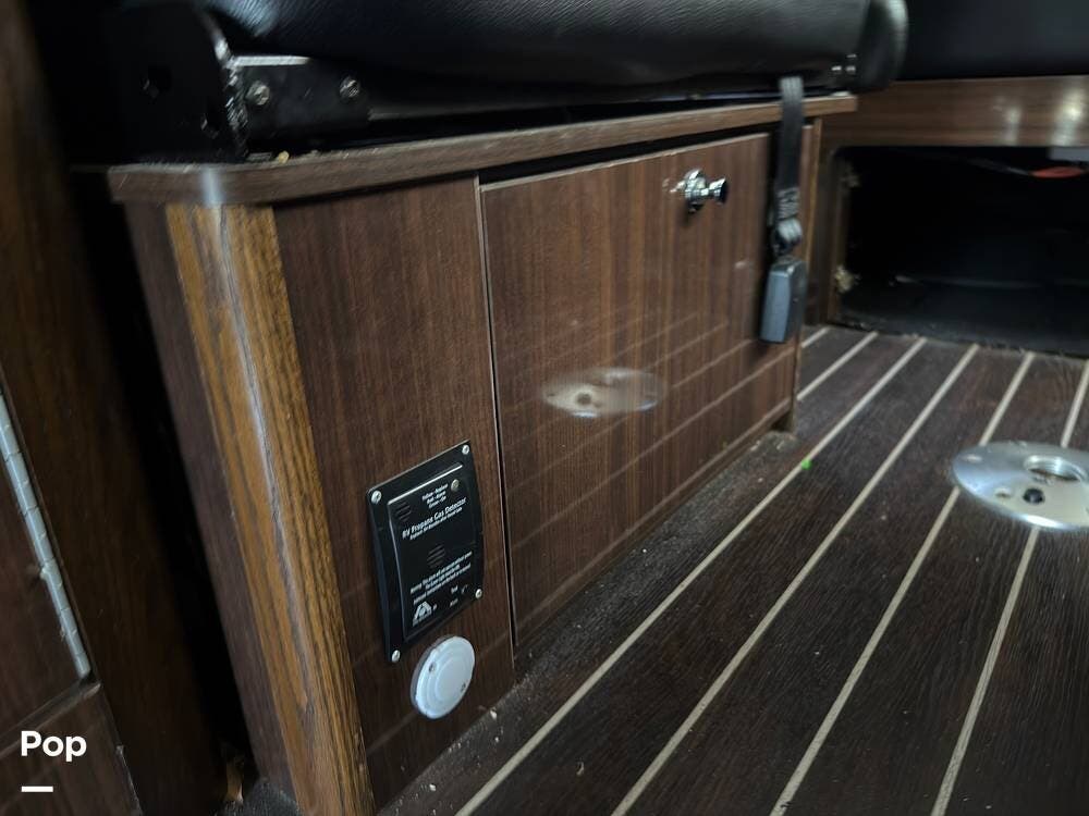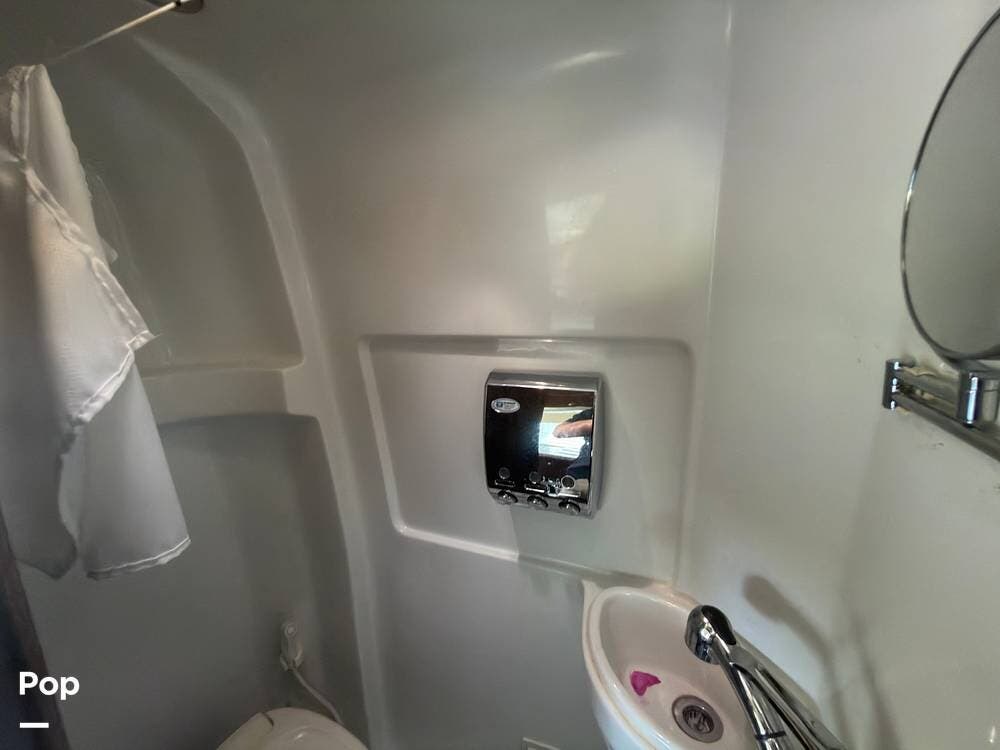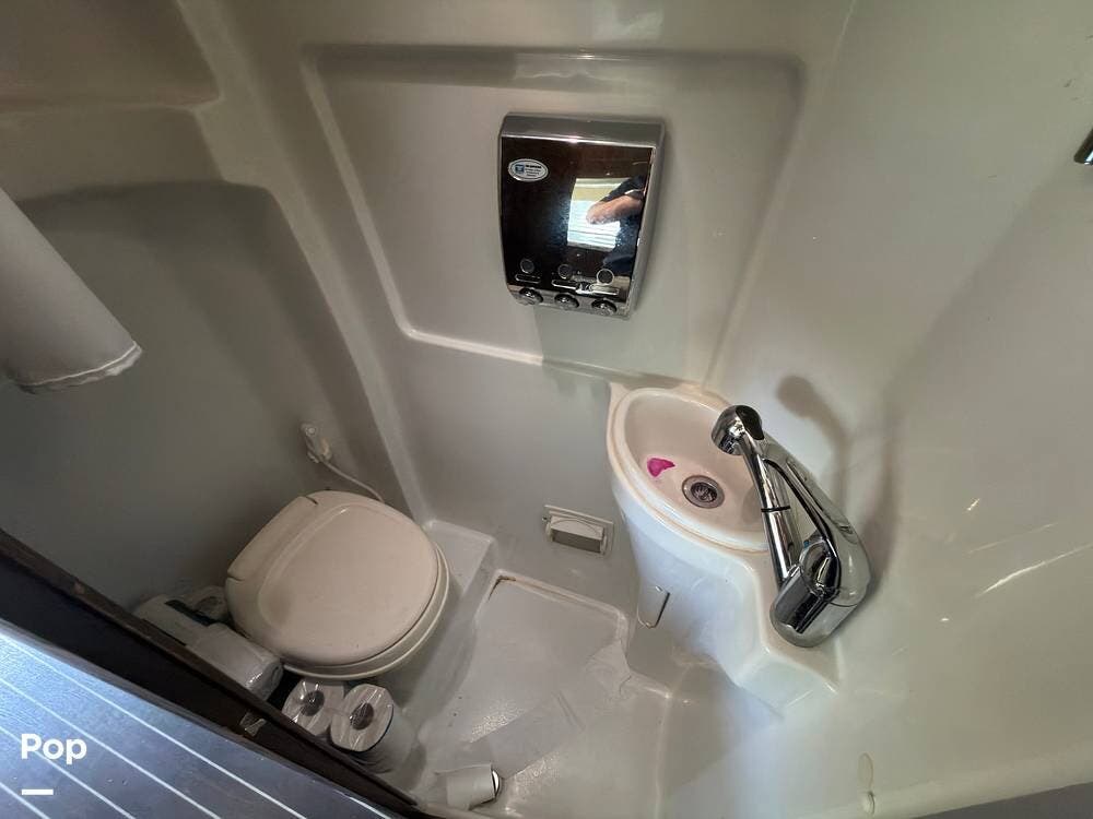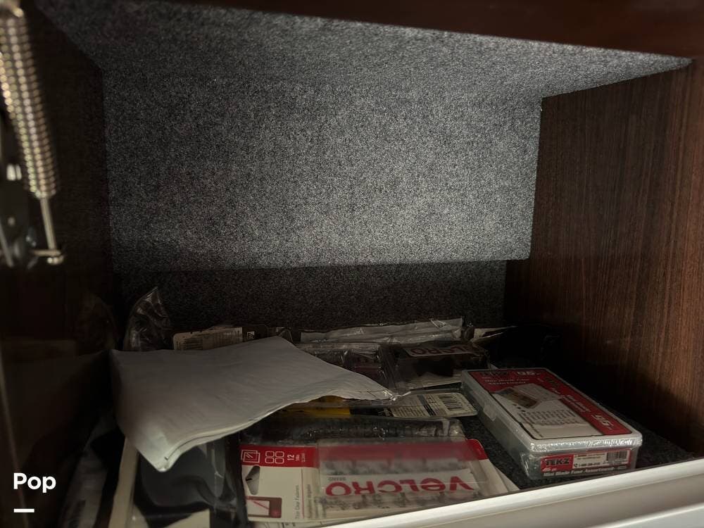 Equipped with dining table spots at both the front and rear, it features a mid-galley with a sink, refrigerator, microwave/convection oven, and a two-burner stove.