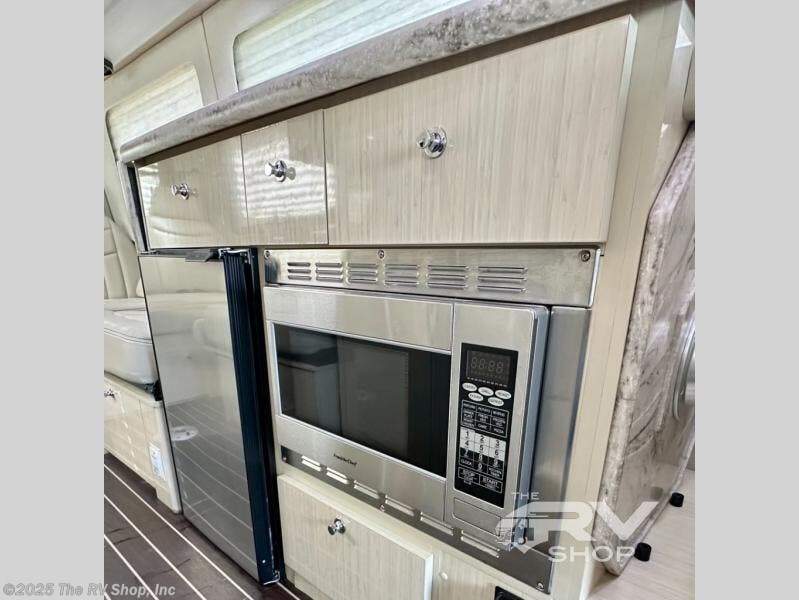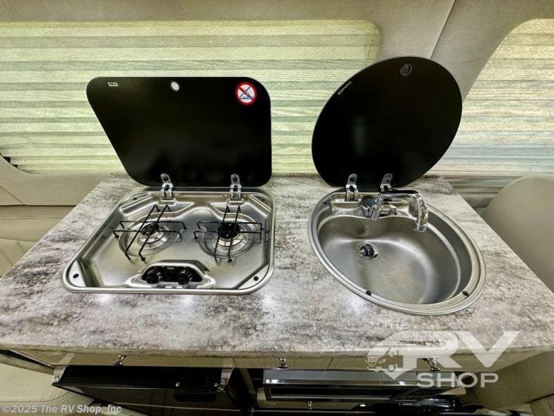 On the right side of the coach there is a round galley sink, overhead cabinets and a two burner cook-top, plus more.