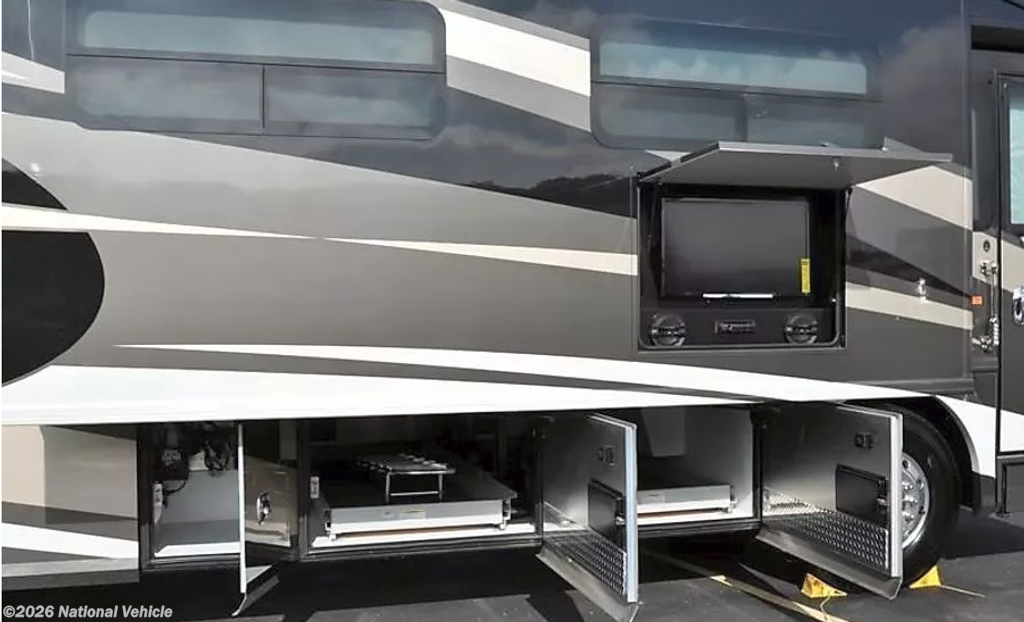 Other standout features include Aqua-Hot hydronic heating, power shades, an exterior entertainment center, basement slide-out trays, and high-end electronics throughout. With its blend of luxury, functionality, and road-ready power, the American Eagle 45A is perfect for extended travel or full-time RV living.