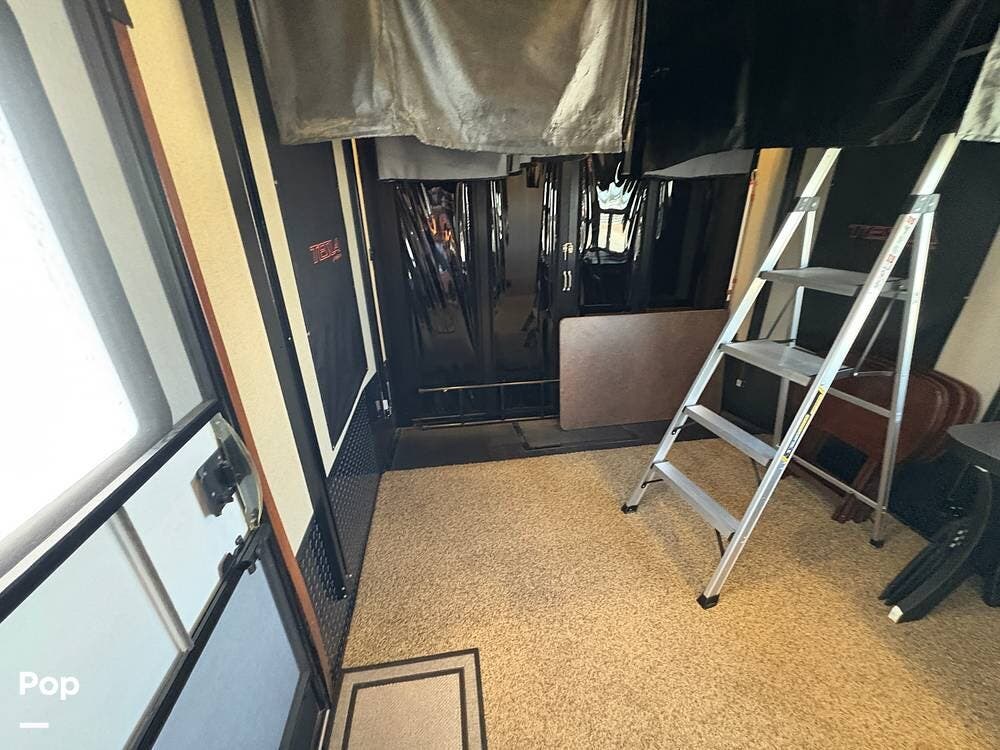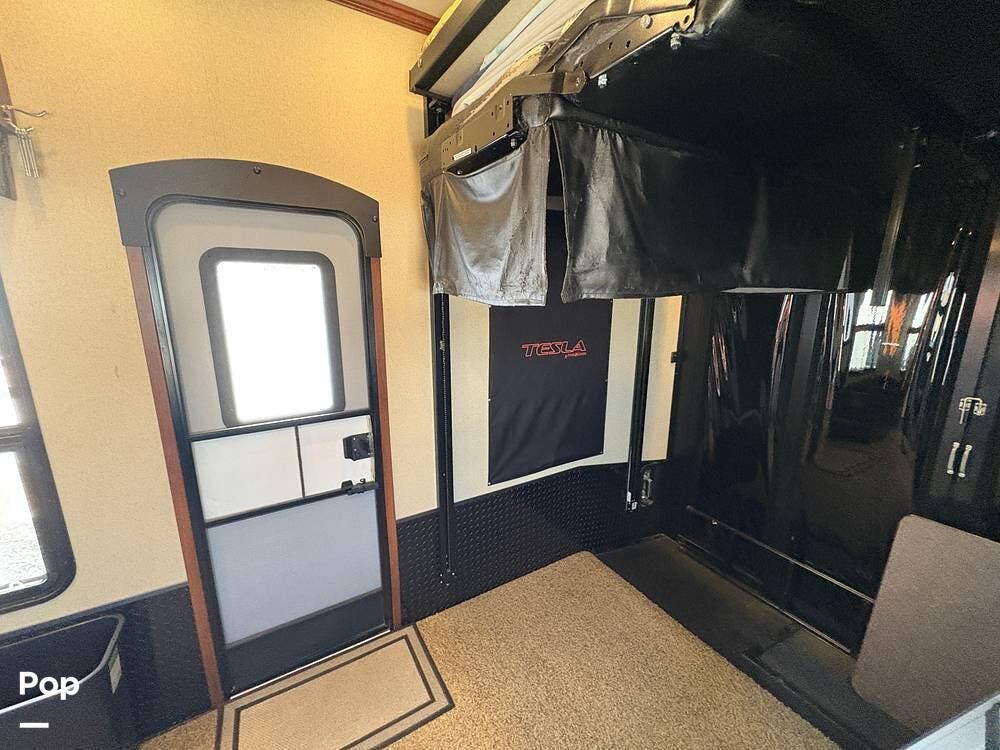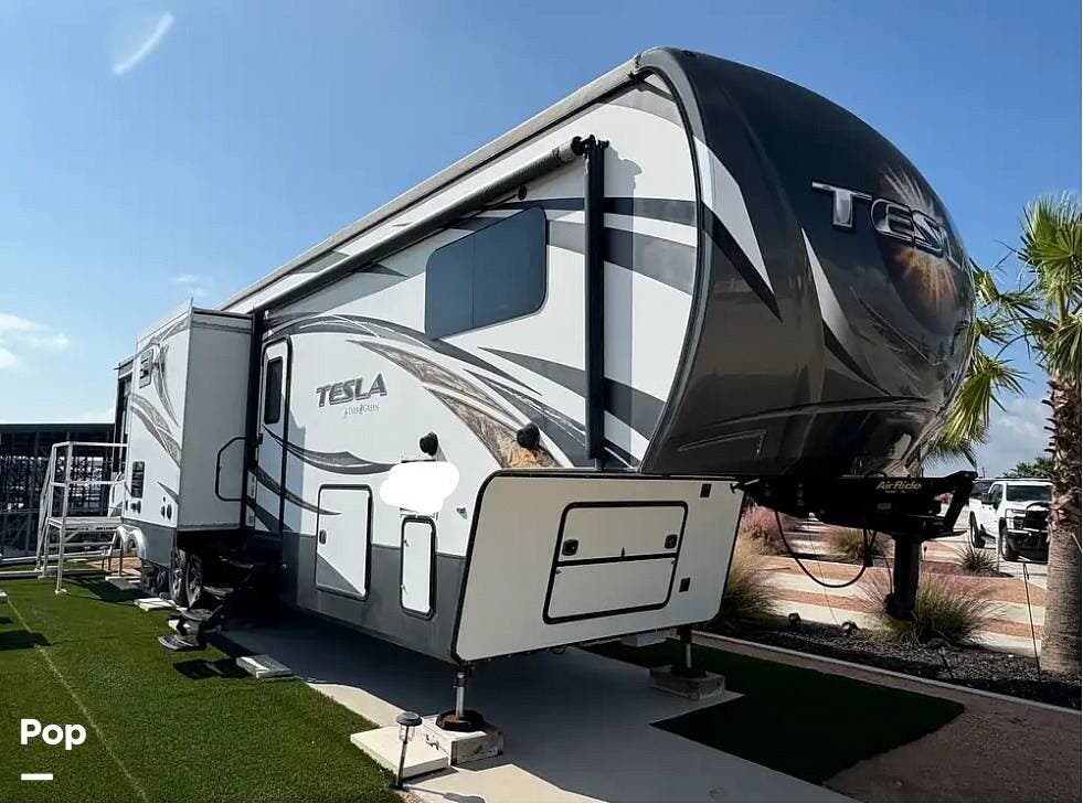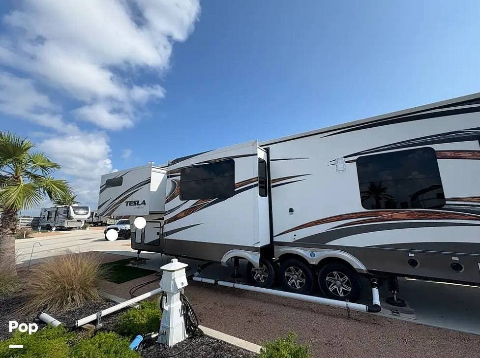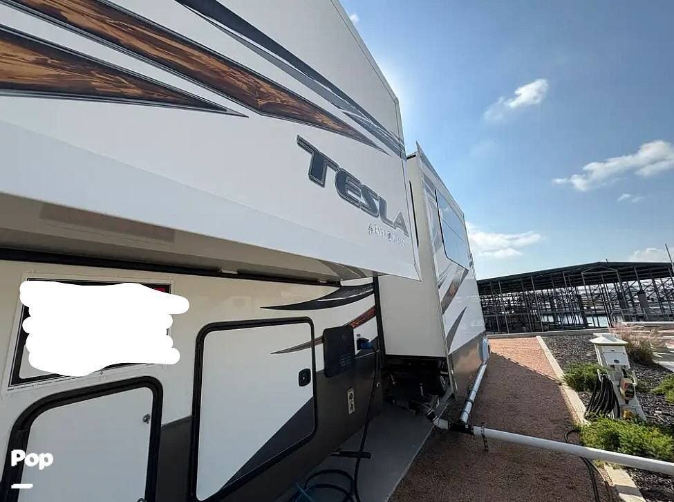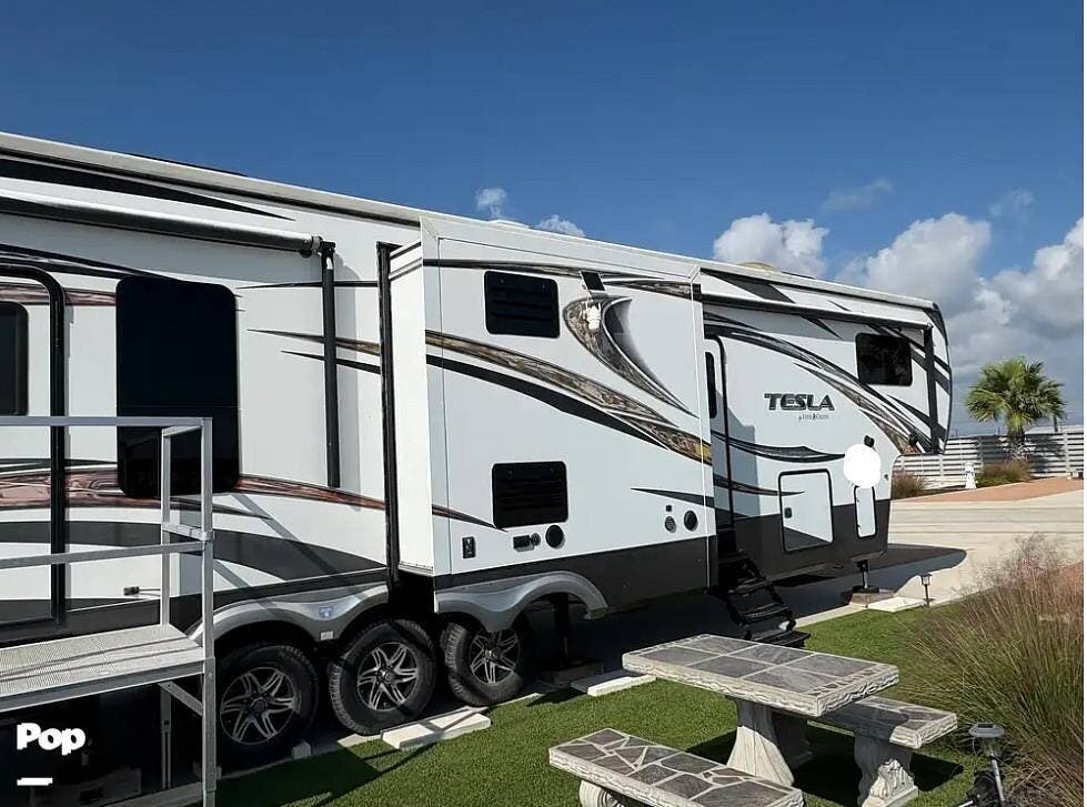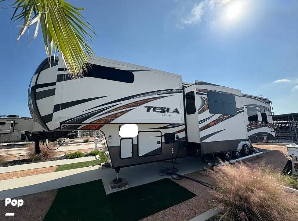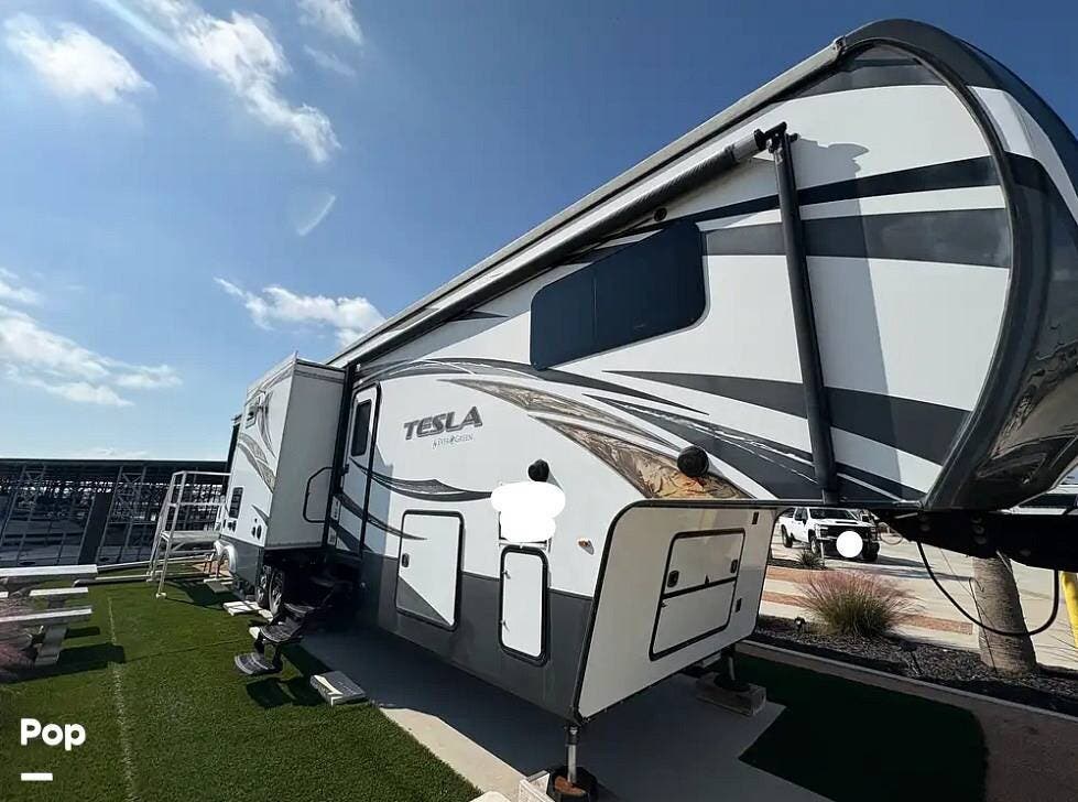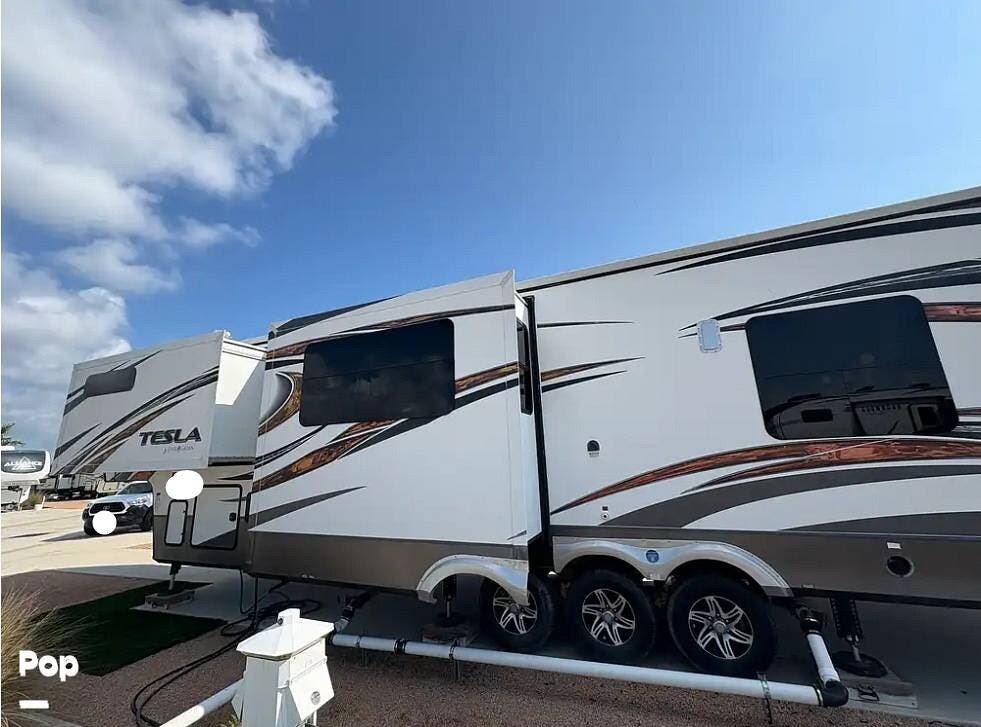 The 2015 EverGreen Tesla 3950 is a high-end toy hauler fifth wheel from EverGreen RV that combines luxury RV accommodations with a large garage bay for toys or gear. It offers substantial interior space and serious presence on the road.