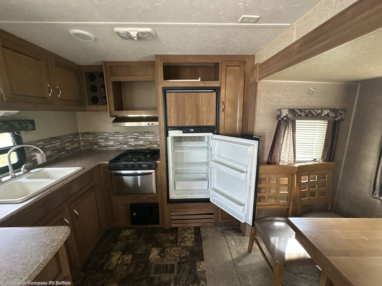 The rear kitchen is a notable feature of this Coachmen Catalina 293RKS travel trailer. There is also a large slide out for added space, plus you will enjoy the electric fireplace at the base of the TV entertainment center too!