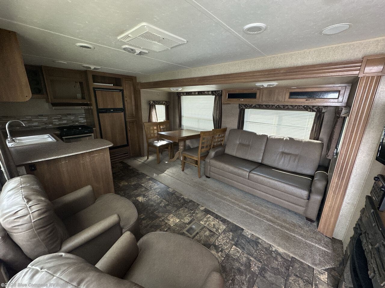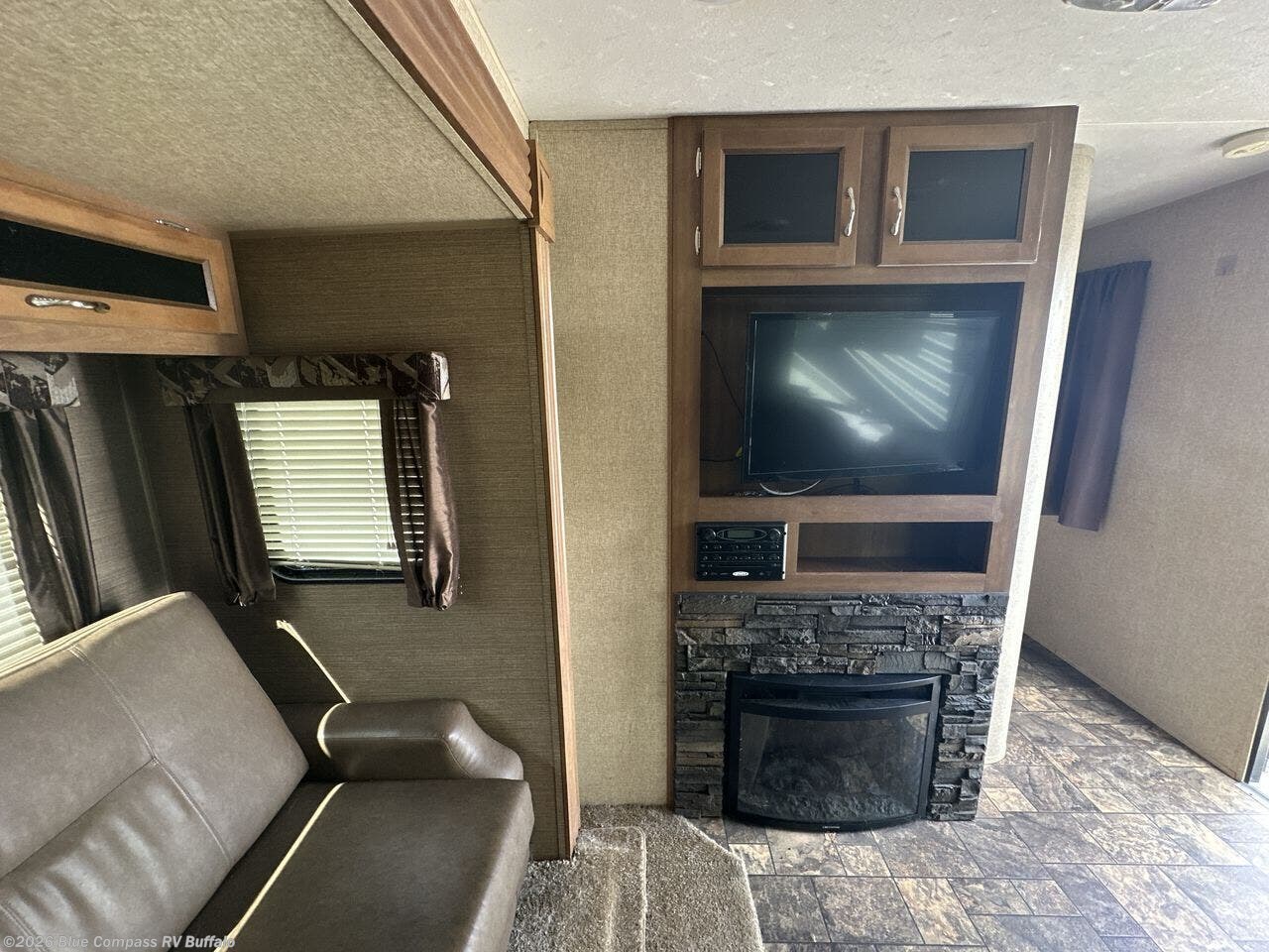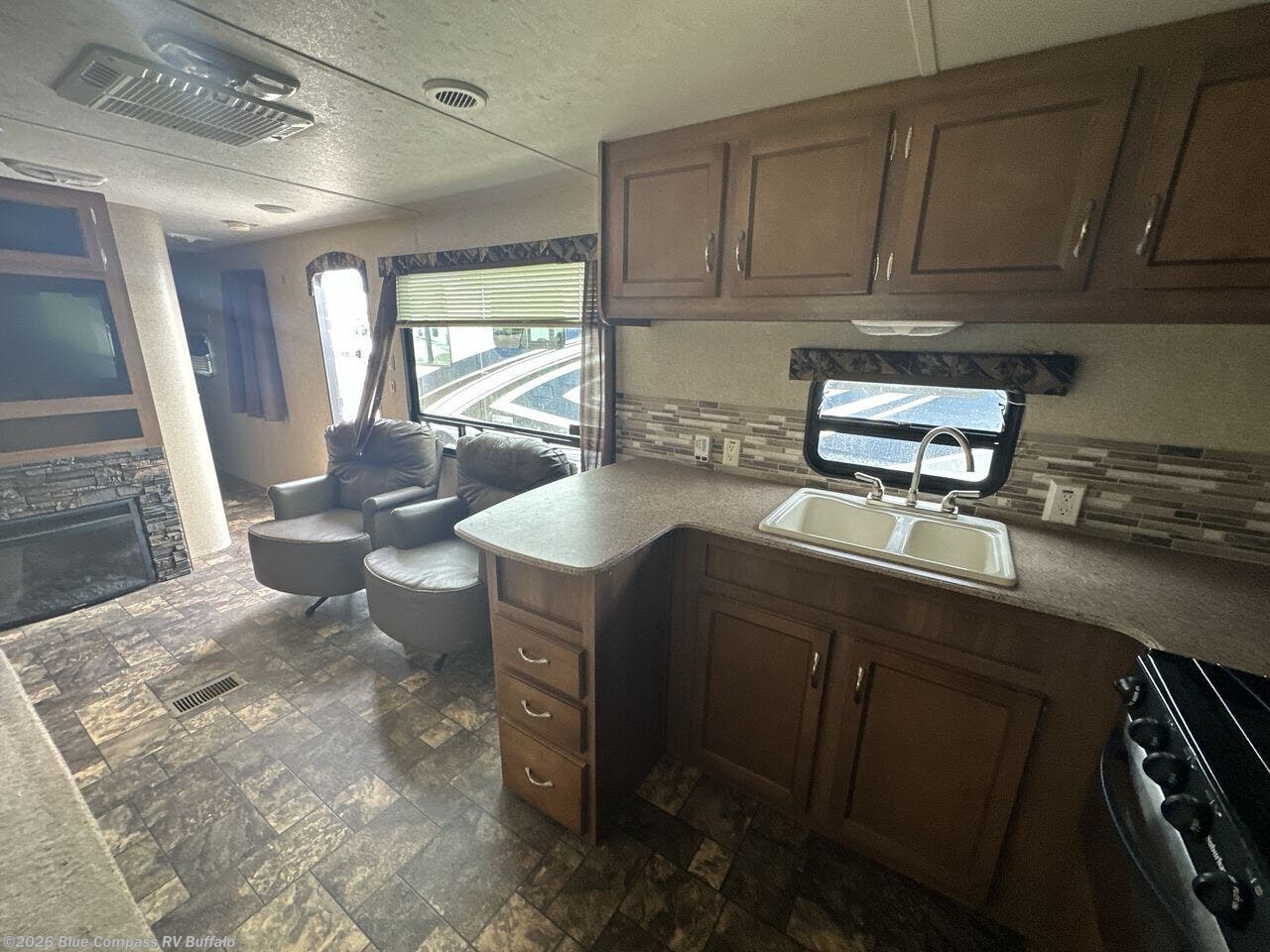 The rear kitchen is a notable feature of this Coachmen Catalina 293RKS travel trailer. There is also a large slide out for added space, plus you will enjoy the electric fireplace at the base of the TV entertainment center too!
