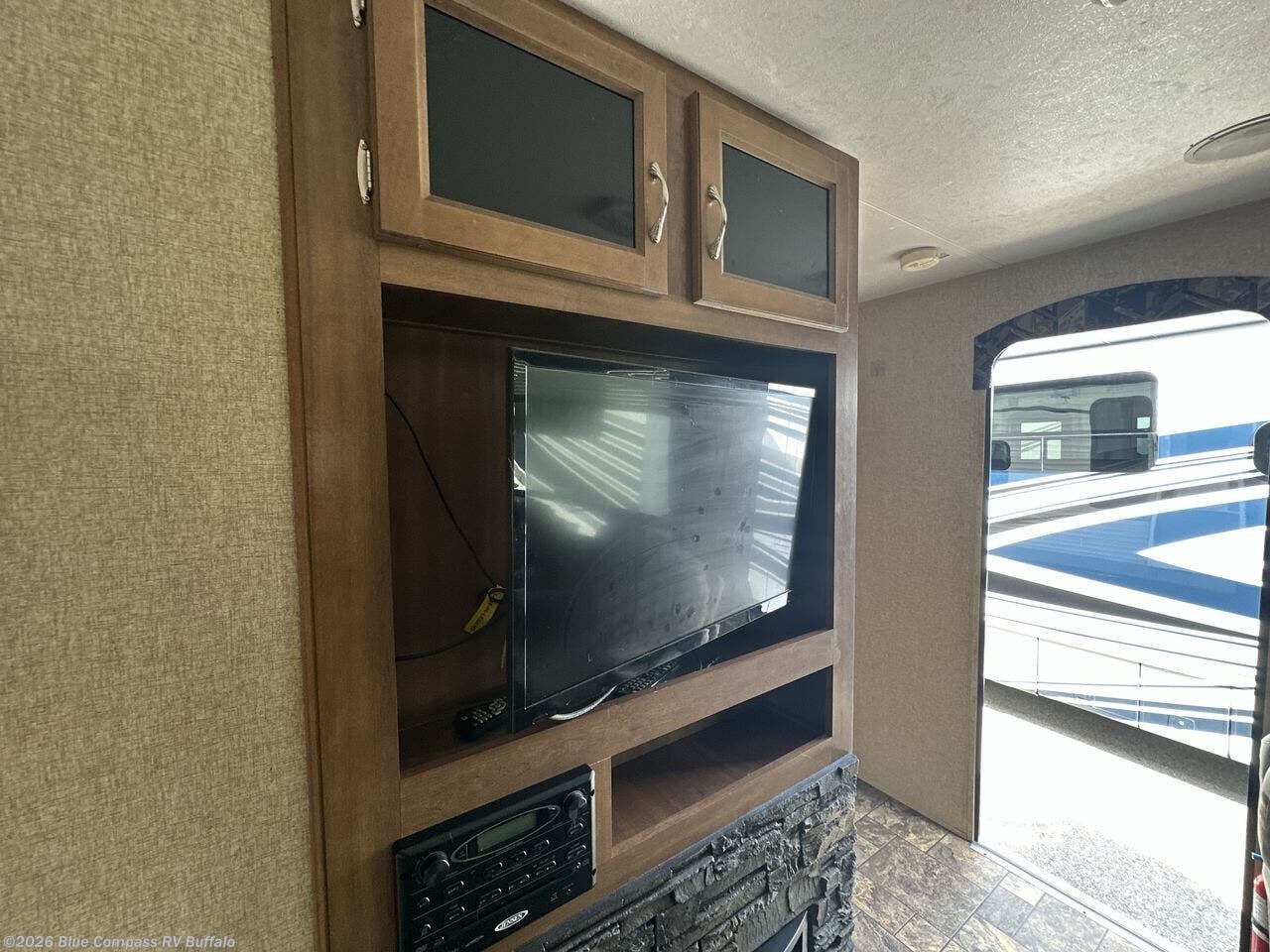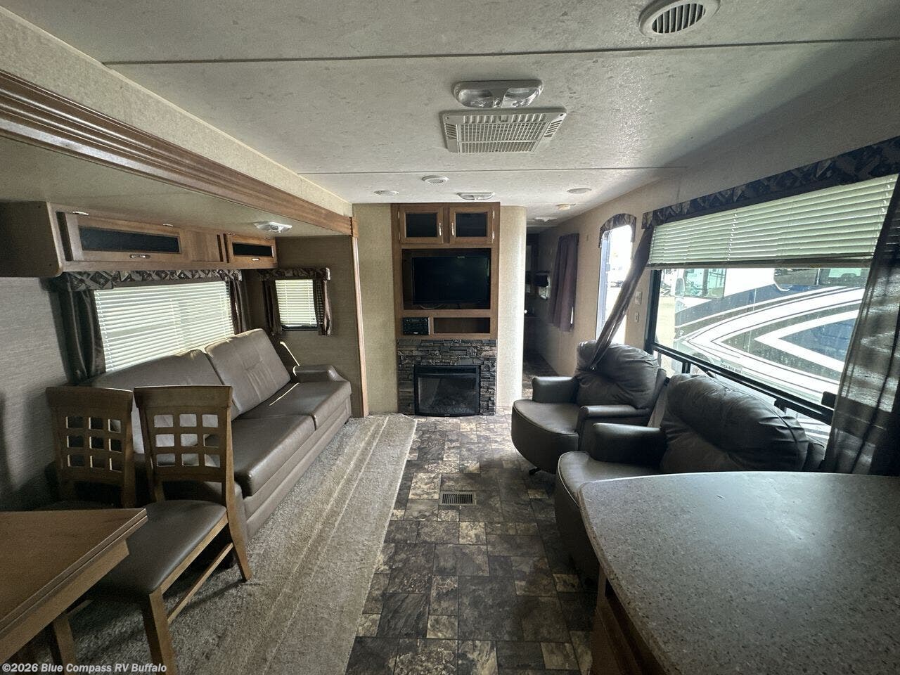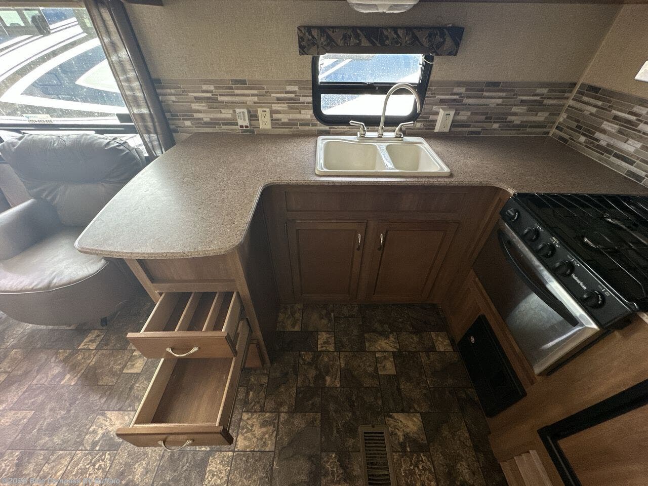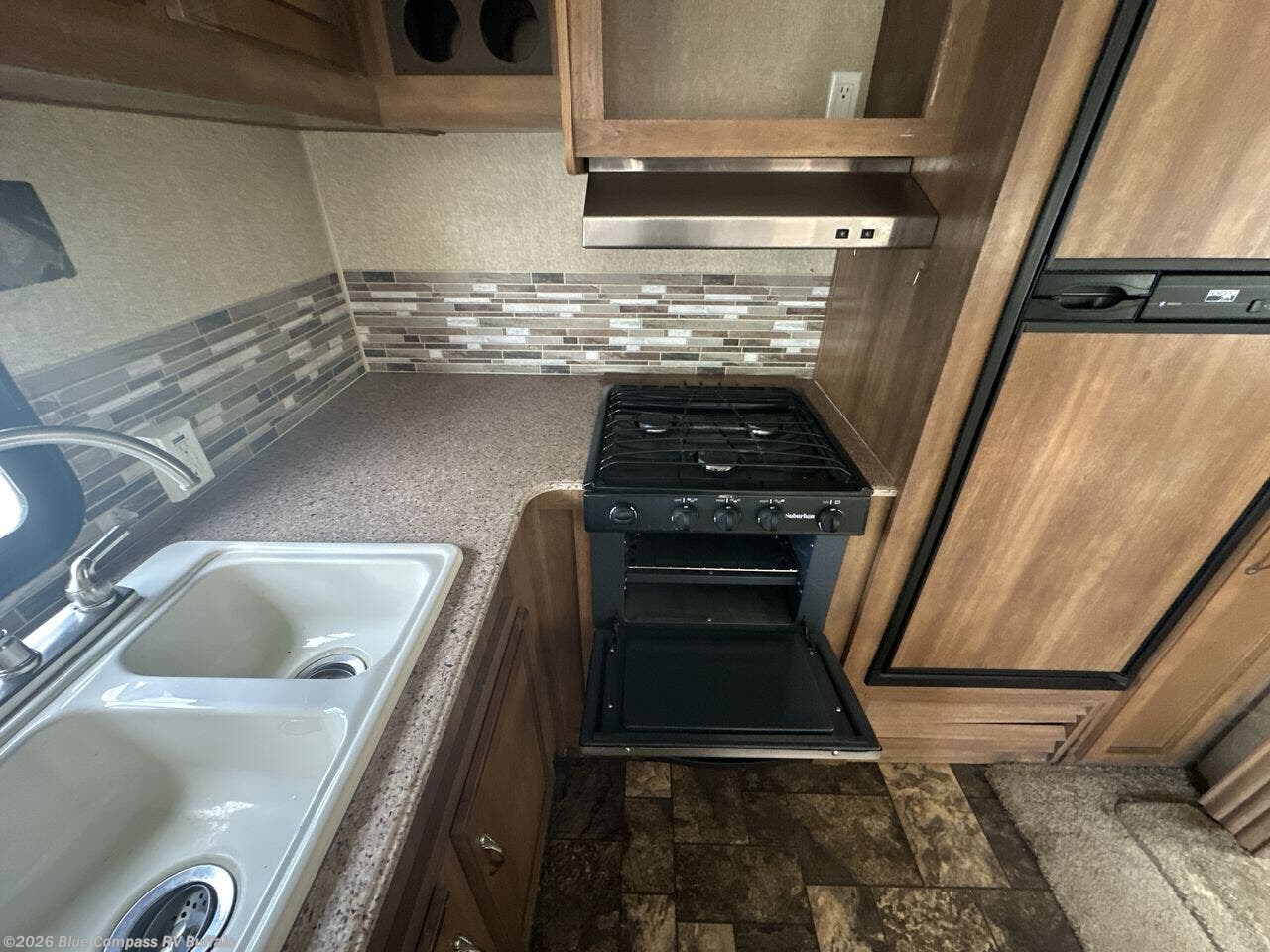 The rear kitchen is a notable feature of this Coachmen Catalina 293RKS travel trailer. There is also a large slide out for added space, plus you will enjoy the electric fireplace at the base of the TV entertainment center too!