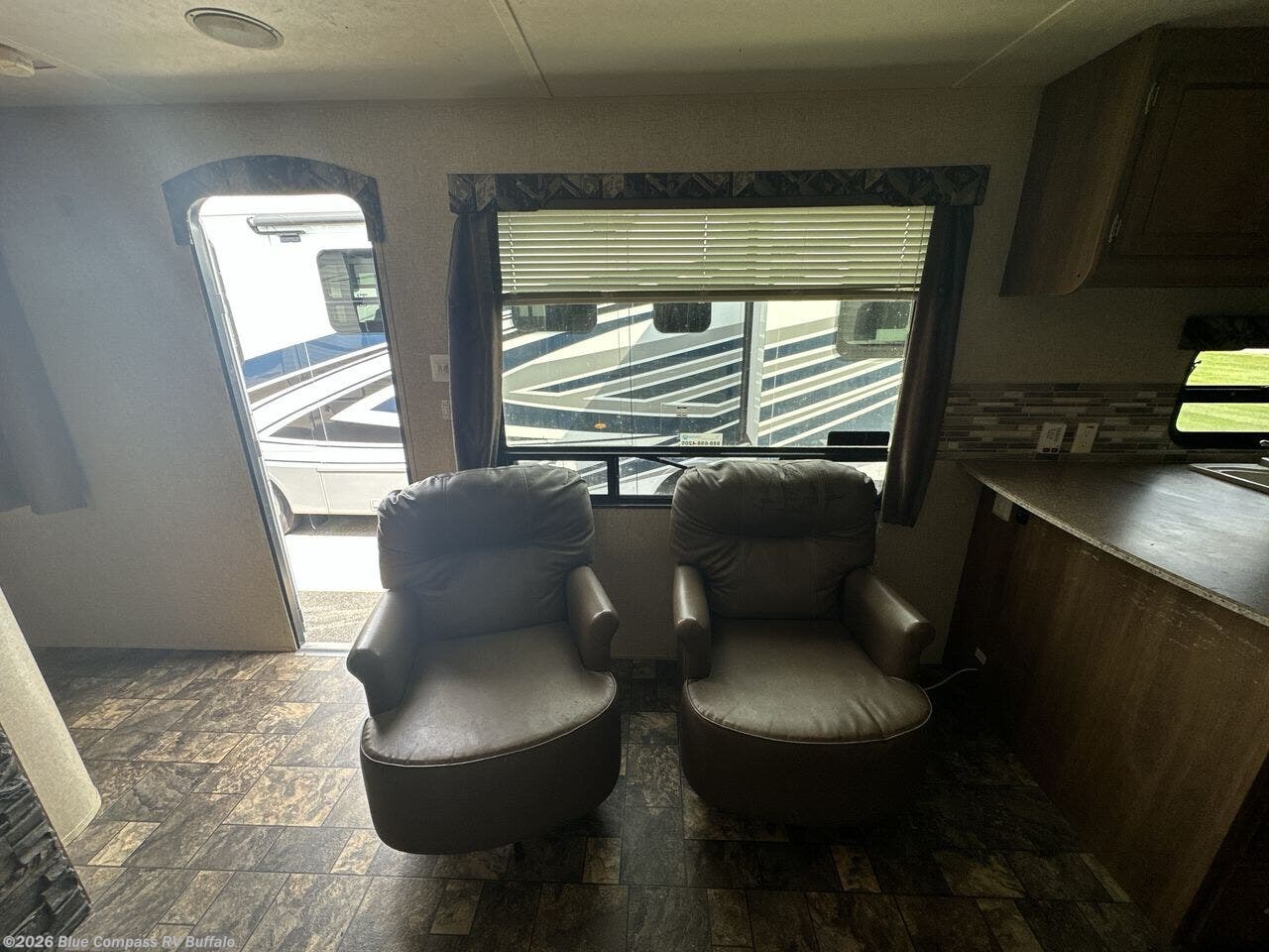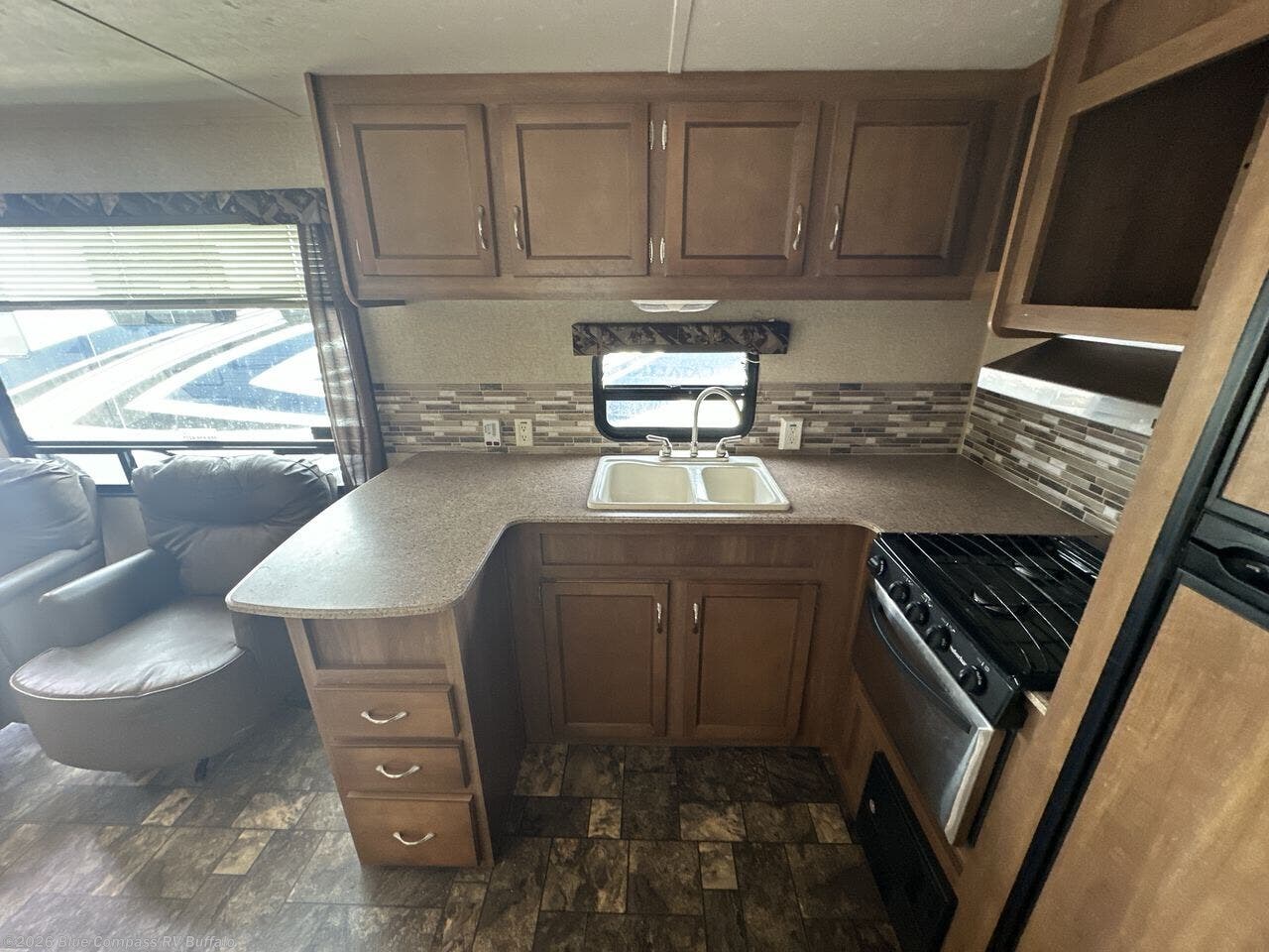 Step inside and enjoy the open concept feel created with the large slide out sofa and booth dinette. You can also choose the optional free standing dinette if you like. To the left of the door there are two lounge chairs, and the kitchen continues and wraps around the back providing everything you need to prepare and cook food.