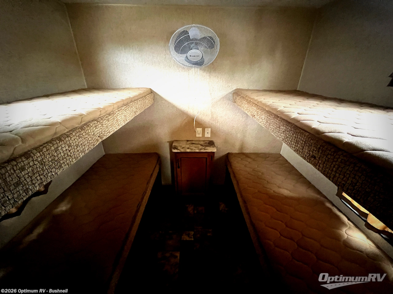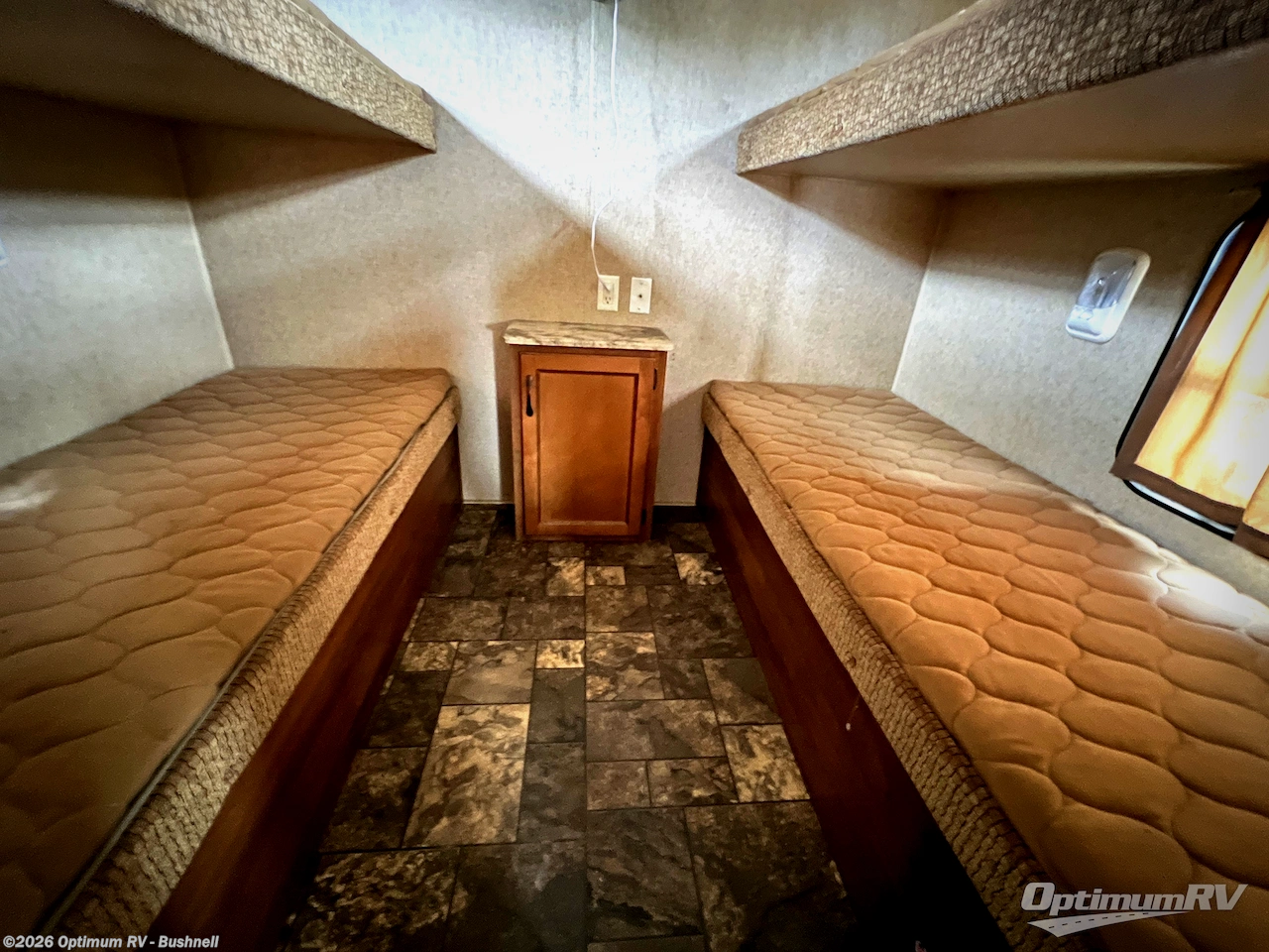 A sliding door leads into the rear bunk room which features wardrobe storage just inside the door on the right. There are two sets of bunks with an entertainment center between.
