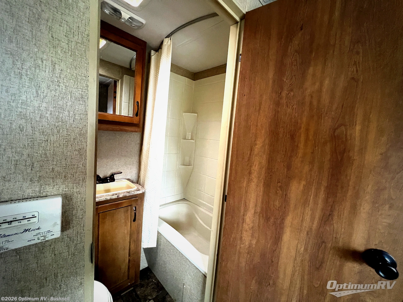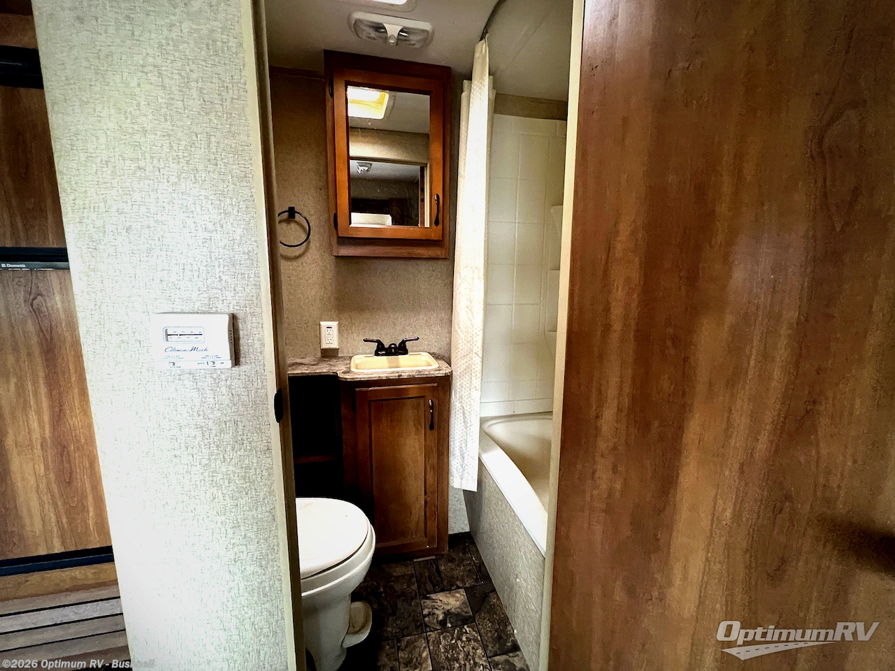 A convenient bath can be found just before the rear bunk room. The bath provides a full tub/shower, toilet, and vanity with sink.
