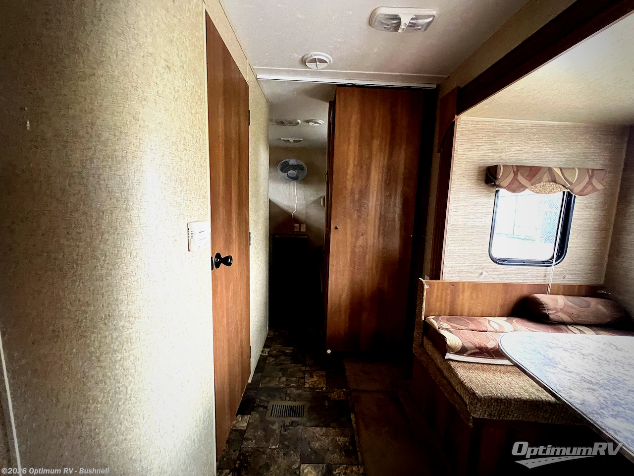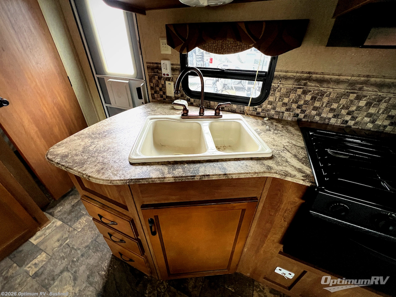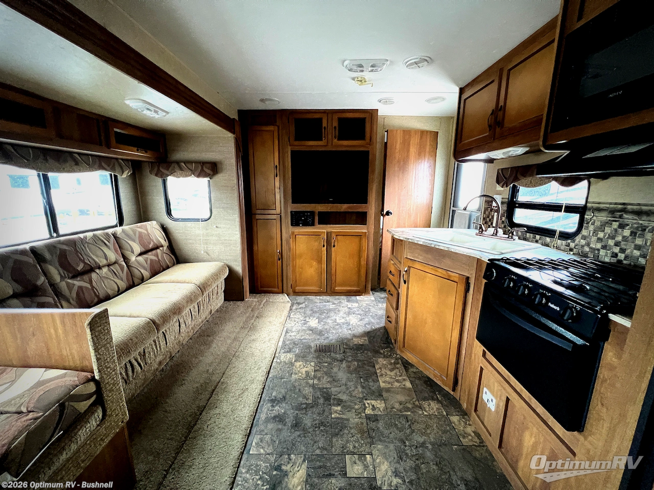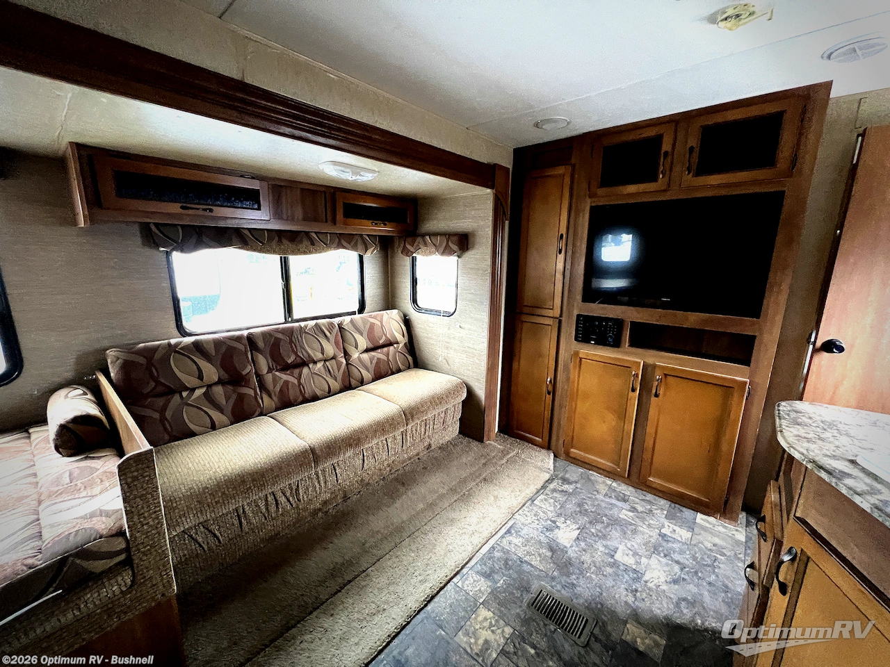 In the main living area you will enjoy plenty of floor space with the large slide out jackknife sofa and booth dinette fully extended. There is overhead storage above the sofa and both can be made into additional sleeping space at night. A nearby TV cabinet can easily be viewed from any of the seating in the room.