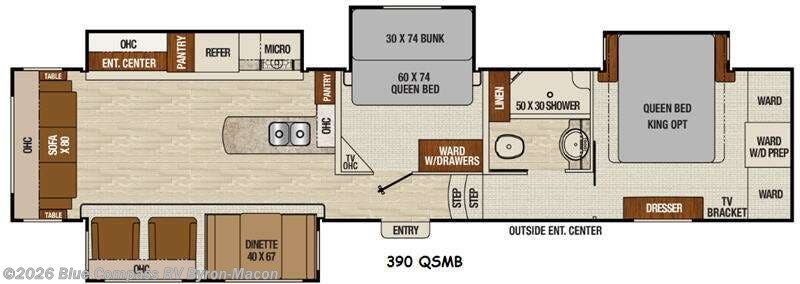 This Chaparral fifth wheel by Coachmen RV features quad slides, a rear living layout, and second bedroom/bunk room, plus more. Model 390QSMB is perfect for a larger family to enjoy.