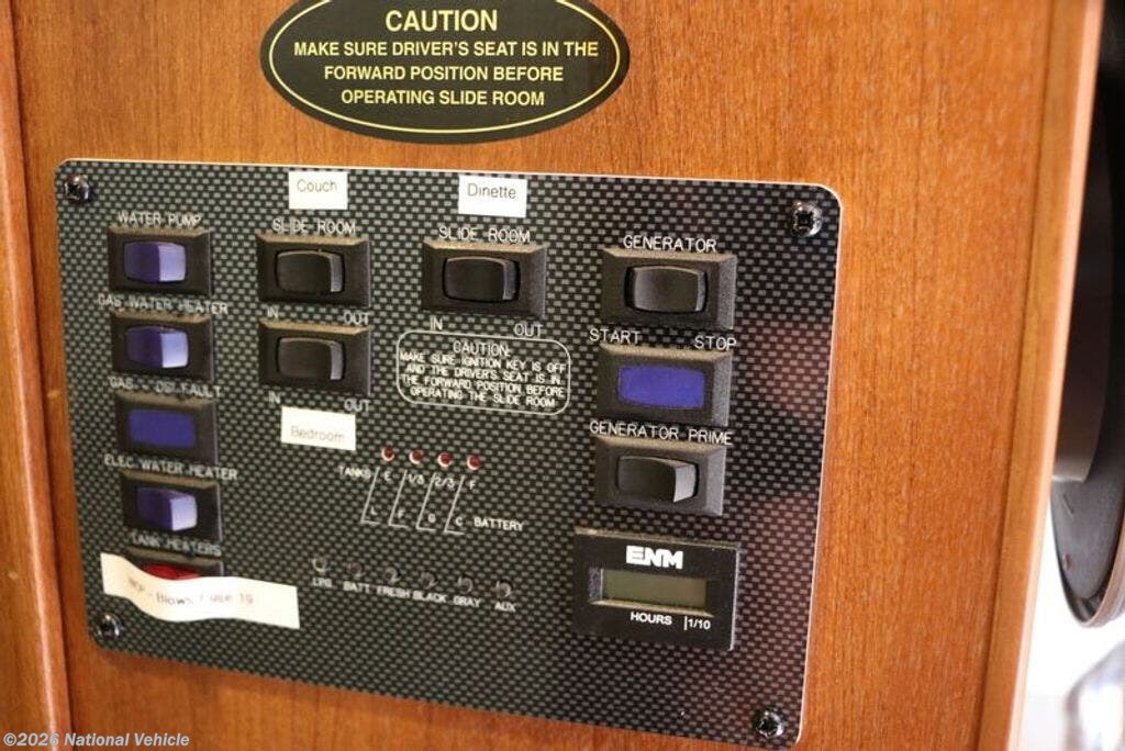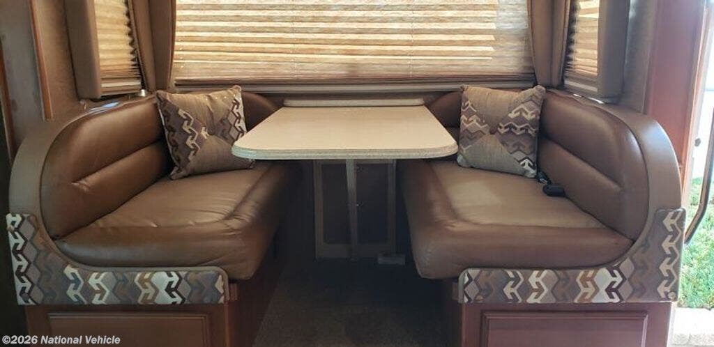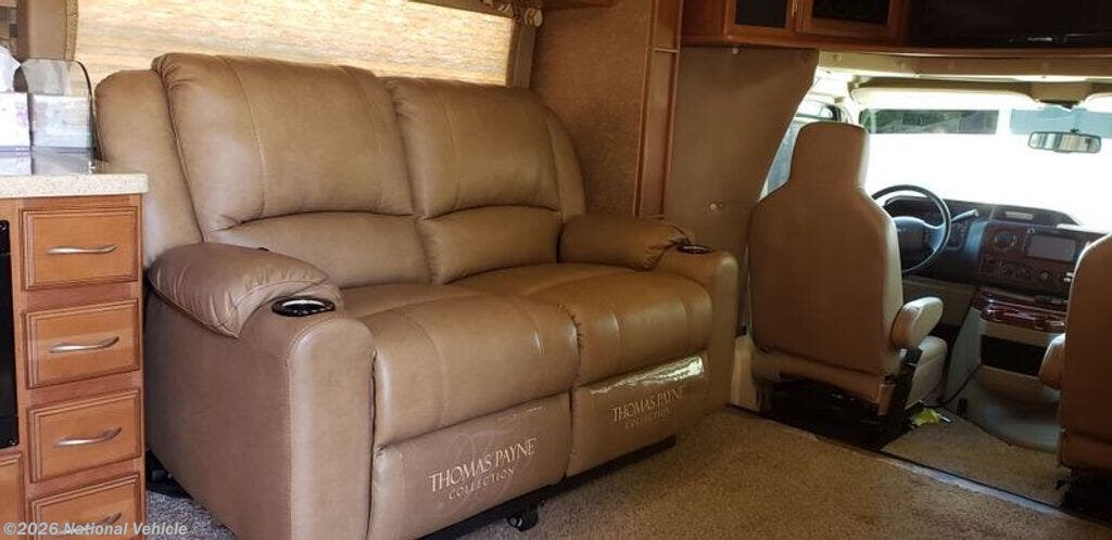 Step inside and find a wide open interior with dual opposing slides fully extended. There is a booth dinette slide to your immediate right as you enter. An entertainment center with 32" TV can be found above the cab area for your enjoyment, and a second slide out opposite the door features dual Thomas Payne recliners to relax on and enjoy along with a three burner range for cooking meals at.