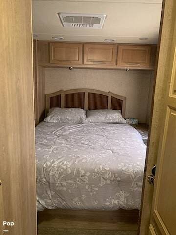The seller replaced the sleeper sofa with a theater recliner. The rear bedroom has a queen bed, nightstands, and plenty of storage. There's also a wardrobe closet.