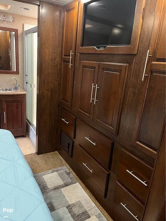 The back of the RV is the bedroom suite, which features a walk-around queen bed. Across from it is a large wardrobe closet and a TV.