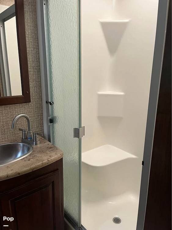 The rear bathroom features a spacious shower with a seat, a sink, and a toilet.