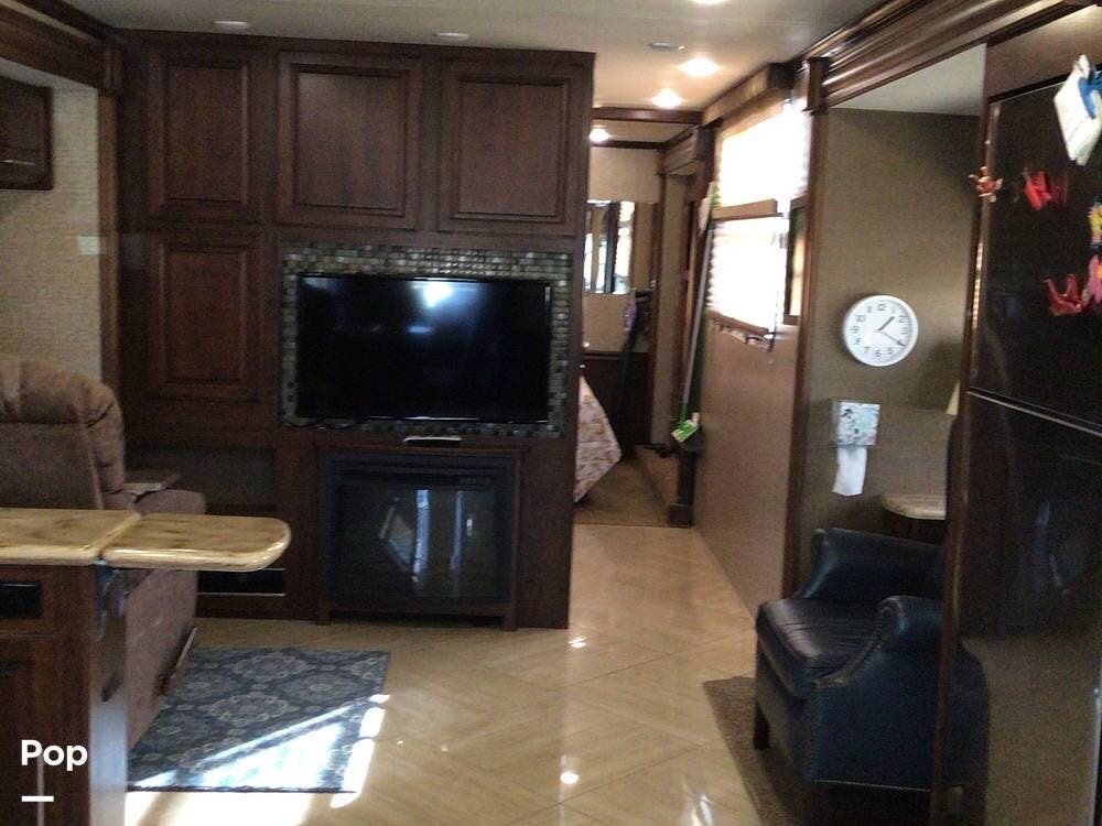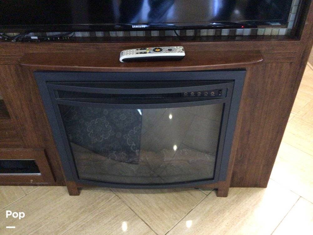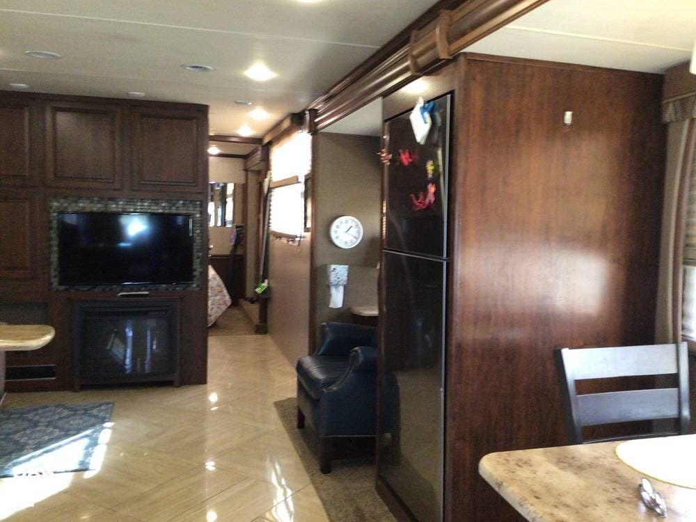 The triple slide-out floor plan creates a remarkably open living area, providing ample room for relaxation and entertaining. An electric fireplace with a large HDTV contributes to a "homey" and comfortable atmosphere.