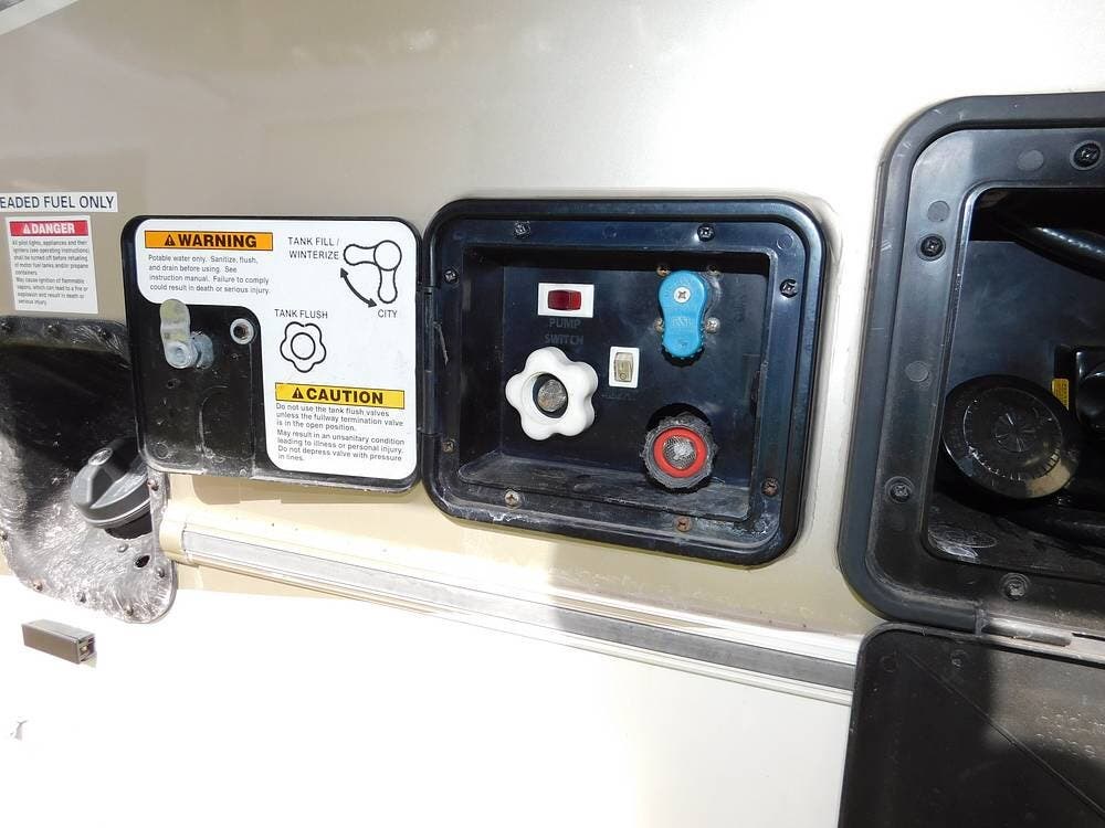 Updated tires, batteries, awning, faucets and upholstery! Exterior camp kitchen and entertainment center! Low miles! Full body paint! Dual recliners!