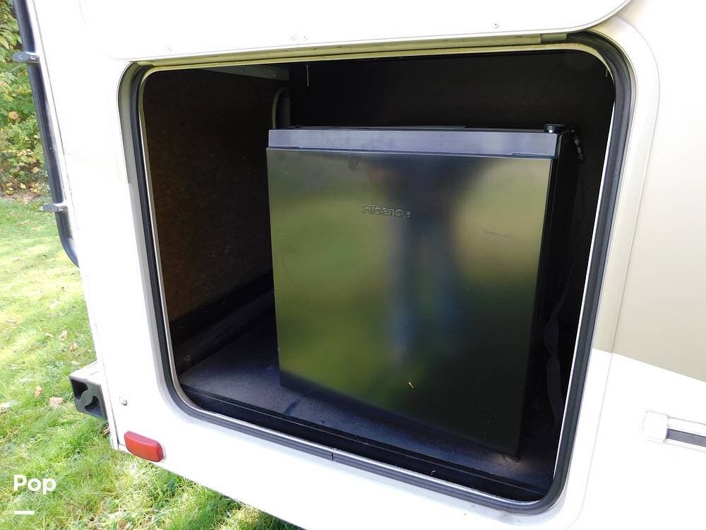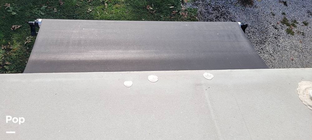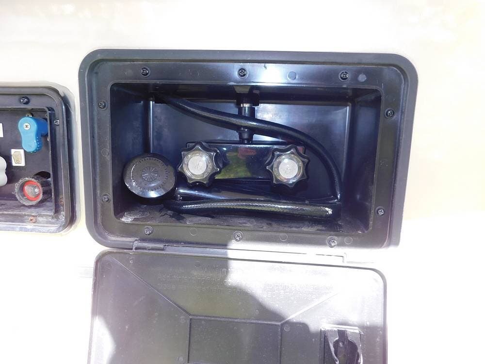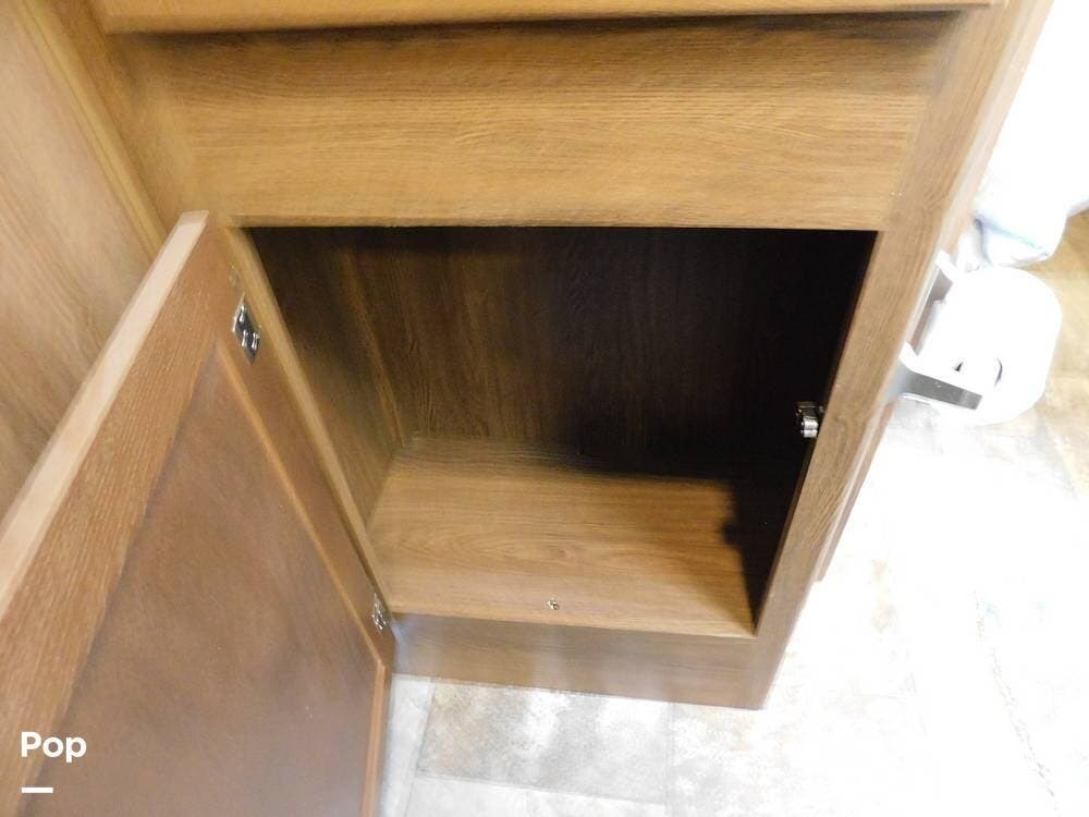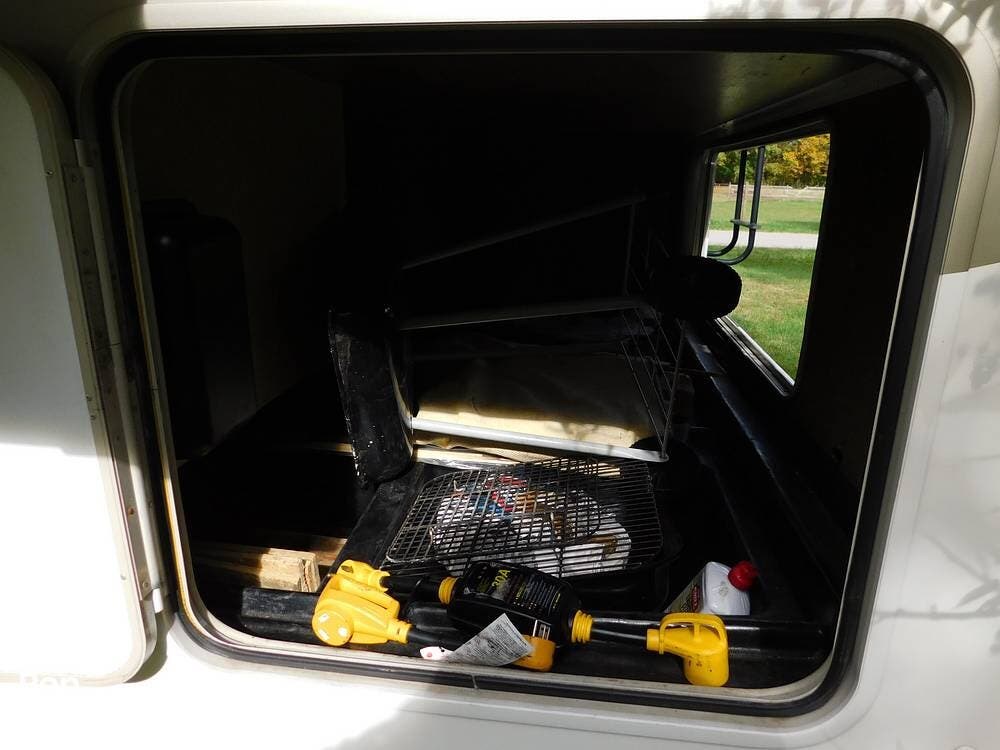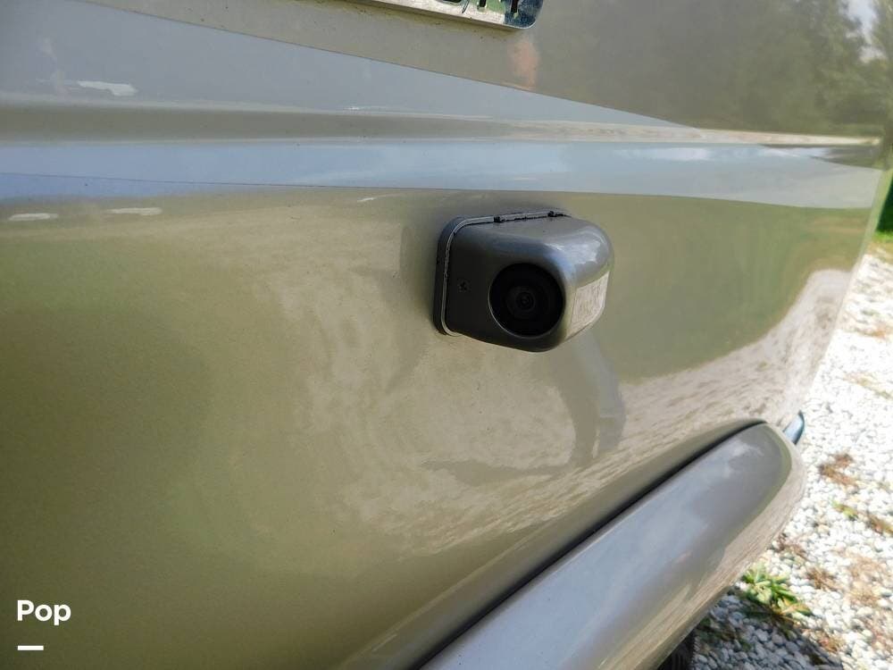 and plenty of storage compartments for outdoor gear, camping equipment, or other essentials. It also has an electric patio awning, providing shade and shelter for outdoor relaxation. Additional exterior features include a rear ladder, backup camera, and optional outdoor shower.