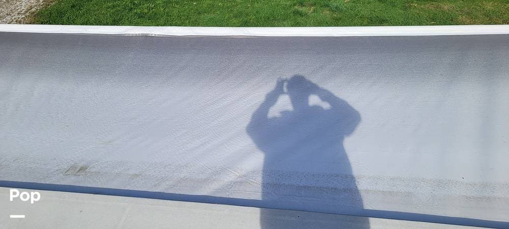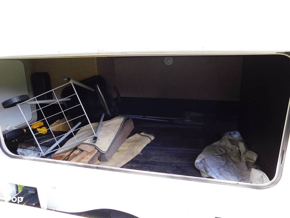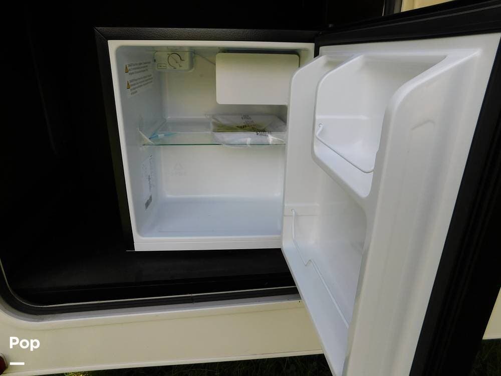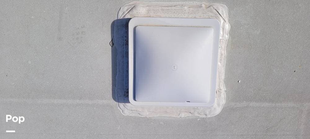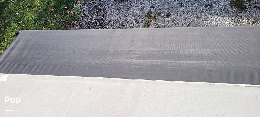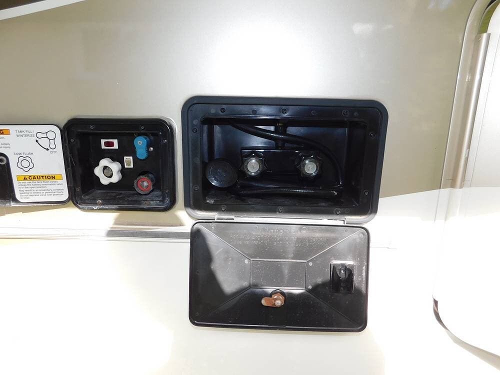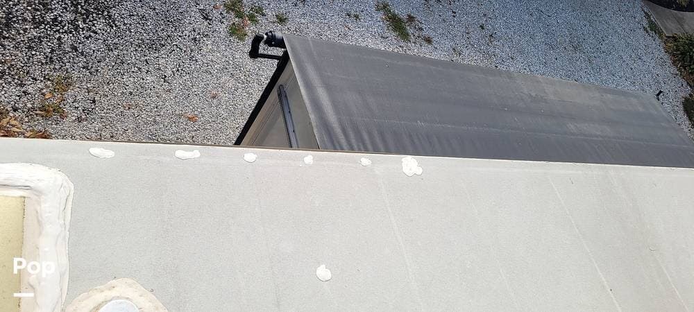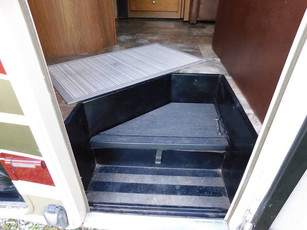 and plenty of storage compartments for outdoor gear, camping equipment, or other essentials. It also has an electric patio awning, providing shade and shelter for outdoor relaxation. Additional exterior features include a rear ladder, backup camera, and optional outdoor shower.