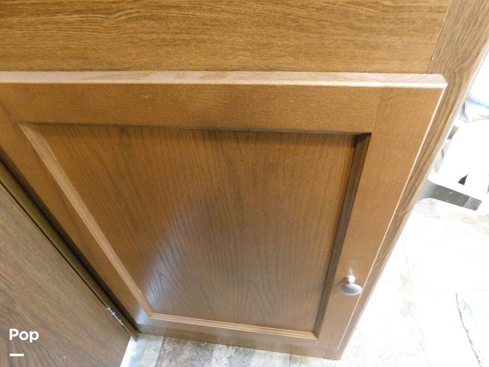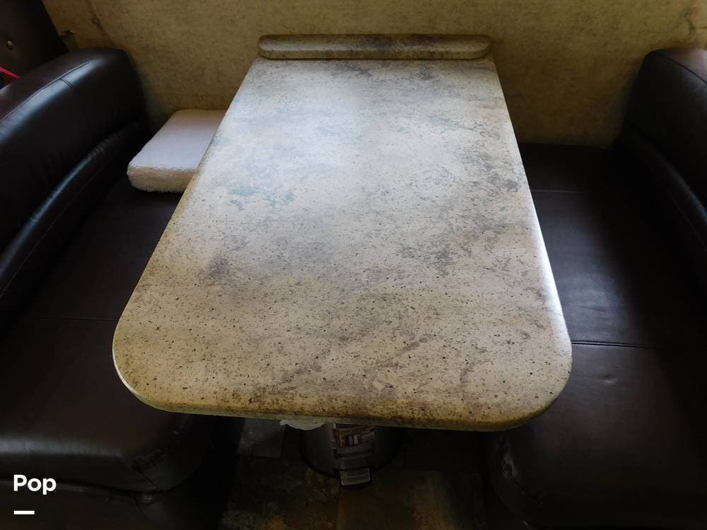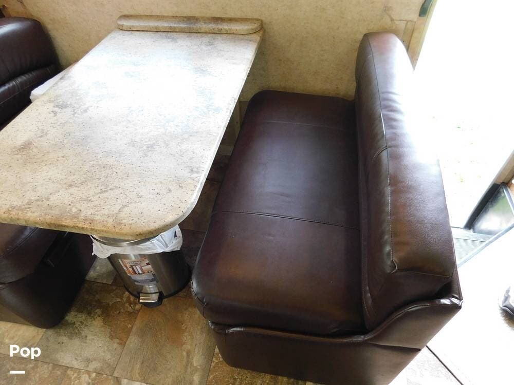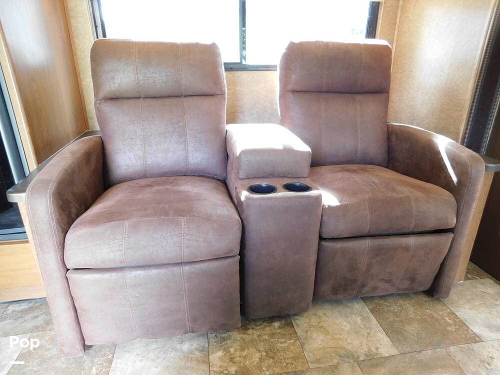 Stepping inside, you'll find a well-appointed living area designed for relaxation and entertainment. The main living space features a slide-out that expands to create a roomy environment. The interior decor features warm wood cabinetry, updated upholstery, and energy-efficient LED lighting throughout. The living area includes theatre seating with a seat belt and a dinette with updated upholstery.