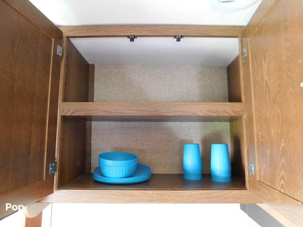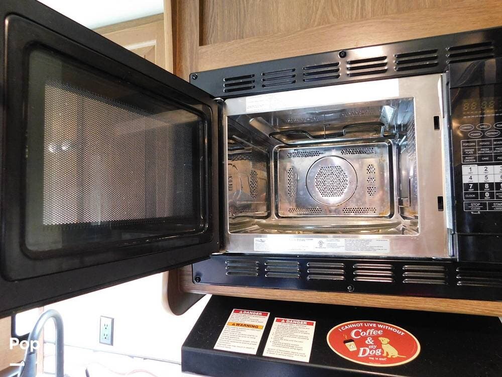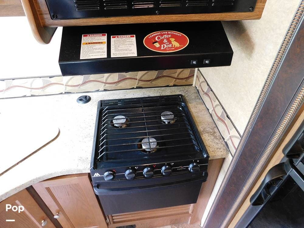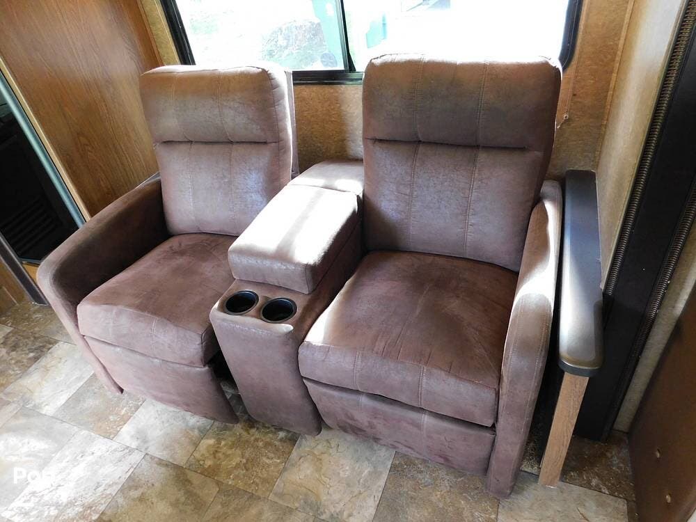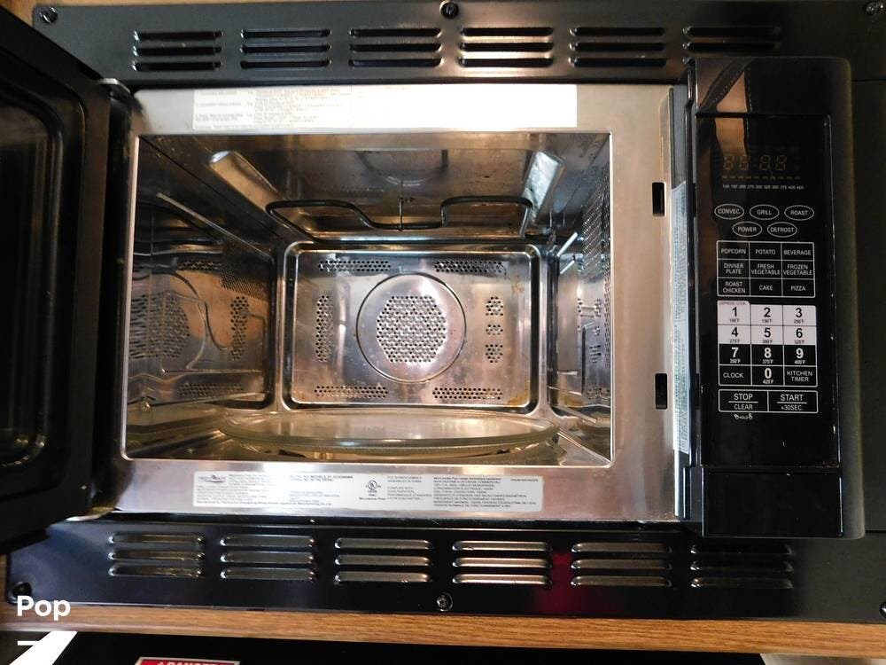 Stepping inside, you'll find a well-appointed living area designed for relaxation and entertainment. The main living space features a slide-out that expands to create a roomy environment. The interior decor features warm wood cabinetry, updated upholstery, and energy-efficient LED lighting throughout. The living area includes theatre seating with a seat belt and a dinette with updated upholstery.