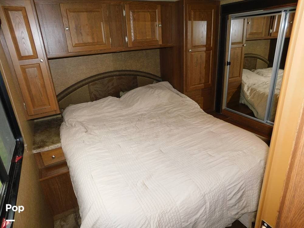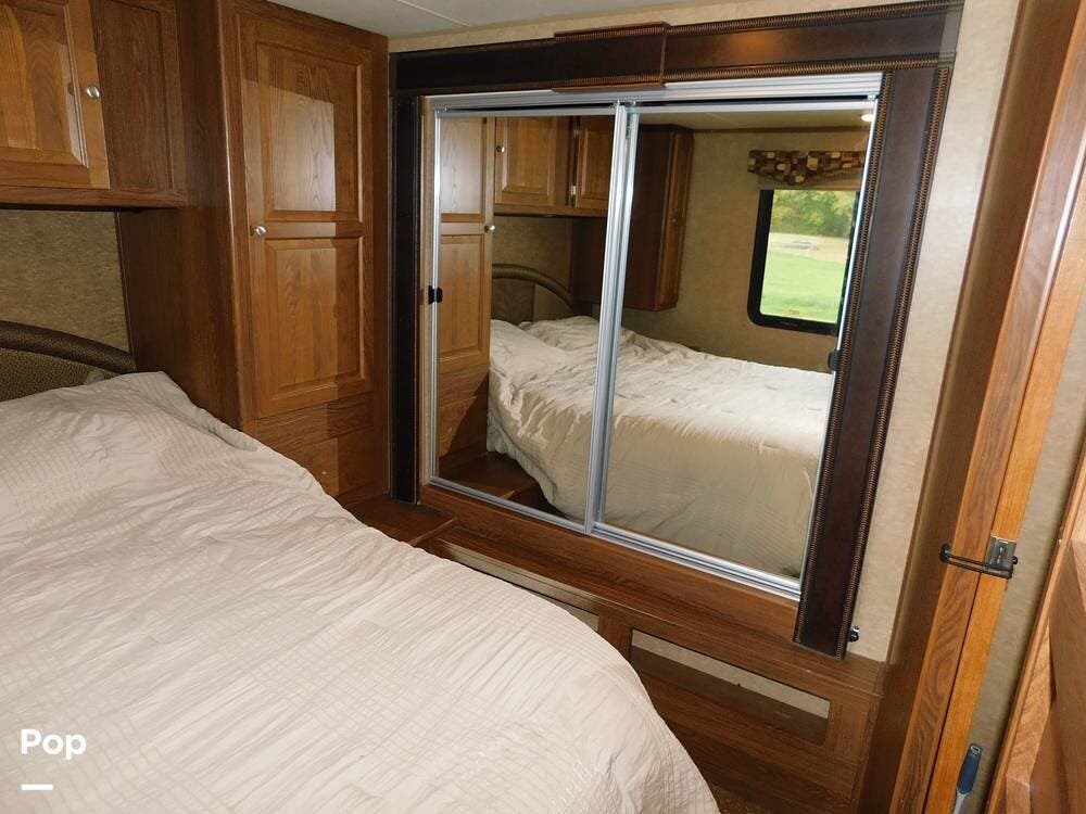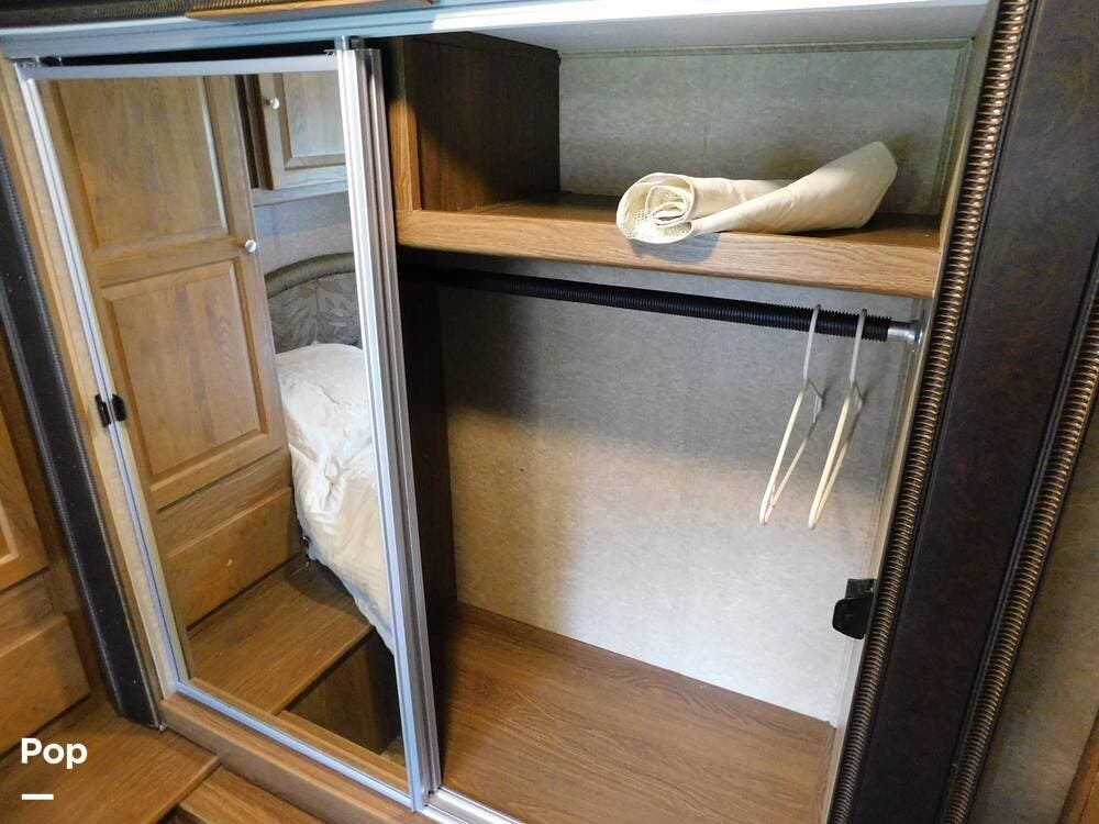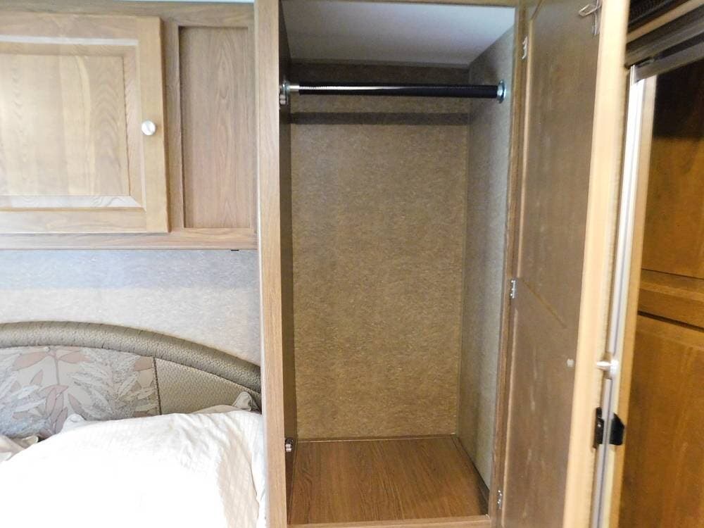 At the rear of the motorhome, the bedroom offers a queen-sized bed, flanked by wardrobe closets and overhead storage. The bedroom has a large window on one side and a mirrored slider closet on the other.