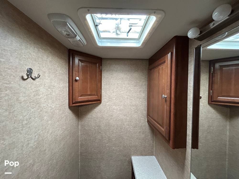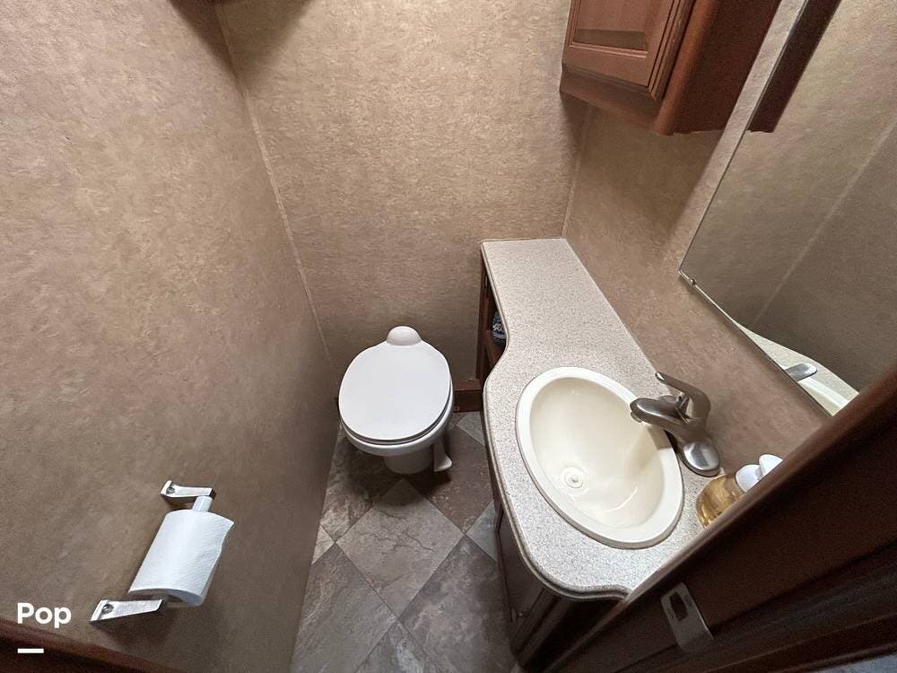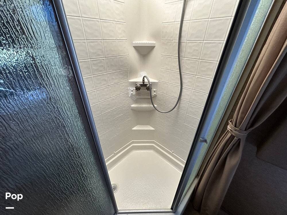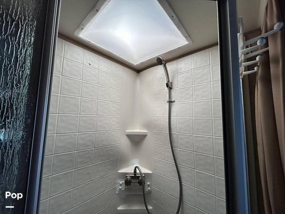 The split bathroom layout enhances convenience, with a shower on one side and a separate toilet and vanity on the other, allowing more than one person to use the facilities at once. A six-gallon gas/electric water heater ensures reliable hot water for everyone.